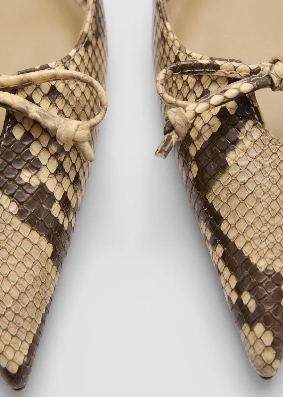 Fason z odkrytą piętą. Efekt skóry. Spiczaste zakończenie. Obcas typu kitten. Obcas mierzy 4 cm. Ozdobna kokardka. Bez zapięcia. Elastyczny pasek.