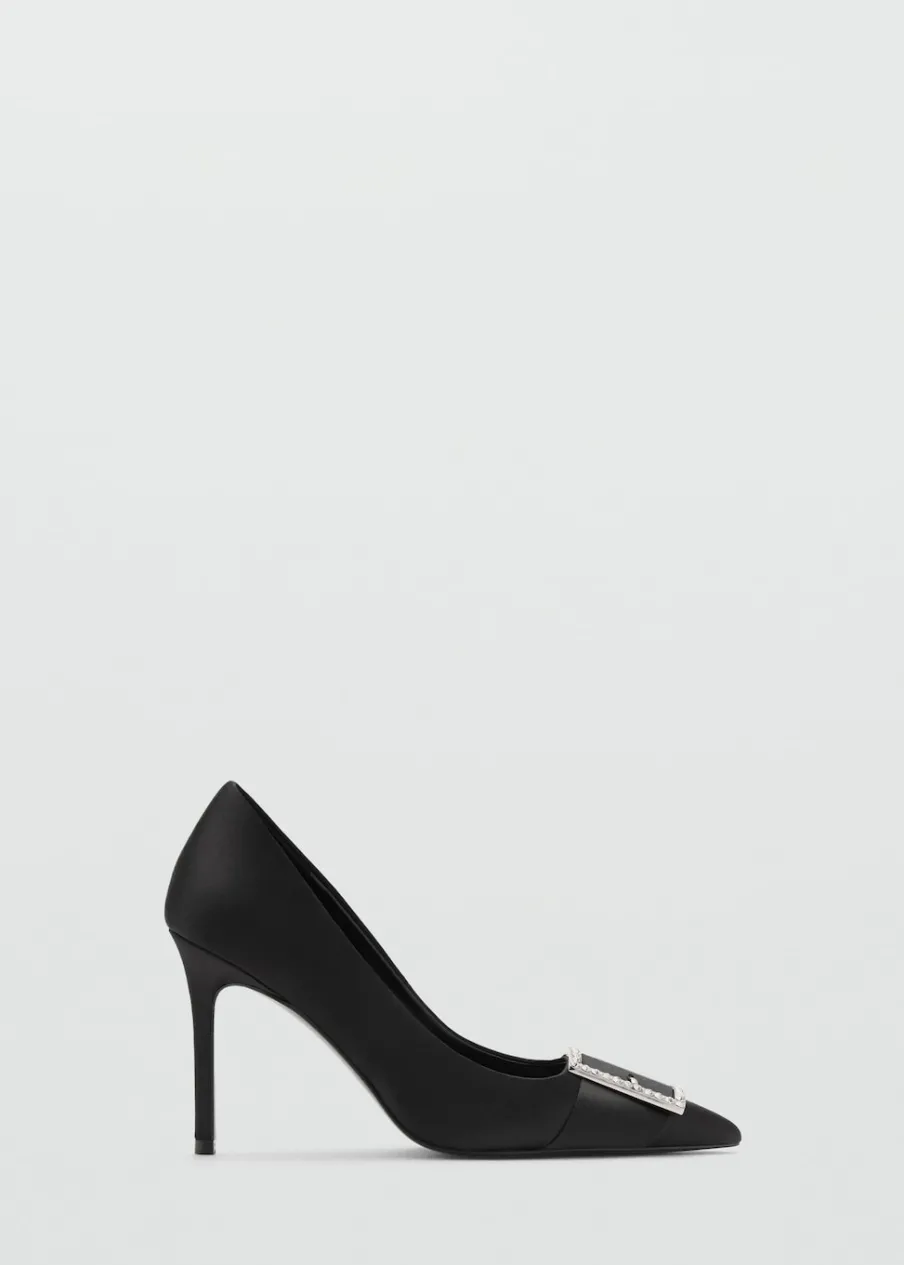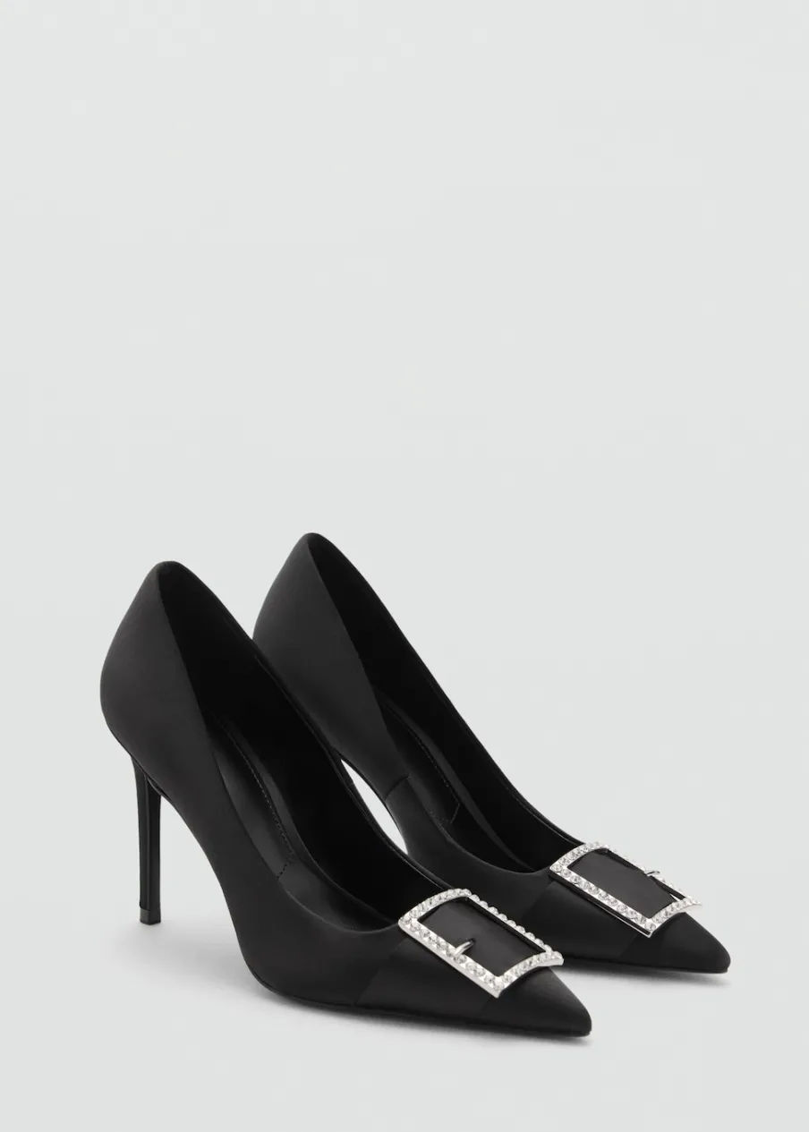 Ozdobna klamra. Ozdoba z kryształków strass. Obcas szpilka. Spiczaste zakończenie. Kolekcja wizytowa. Obcas mierzy 9,5 cm.