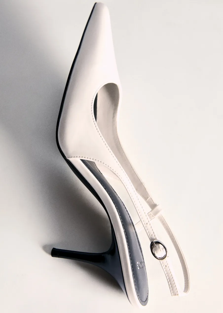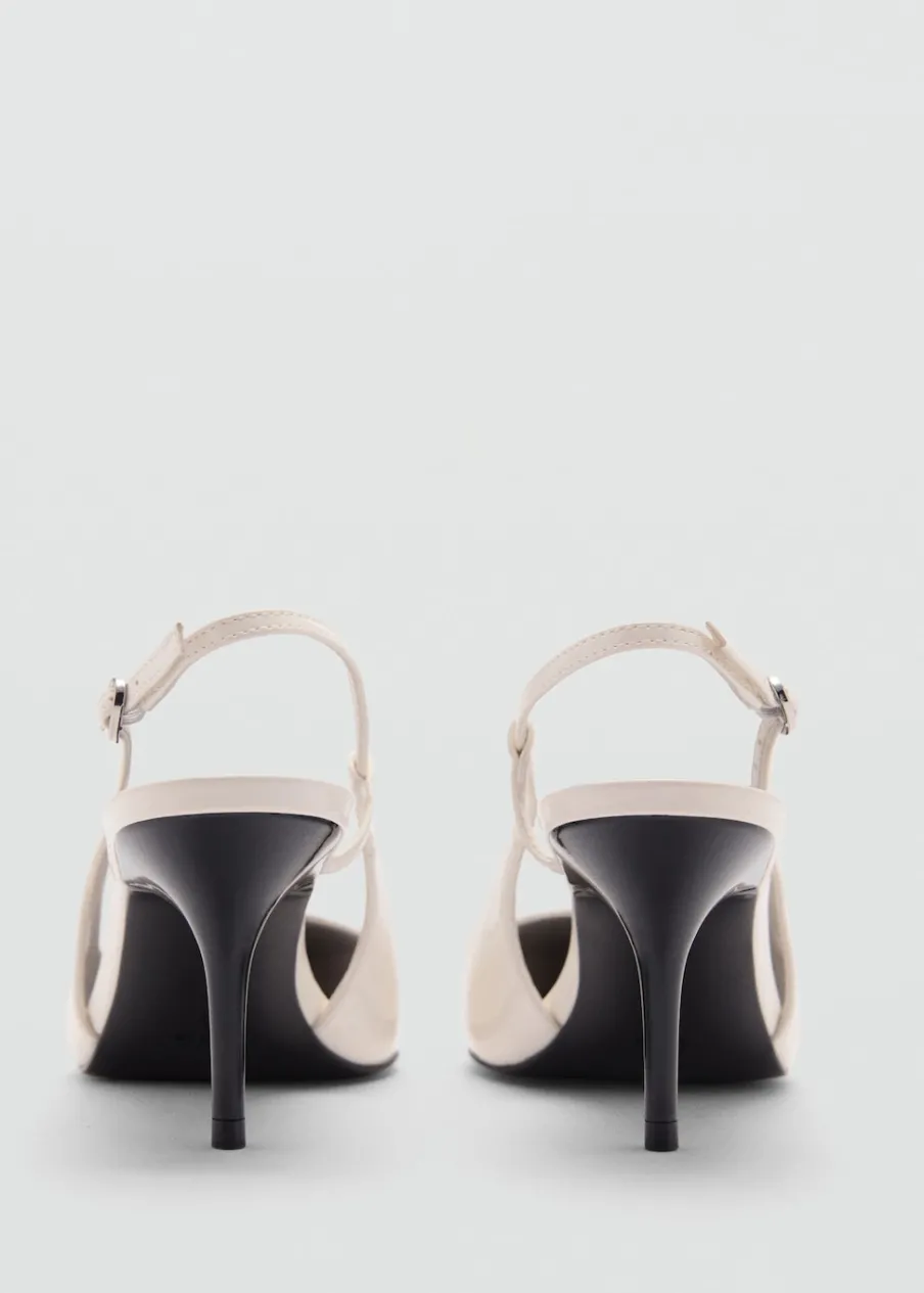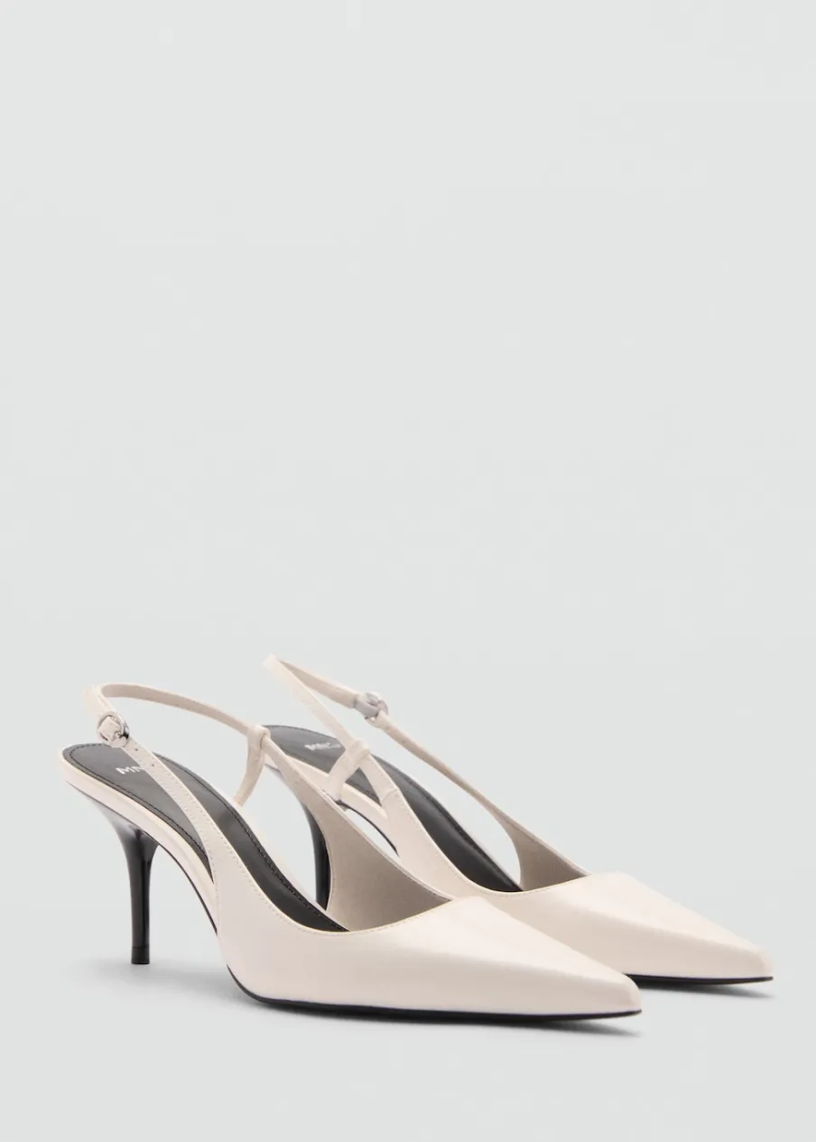 Fason z odkrytą piętą. Obcas szpilka. Spiczaste zakończenie. Zapięcie na klamrę. Obcas mierzy 7,5 cm. Wysoki obcas.