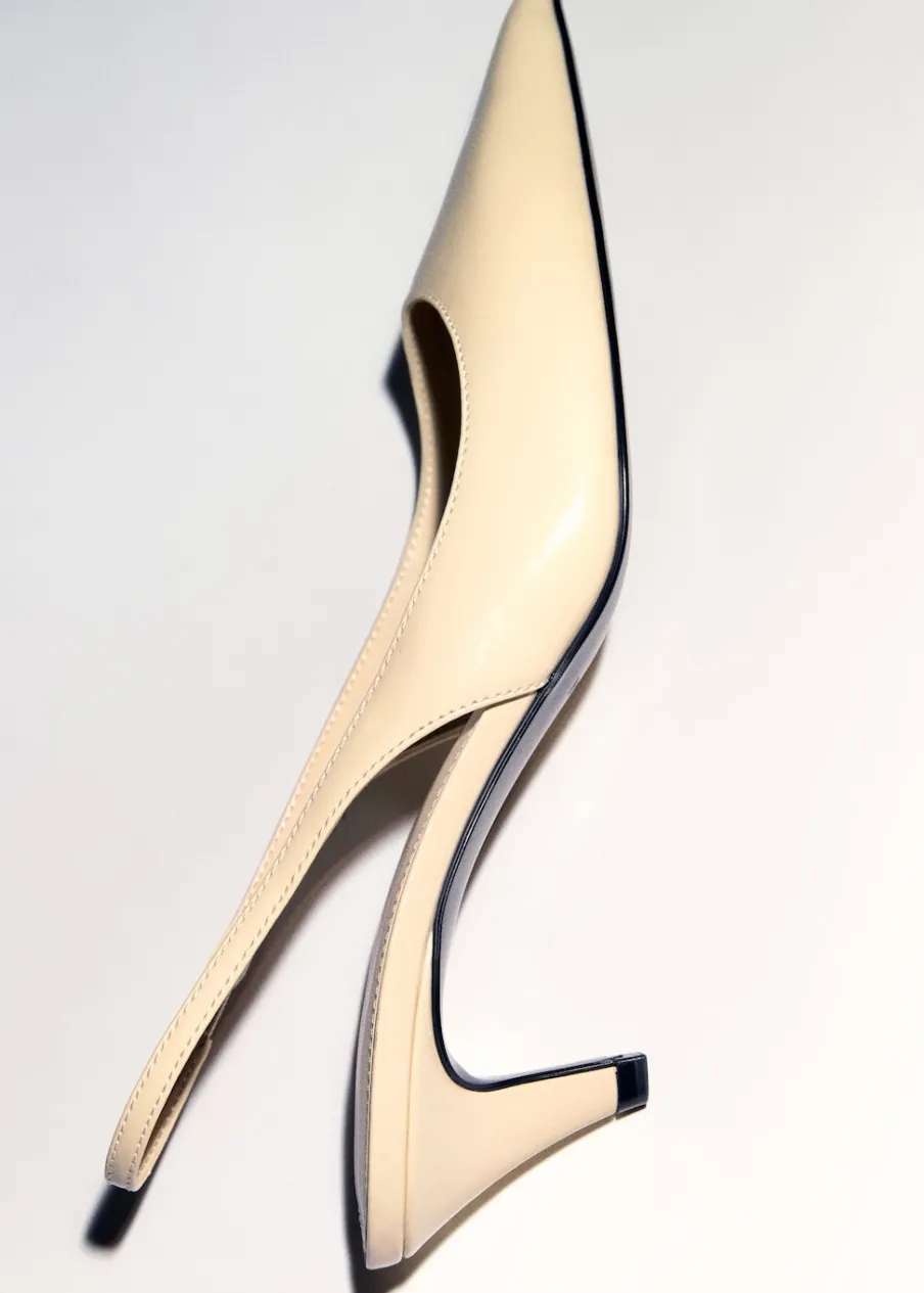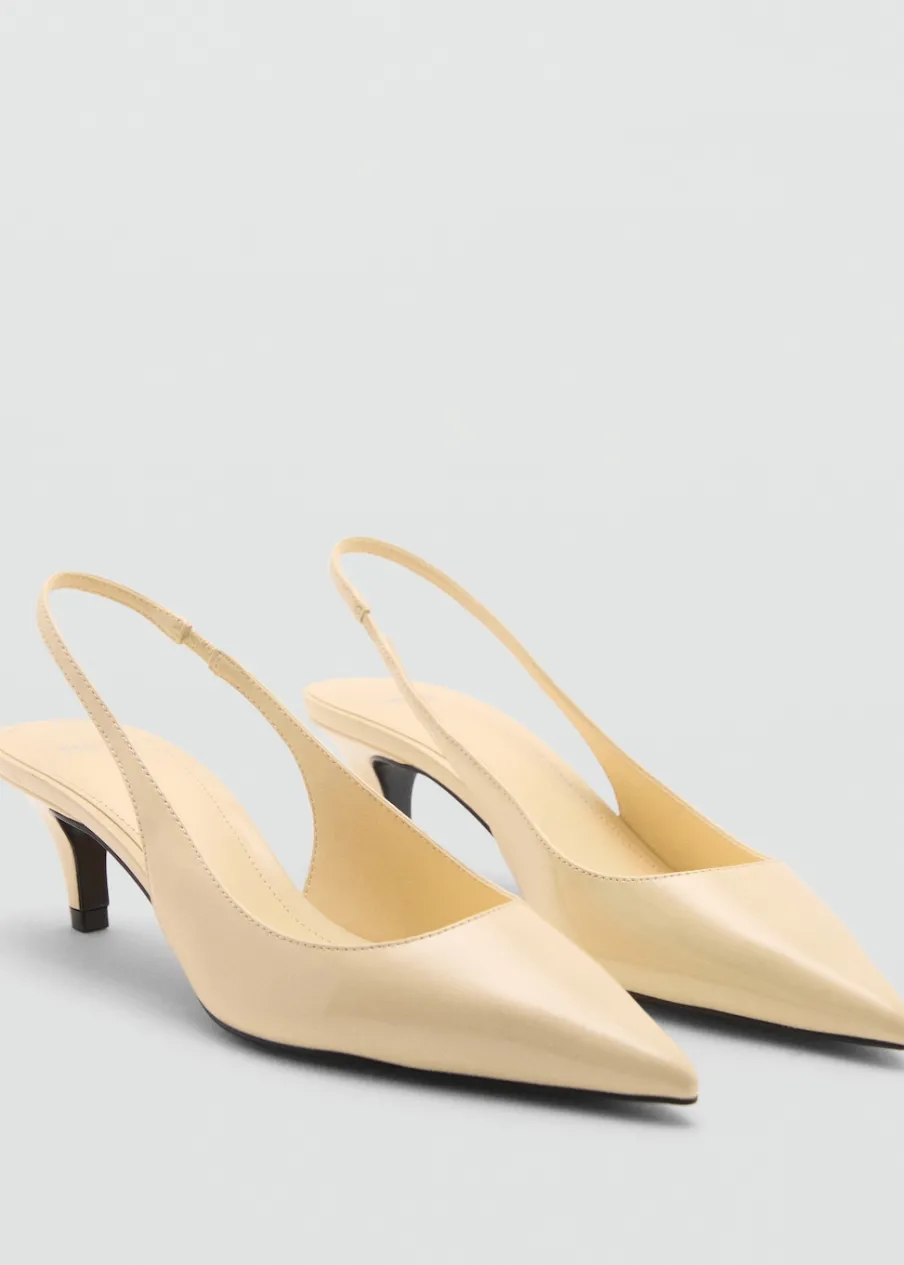 Efekt skóry. Fason z odkrytą piętą. Spiczaste zakończenie. Obcas typu kitten. Obcas mierzy 5,5 cm. Bez zapięcia.