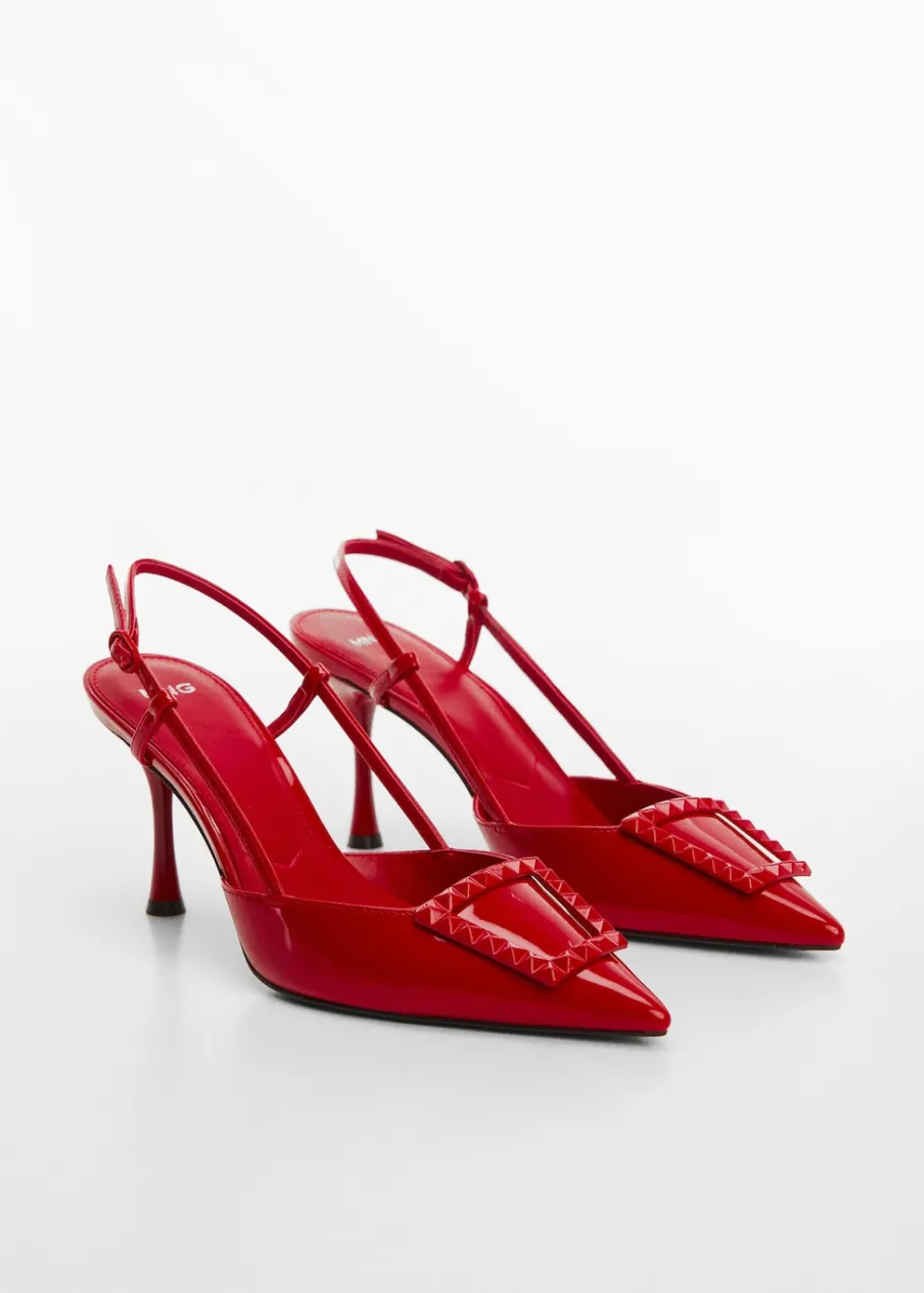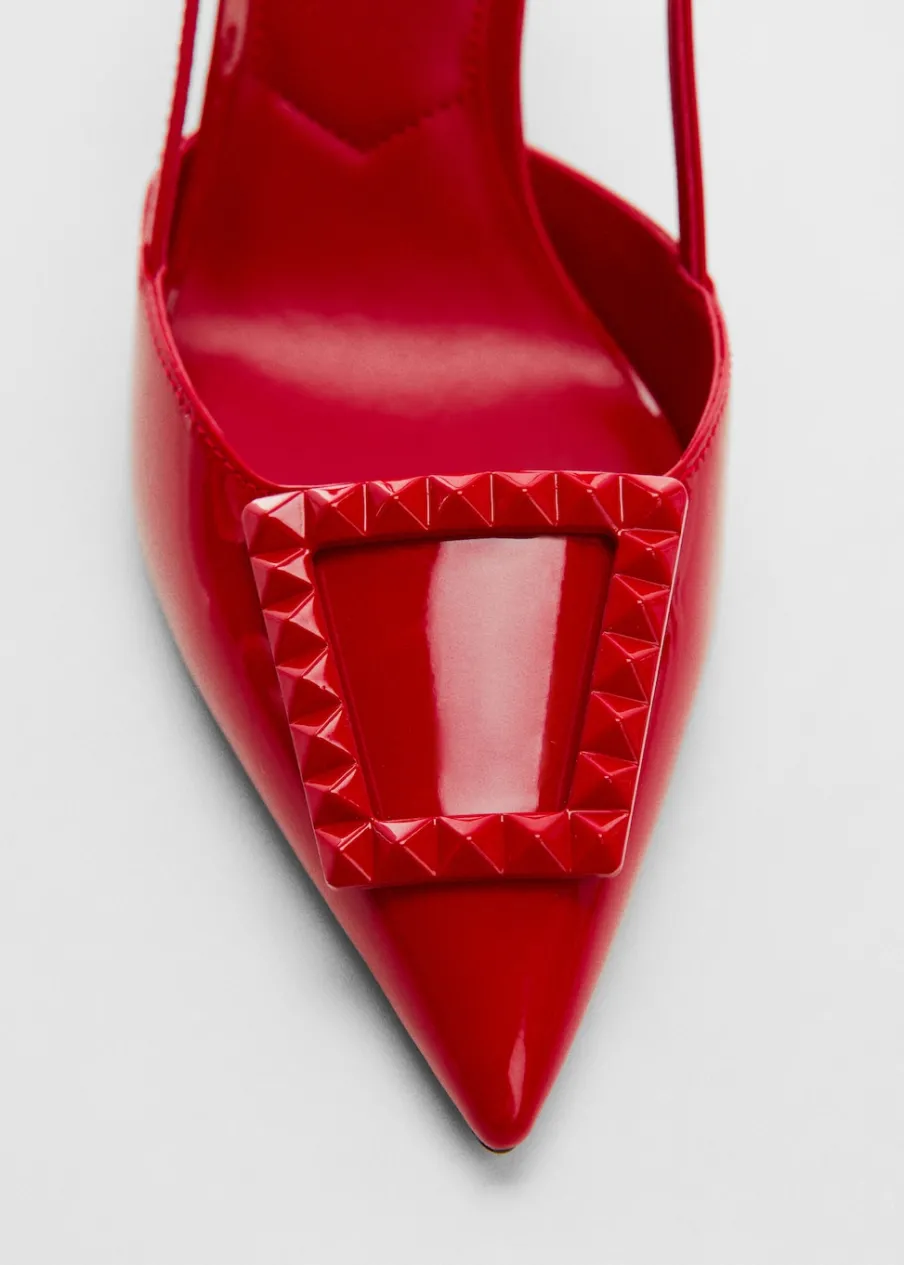 Obcas szpilka. Spiczaste zakończenie. Bez pięt. Zapięcie na klamrę. Ozdobna klamra. Wewnętrzna podszewka. Obcas mierzy 8 cm. Kolekcja wizytowa. Wysoki obcas.