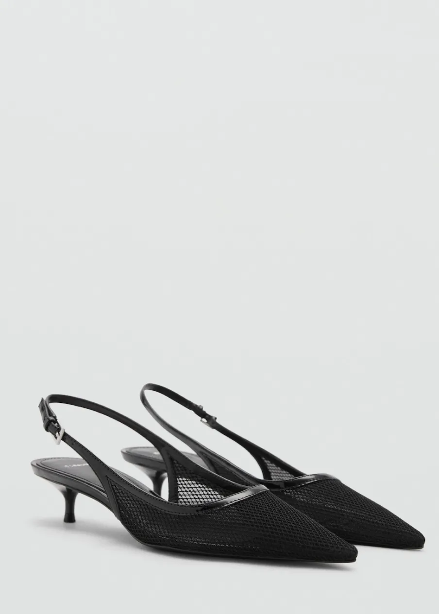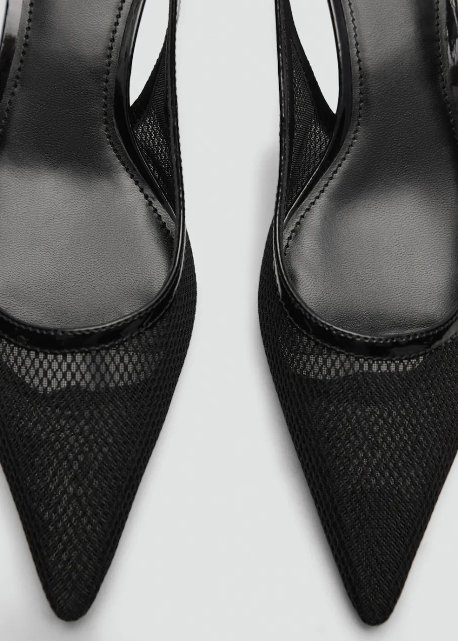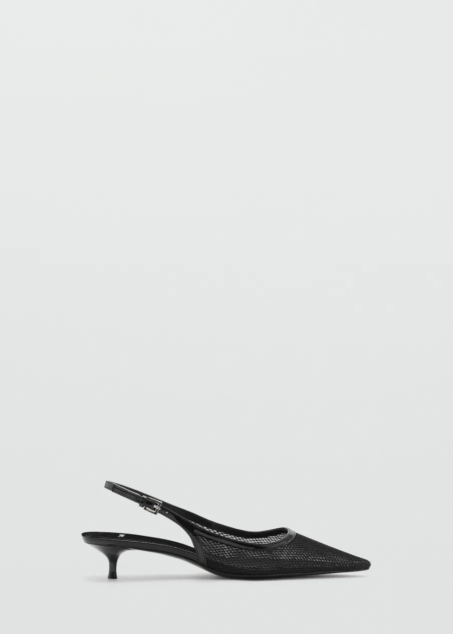 Siateczkowa tkanina. Fason z odkrytą piętą. Spiczaste zakończenie. Obcas typu kitten. Obcas mierzy 3,5 cm. Zapięcie na klamrę.