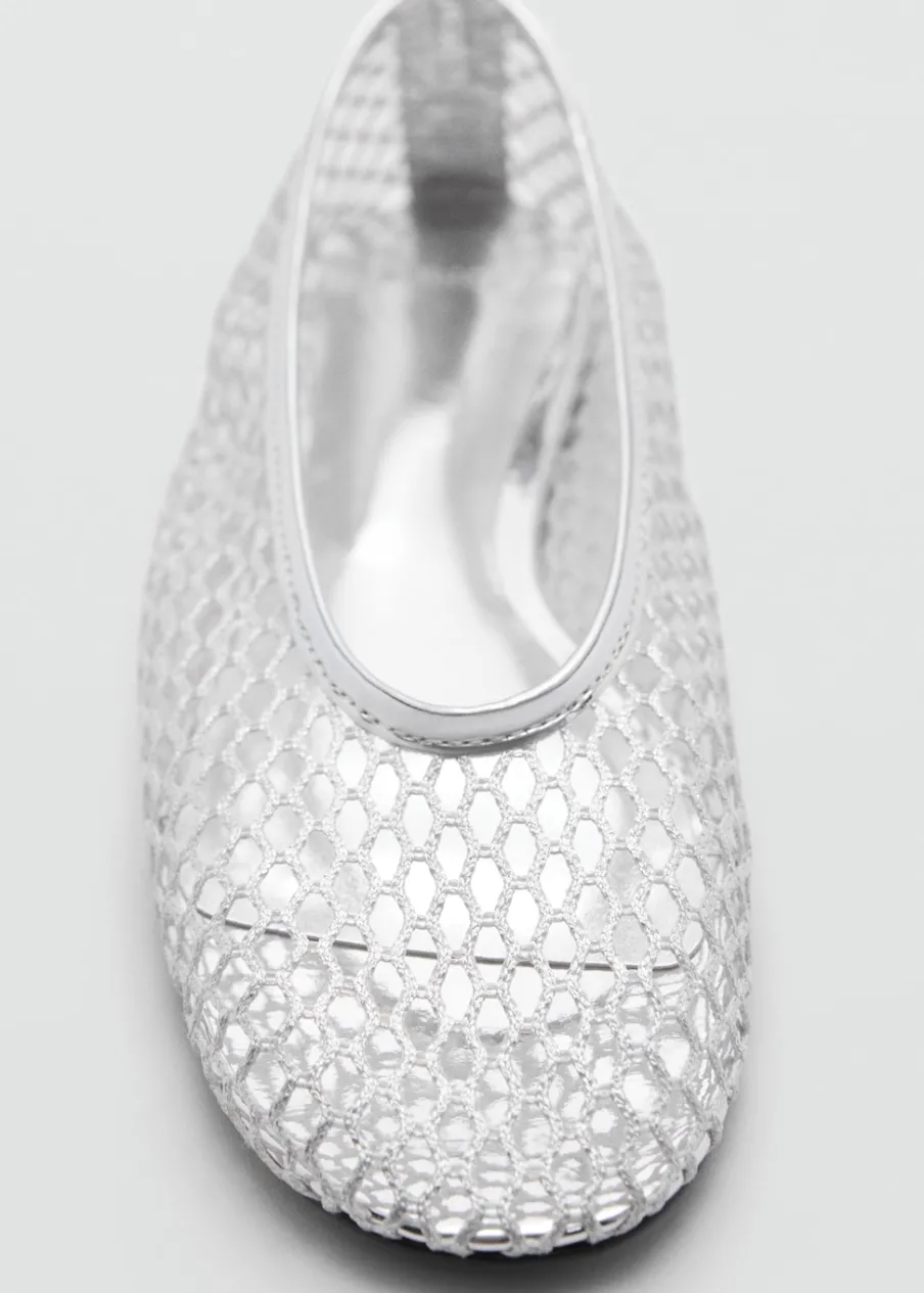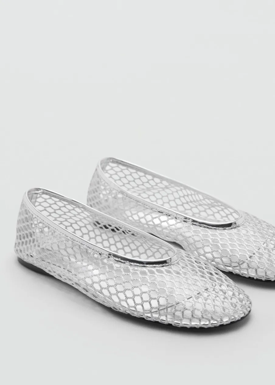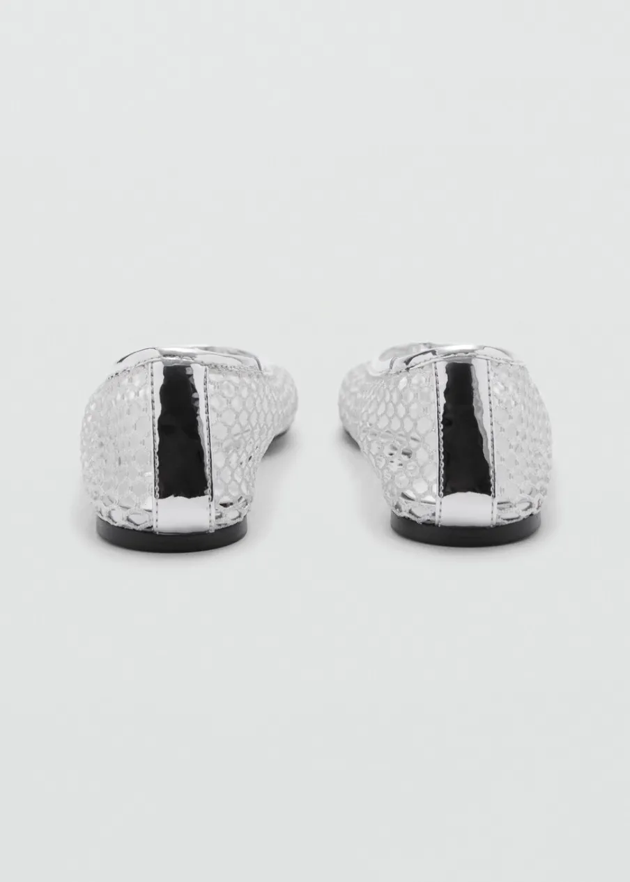 Siateczkowa tkanina. Metaliczny efekt. Okrągły nosek. Płaska podeszwa. Bez zapięcia.