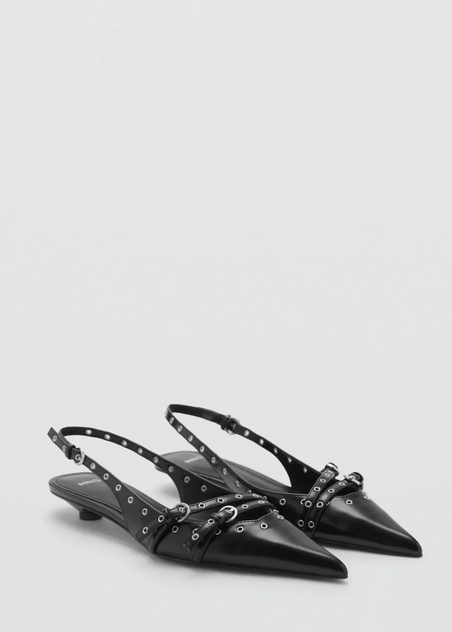 OpisObcas typu kitten. Dziurkowane detale. Spiczaste zakończenie. Zapięcie na klamrę. Wewnętrzna podszewka.