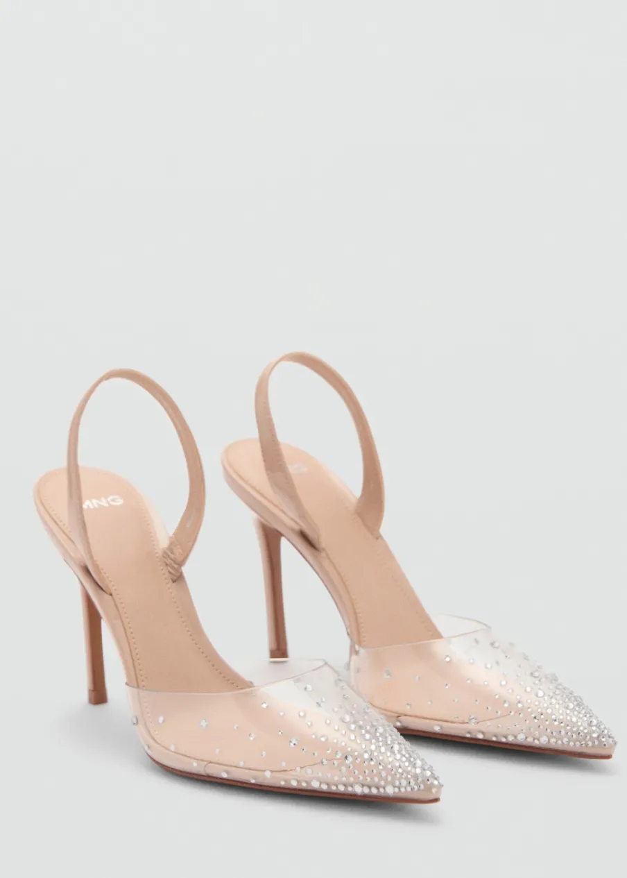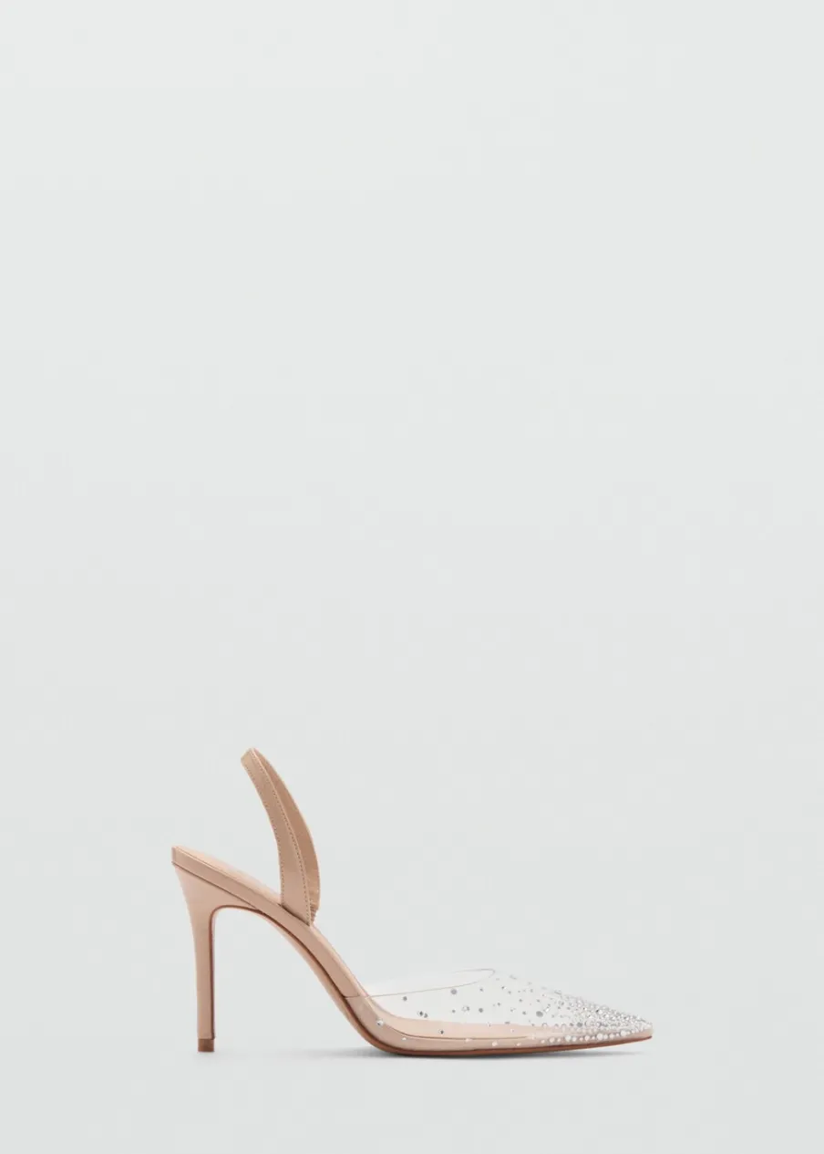 Obcas mierzy 9,5 cm. Wysoki obcas. Obcas szpilka. Spiczaste zakończenie. Bez zapięcia. Detal strass. 7,5 cm.