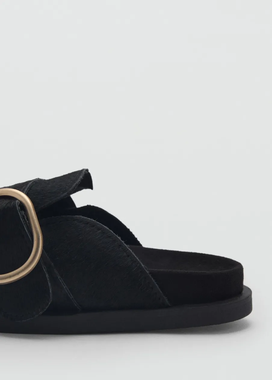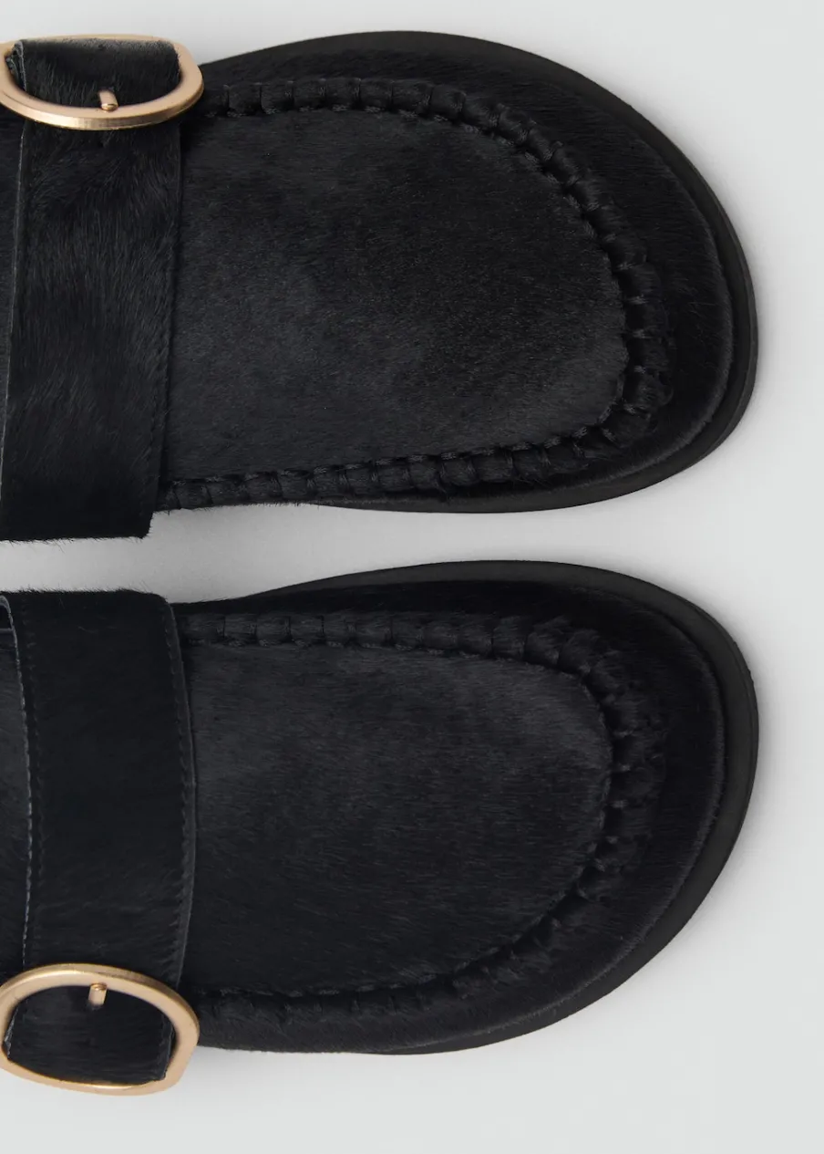 100% skóra bydlęca. Płaska podeszwa. Futro. Okrągły nosek. Regulowana klamerka.