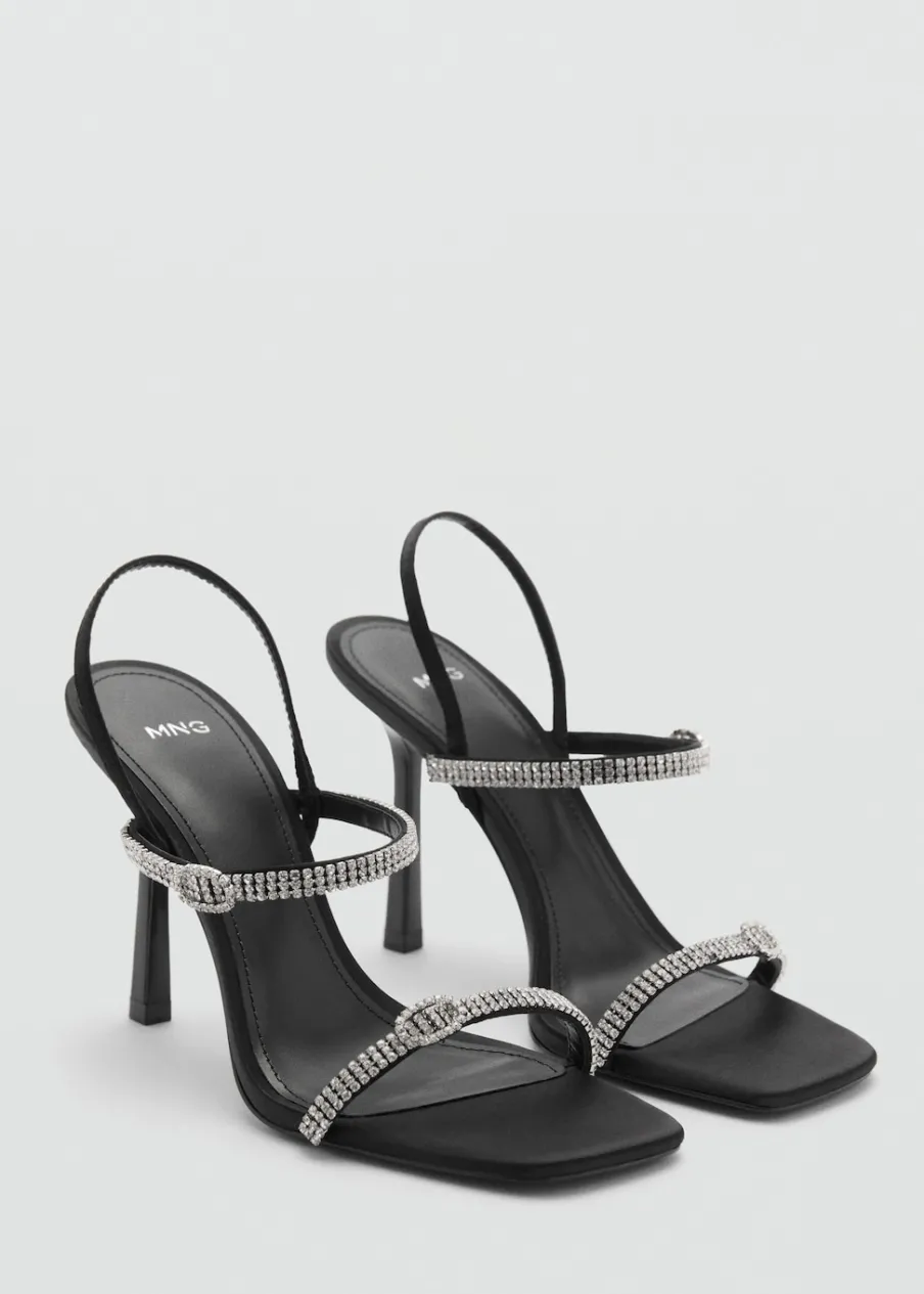 Model z paskami. Rozporek z przodu. Kwadratowy nosek. Obcas mierzy 10 cm. Detal strass. Bez zapięcia.