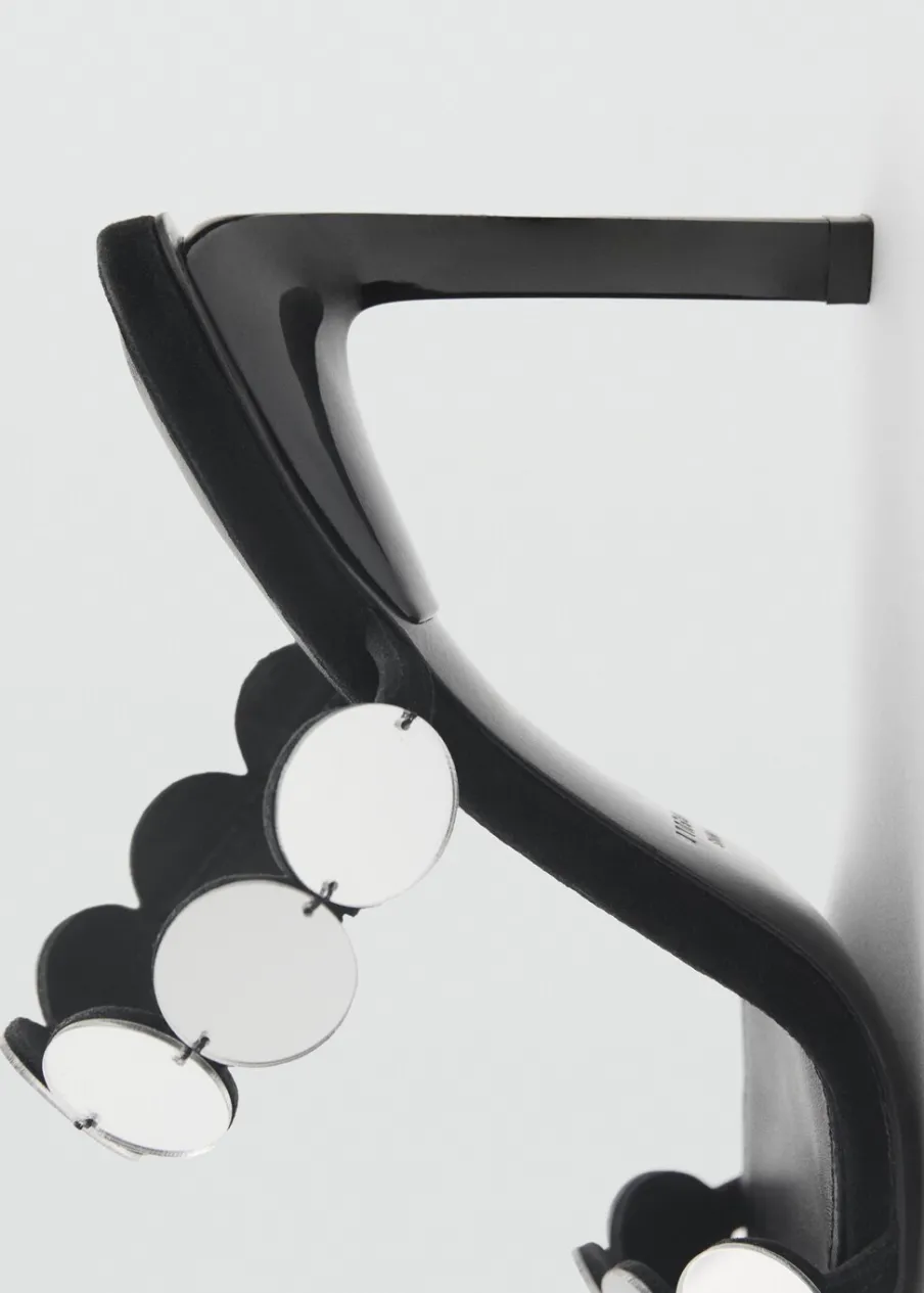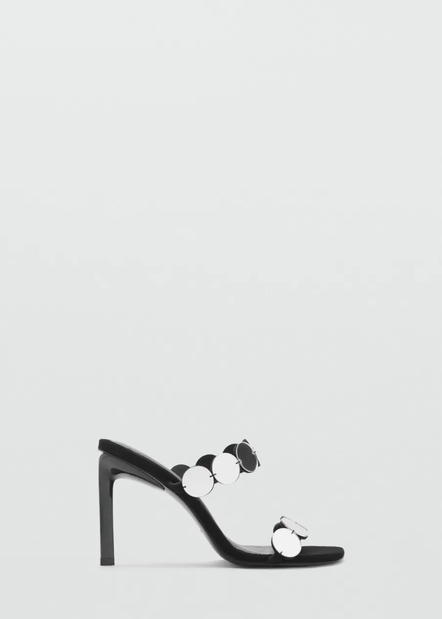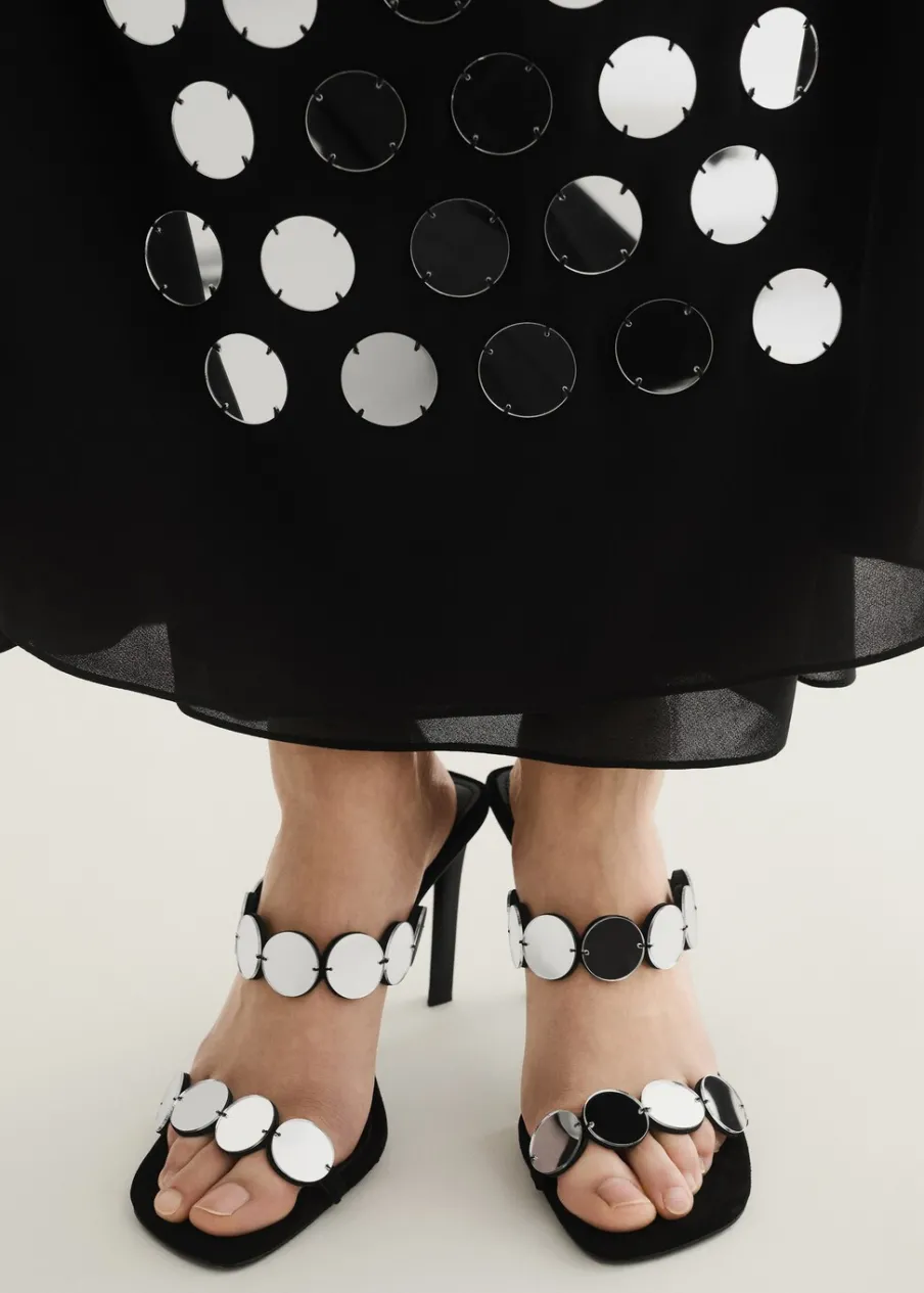 Aplikacja z metalowych płytek dodaje tym klapkom wyjątkowej elegancji i unikalnego charakteru. Są idealnym dopełnieniem stylizacji wieczorowych w tym sezonie. 100% skóra. Aplikacja z metalowych lusterek. Obcas szpilka. Obcas mierzy 9,5 cm. Artykuły z kolekcji CAPSULE można wymienić lub zwrócić w ciągu 14 dni od daty wysyłki. Model z odkrytą piętą.