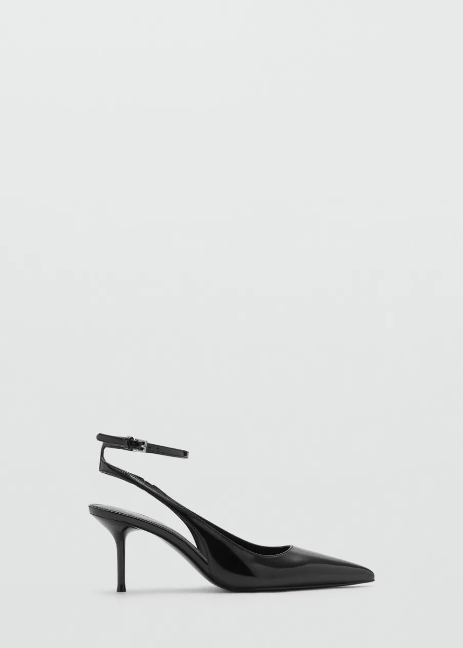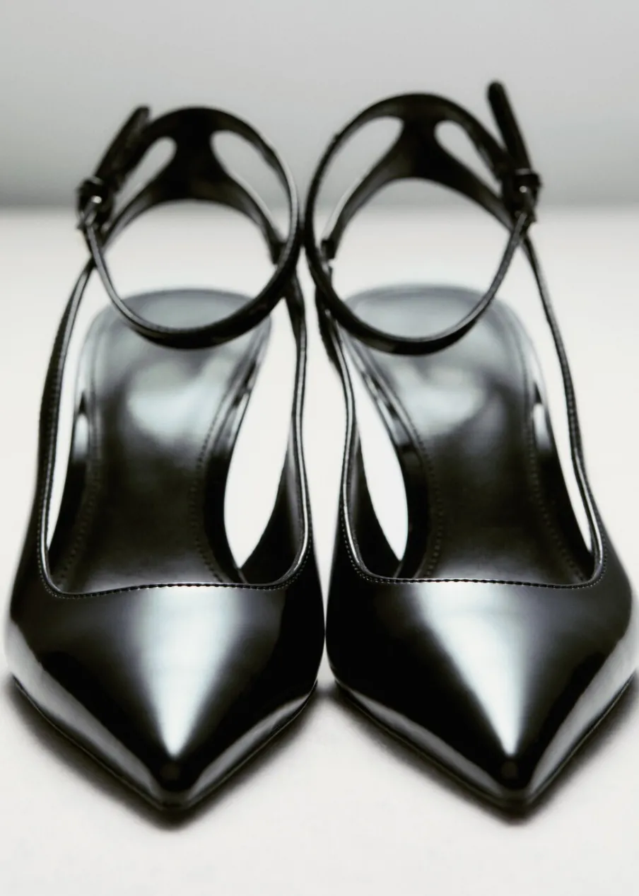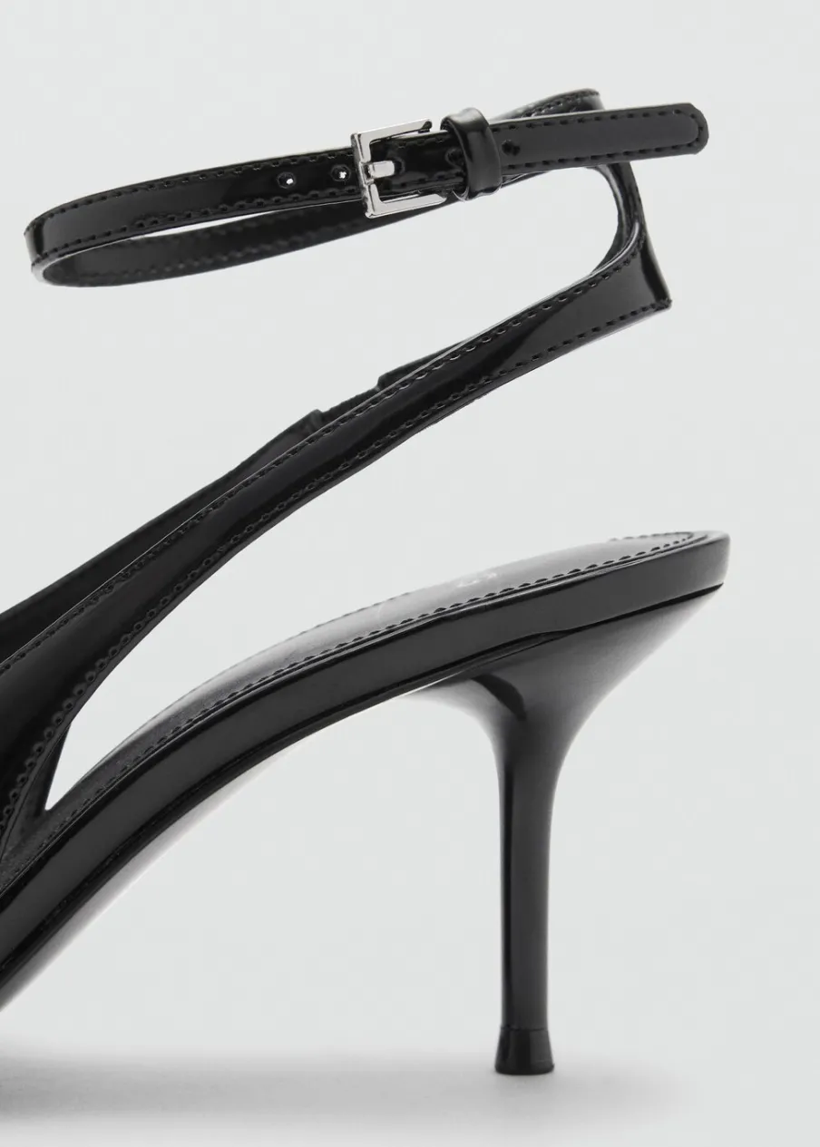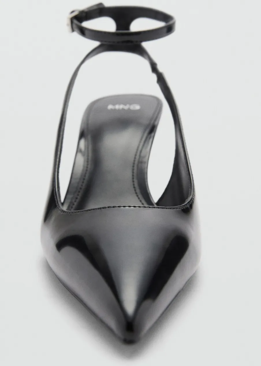 Spiczaste zakończenie. Obcas szpilka. Imitacja lakierowanej skóry. Zapięcie na klamrę. Obcas mierzy 7,5 cm.