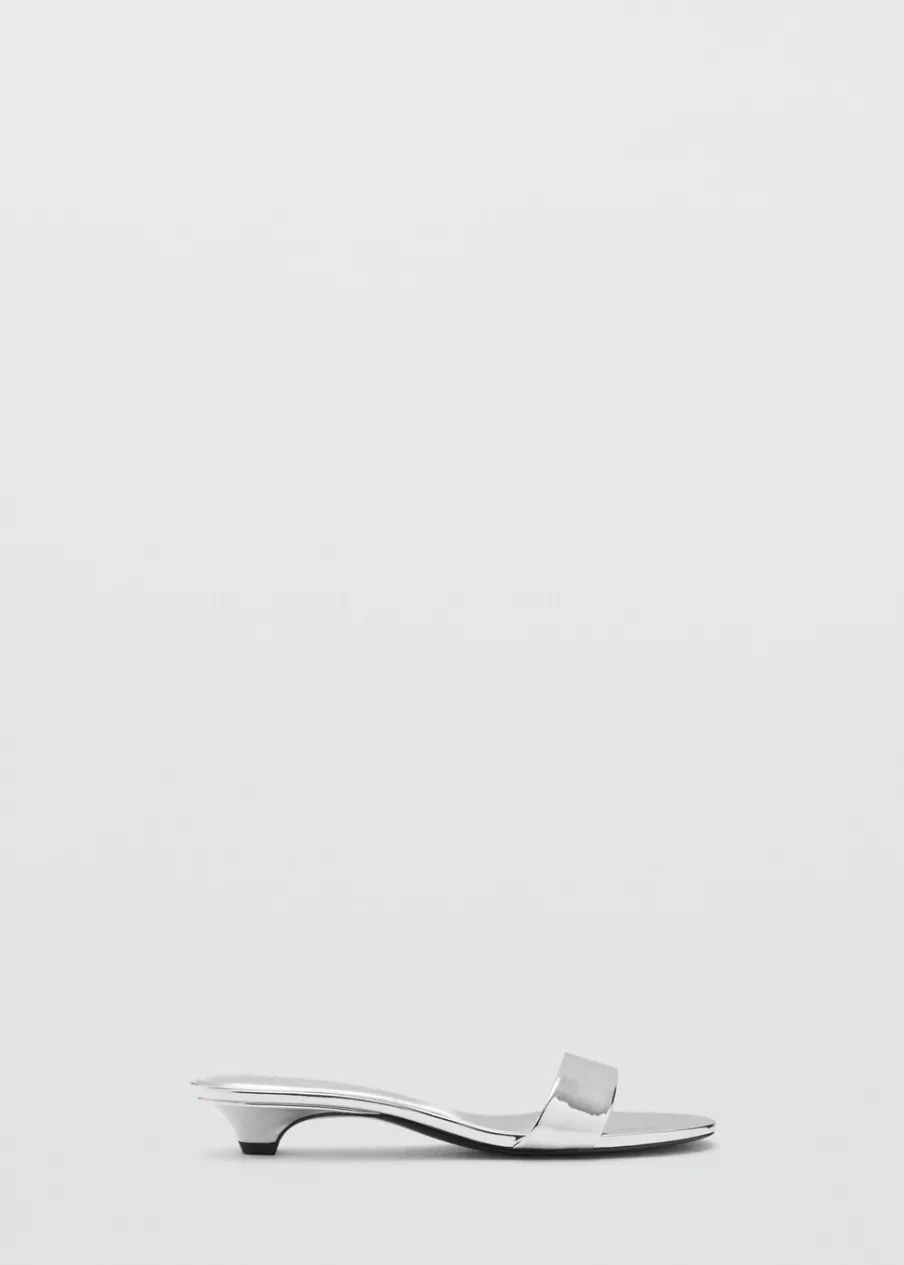 Metaliczny efekt. Fason z odkrytą piętą. Model z paskami. Rozporek z przodu. Kwadratowy nosek. Obcas typu kitten. Bez zapięcia. Wewnętrzna podszewka. Wysokość obcasa 3 cm.