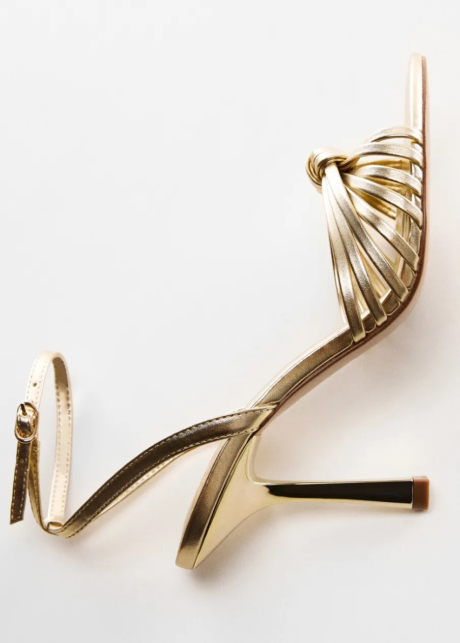 Metaliczne wykończenie. Model z paskami. Obcas lejkowy. Okrągły nosek. Pasek wokół kostki. Zapięcie na klamrę. Ozdobny węzeł. Wewnętrzna podszewka. Obcas mierzy 9 cm. Kolekcja wizytowa.