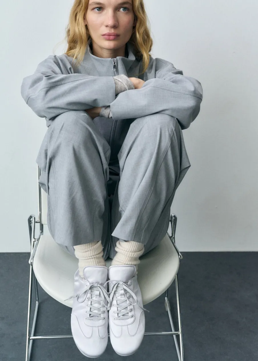 Satynowa tkanina. Okrągły nosek. Płaska podeszwa. Wiązanie na sznurówki. Wewnętrzna podszewka. Kilka przegródek na karty. Wewnętrzna kieszeń. Zapięcie na suwak. Detal z logo.