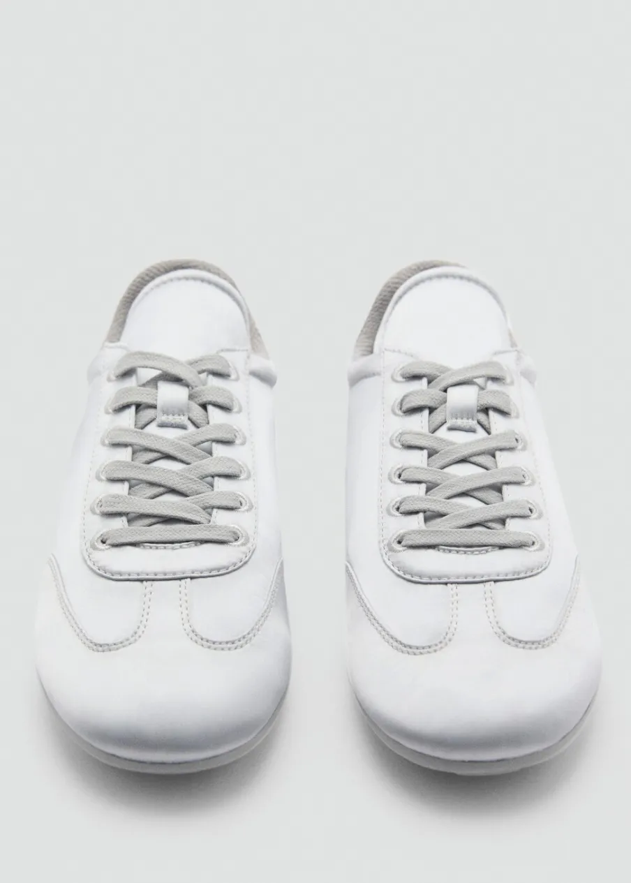 OpisSatynowa tkanina. Okrągły nosek. Płaska podeszwa. Wiązanie na sznurówki. Wewnętrzna podszewka. Kilka przegród…