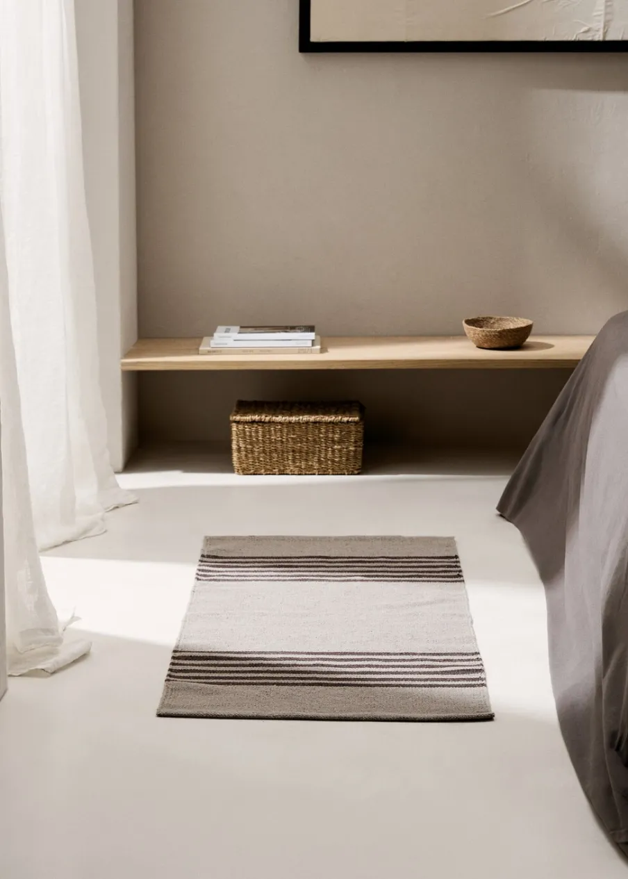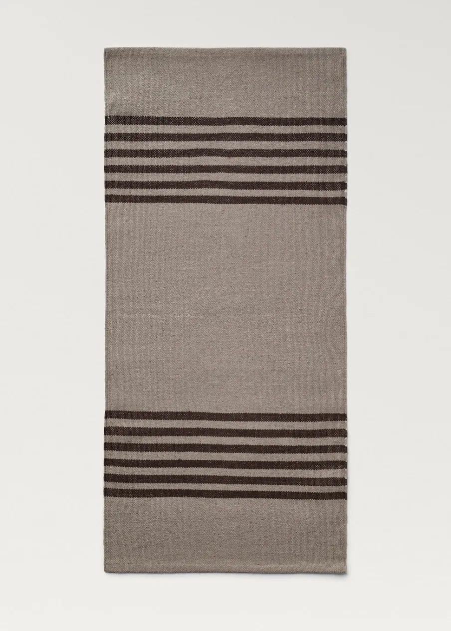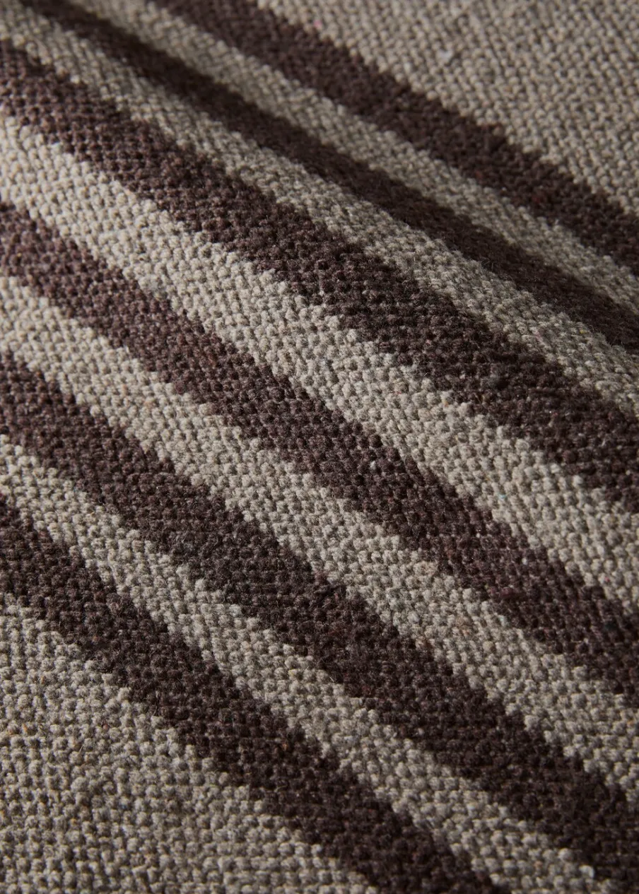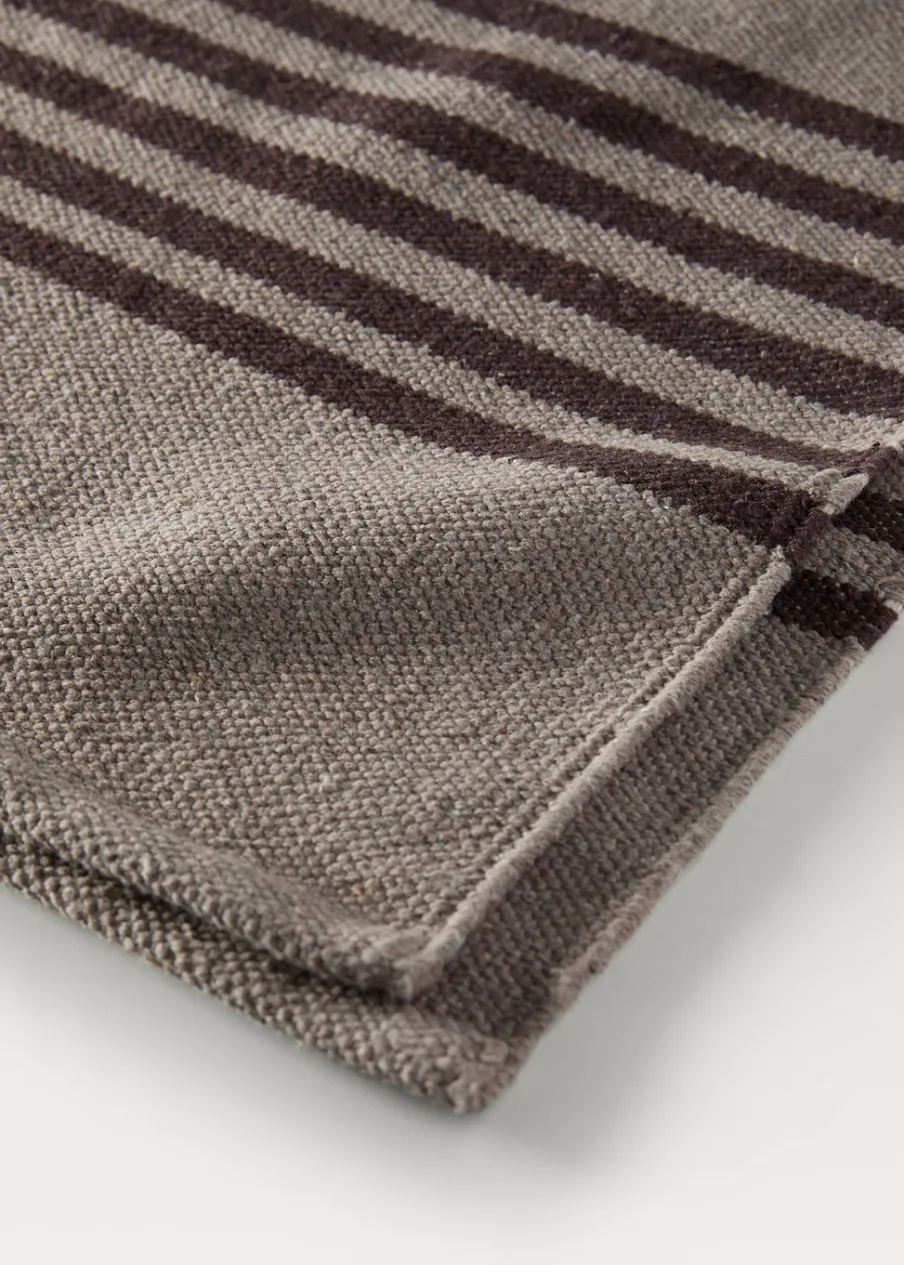 Wymiary: 60 x 120 cm. Miękka tekstura. Tkanina bawełniana z recyklingu. Kreuje przytulny i ciepły nastrój z oryginalnym akcentem. 95% bawełna. Ozdobne paski. Można prać w pralce w maks. 40°C. Można suszyć w suszarce bębnowej. Nie używać wybielacza. Prostokątny kształt.