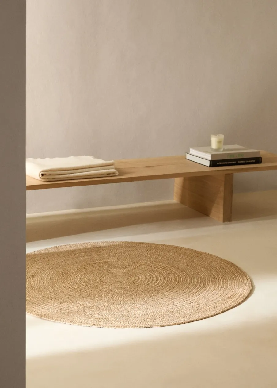 Tkanina z 100% juty. Średnica: 110 cm. Naturalne włókna. Śródziemnomorski styl.