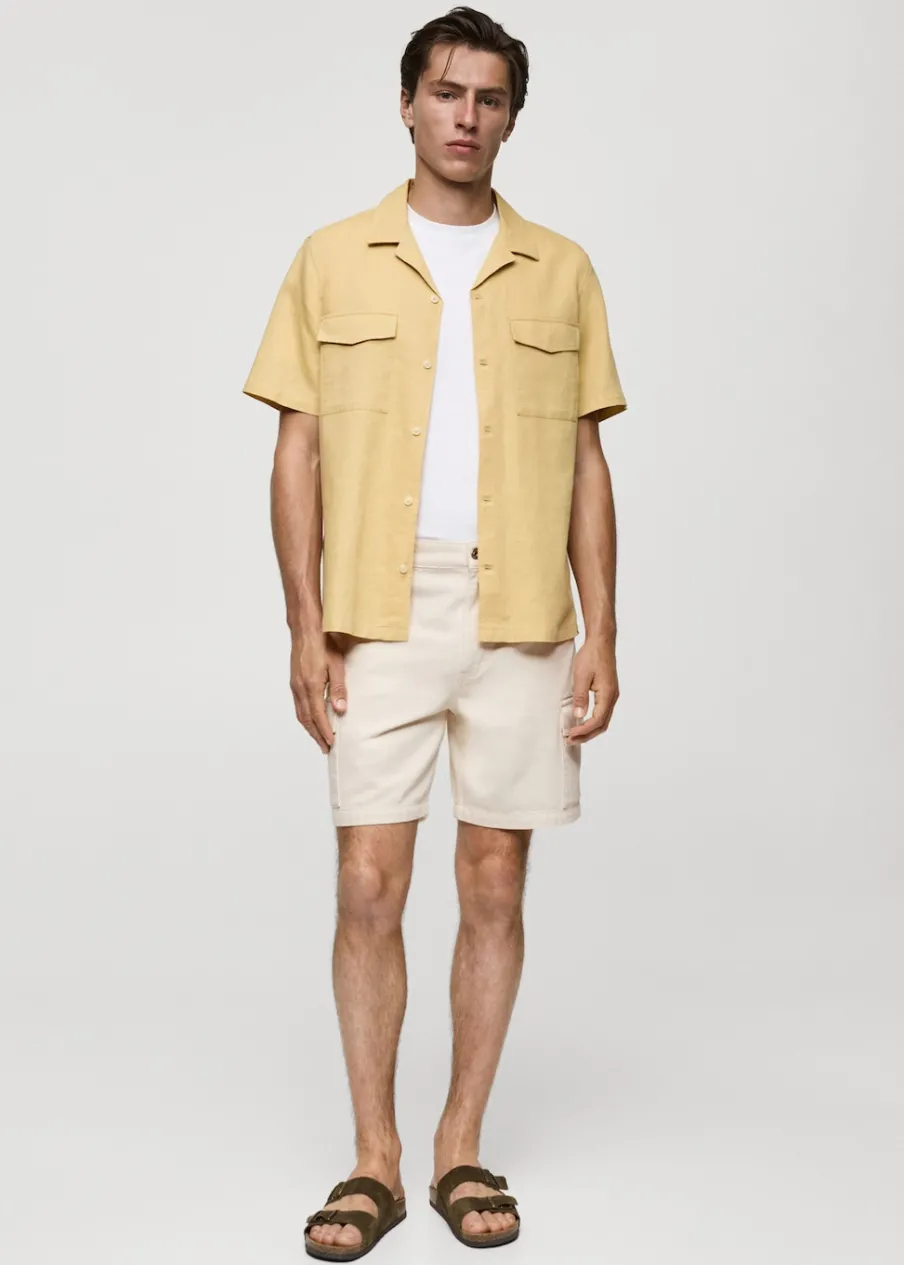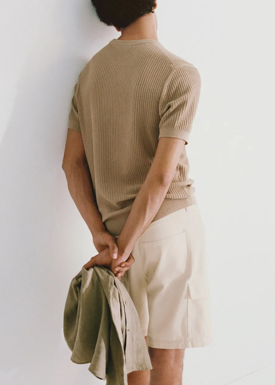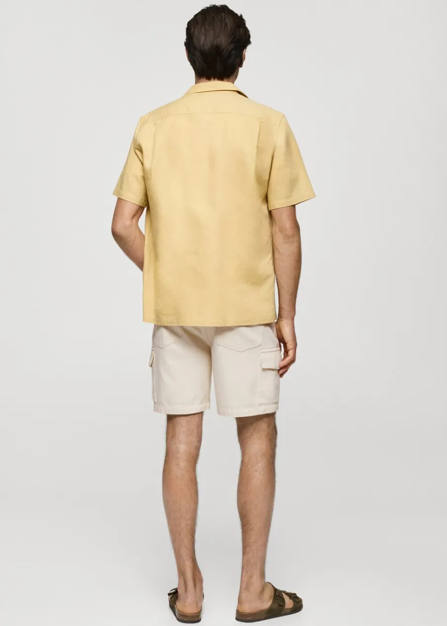 Fason cargo. Szlufki na pasek. Dwie kieszenie nakładane z przodu. Kieszeń na bilon. Dwie kieszenie cargo z zapięciem na zatrzaski. Dwie kieszenie nakładane z tyłu. Model ma 185 cm wzrostu i nosi rozmiar 42. Zapięcie na zamek i guzik z przodu. Tkanina z 100% bawełny.