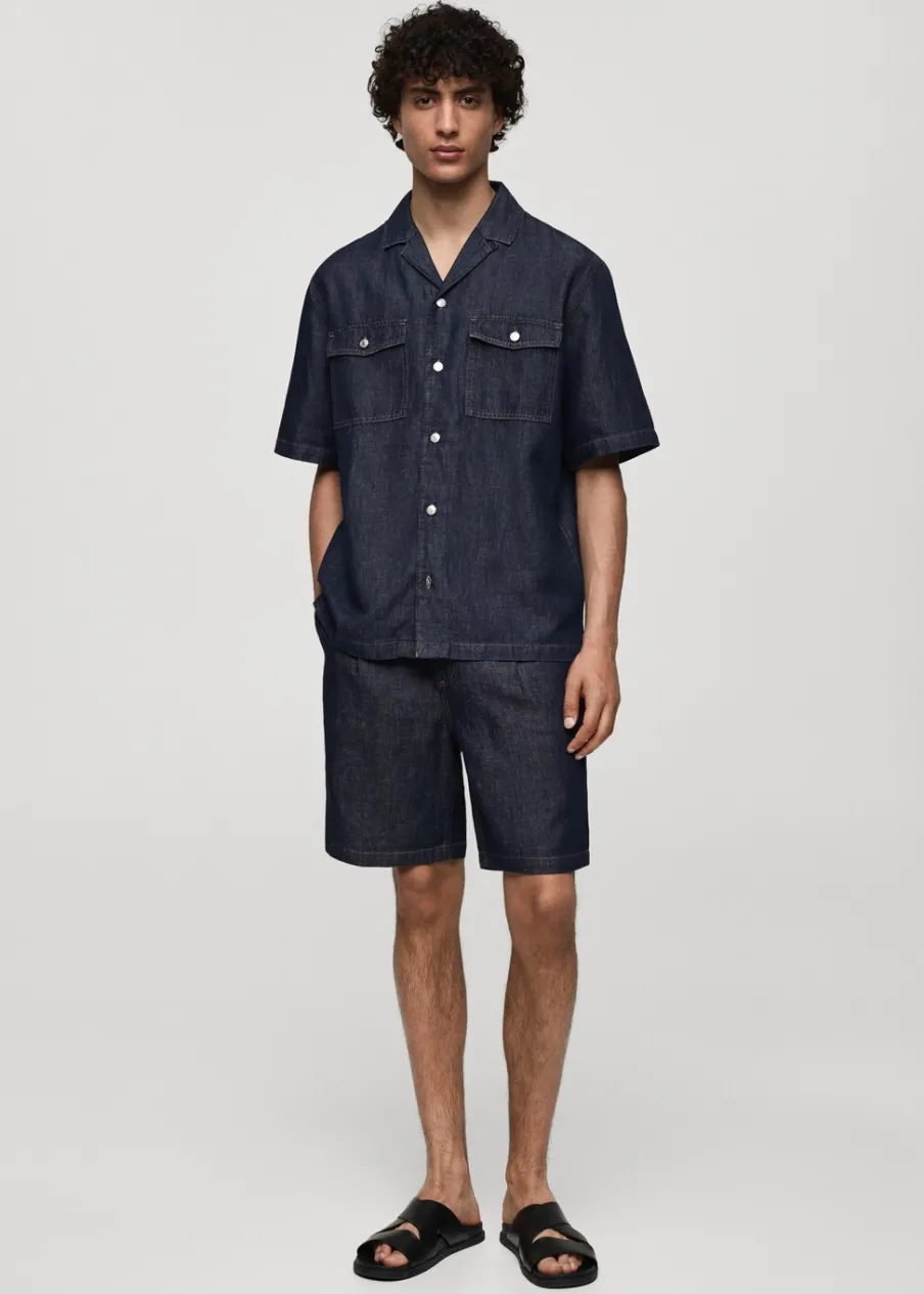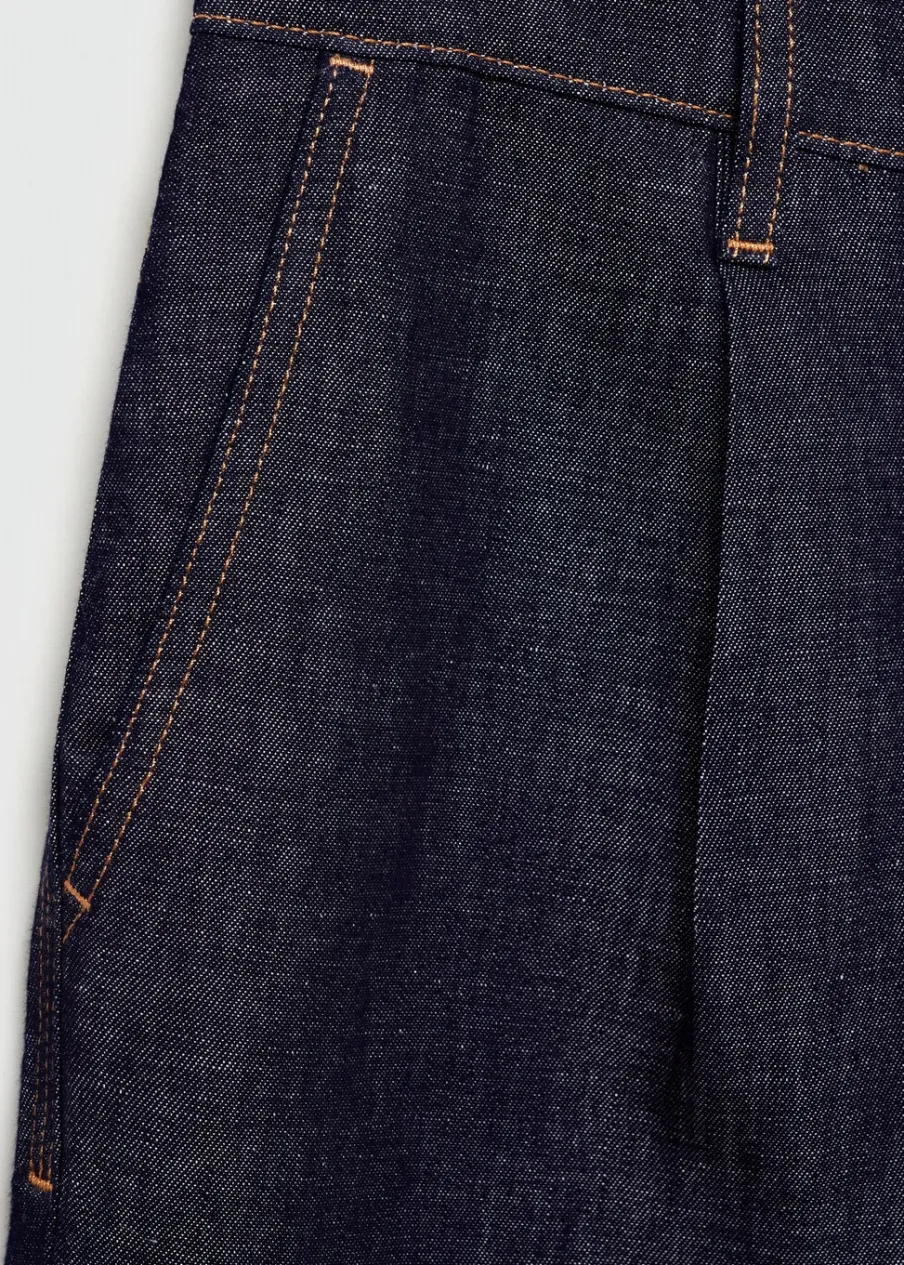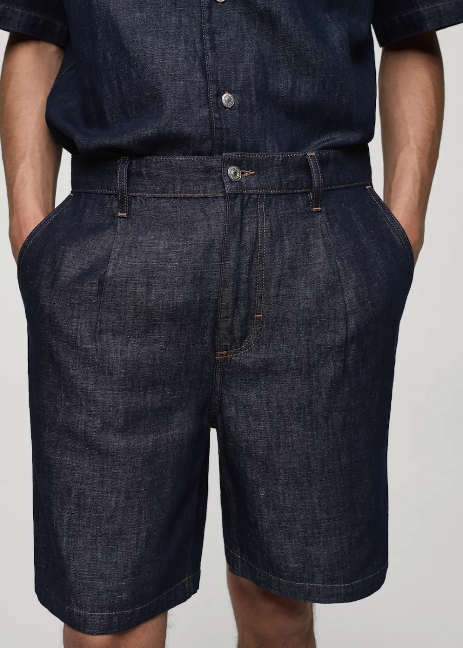 Dostępny zestaw total look. Tkanina przypominająca wyglądem denim. Zakładki z przodu. Szlufki na pasek. Zapięcie na suwak i guzik. Dwie kieszenie z przodu. Dwie kieszenie nakładane z tyłu. Stębnowane detale. Model ma 185 cm wzrostu i nosi rozmiar 42. Tkanina z 100% bawełny.