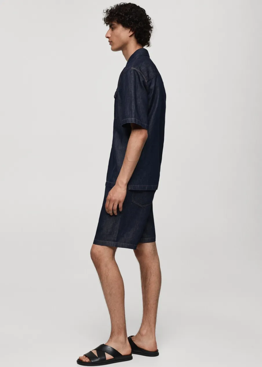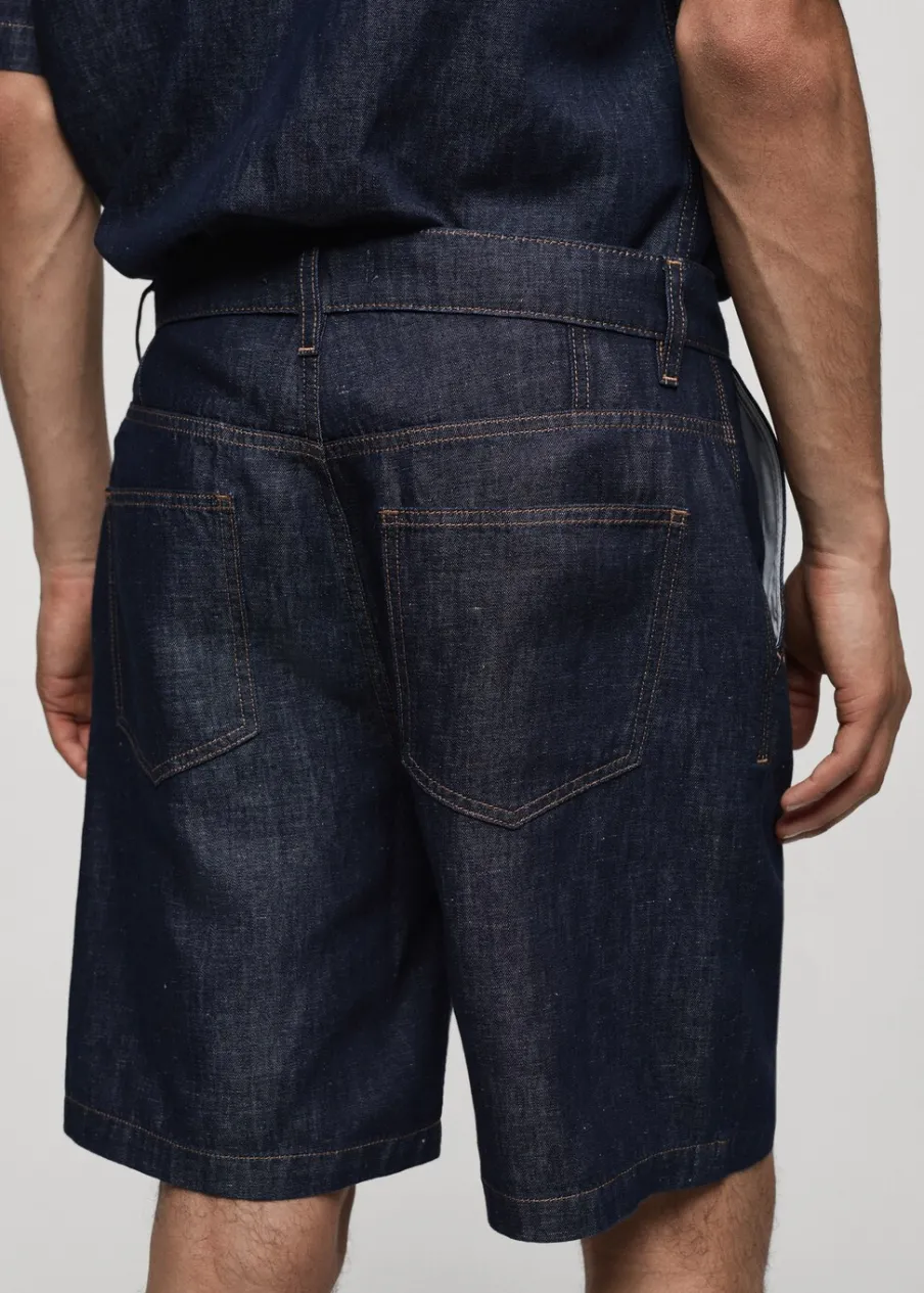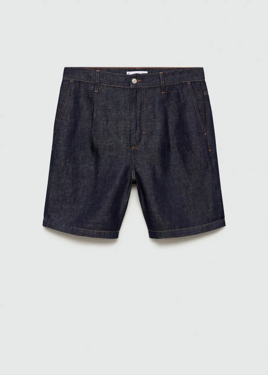 Dostępny zestaw total look. Tkanina przypominająca wyglądem denim. Zakładki z przodu. Szlufki na pasek. Zapięcie na suwak i guzik. Dwie kieszenie z przodu. Dwie kieszenie nakładane z tyłu. Stębnowane detale. Model ma 185 cm wzrostu i nosi rozmiar 42. Tkanina z 100% bawełny.