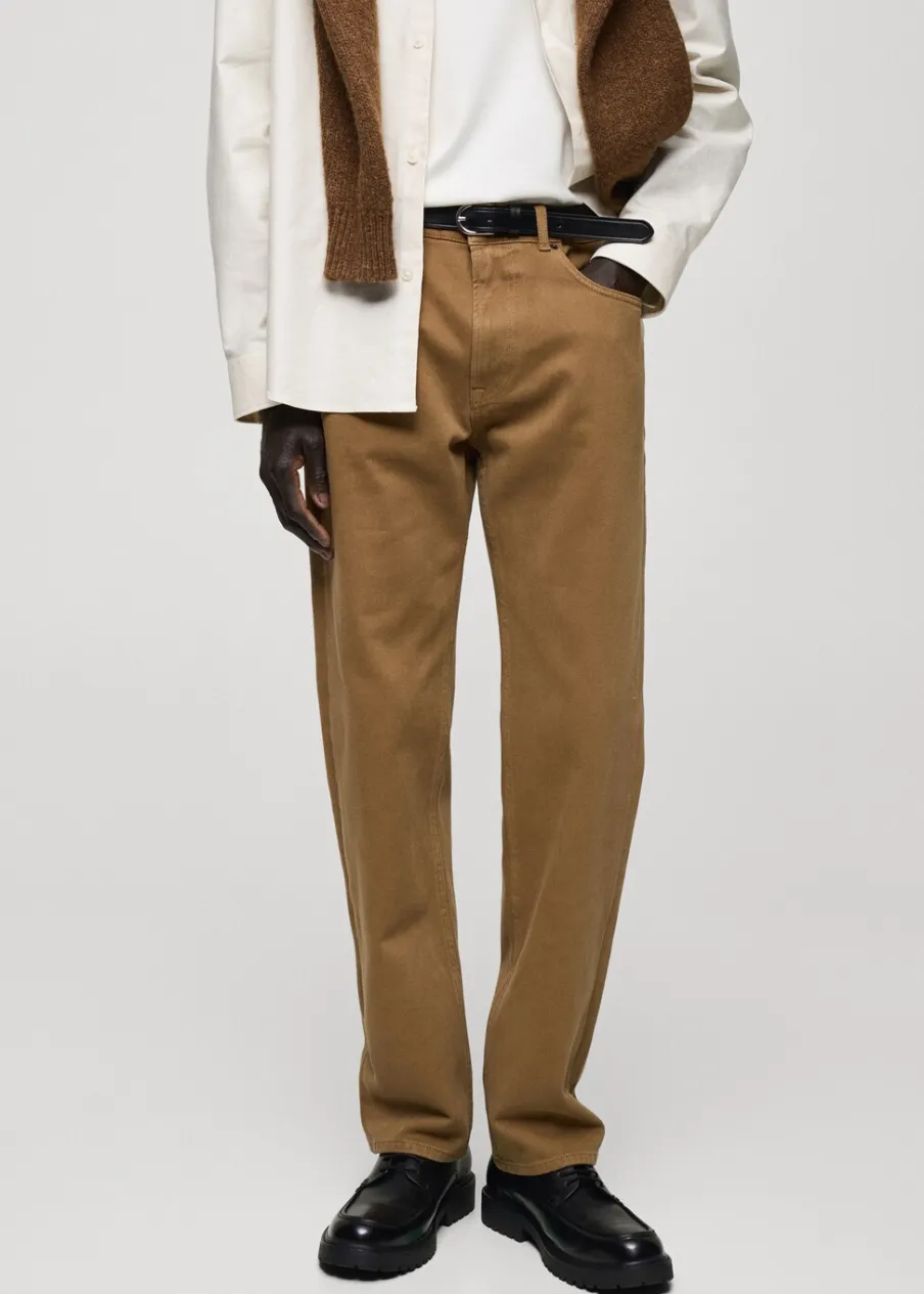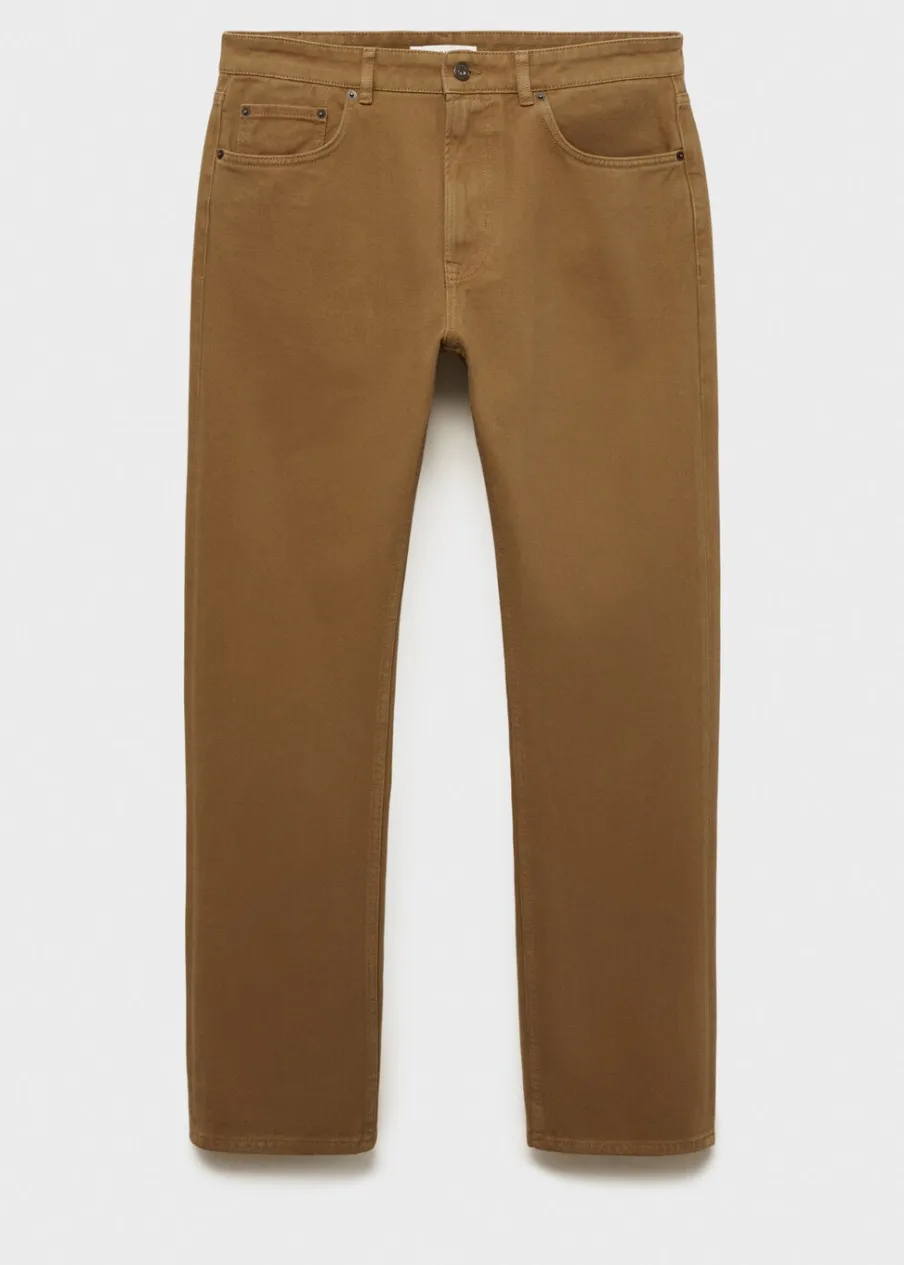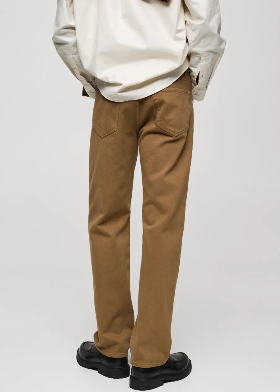 Prosty krój. Tkanina z 100% bawełny. Model dżinsowy. Dwie kieszenie nakładane z tyłu. Kieszeń na bilon. Szlufki na pasek. Dwie kieszenie boczne. Zapięcie na suwak i guzik. Model ma 185 cm wzrostu i nosi rozmiar 42.