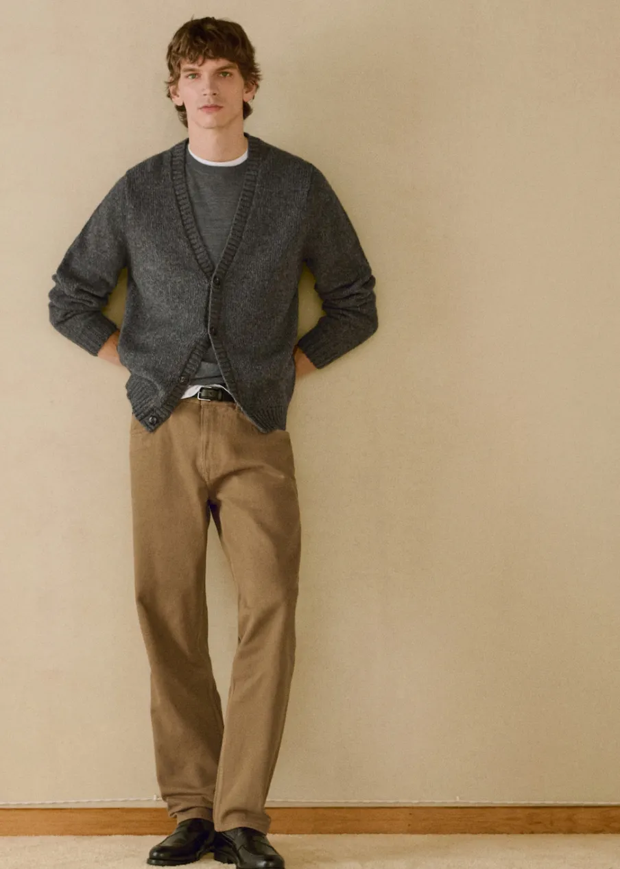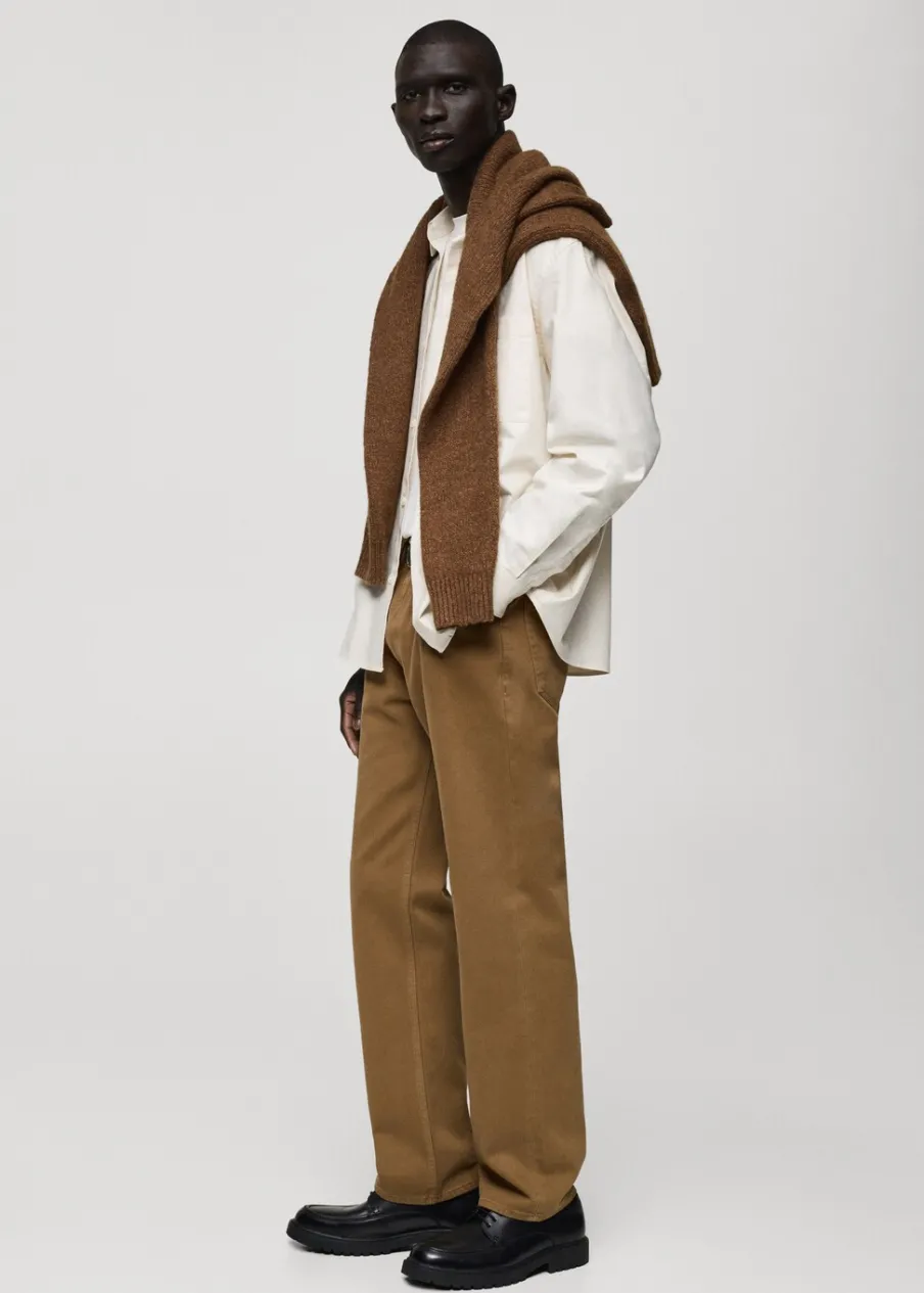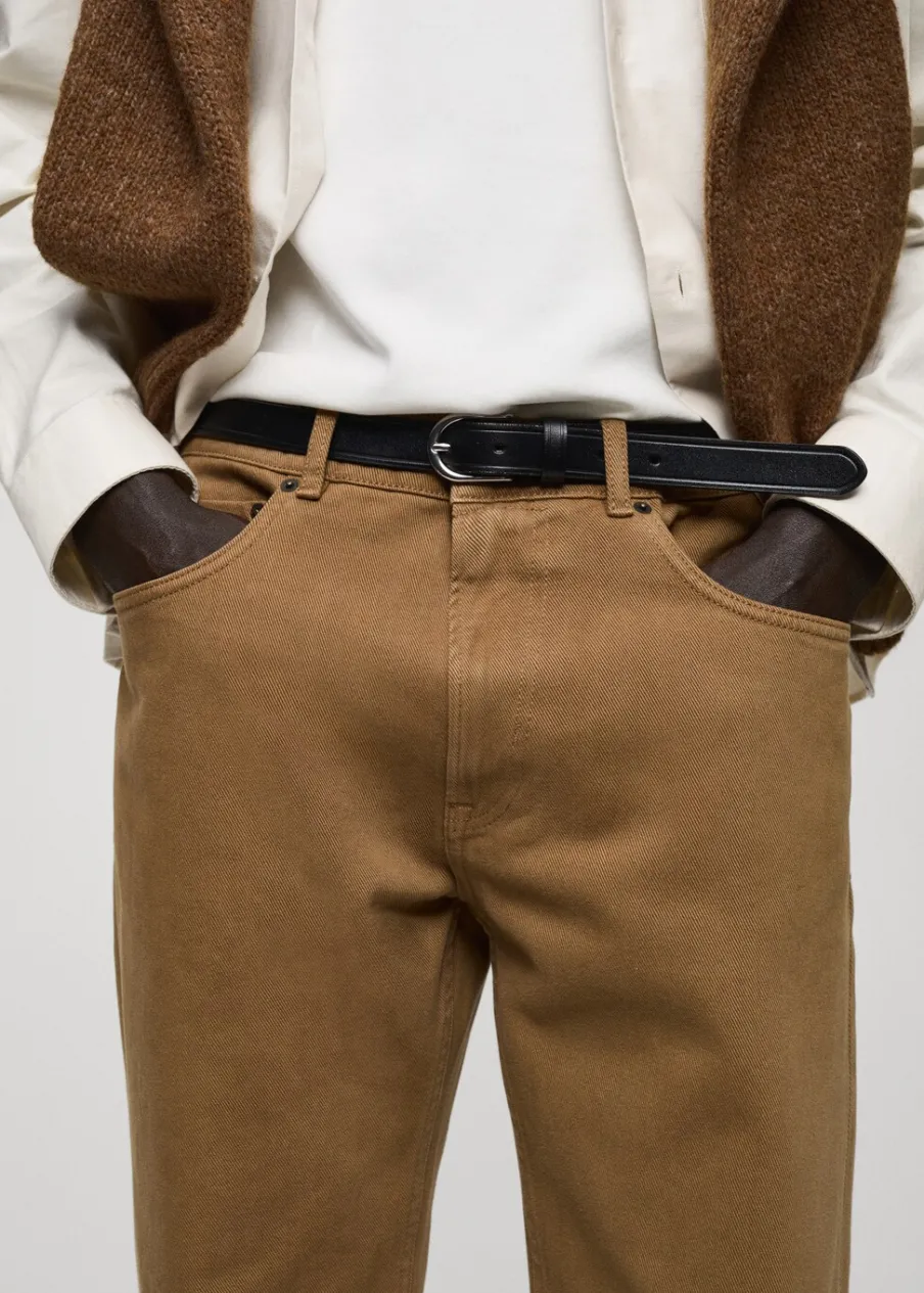 Prosty krój. Tkanina z 100% bawełny. Model dżinsowy. Dwie kieszenie nakładane z tyłu. Kieszeń na bilon. Szlufki na pasek. Dwie kieszenie boczne. Zapięcie na suwak i guzik. Model ma 185 cm wzrostu i nosi rozmiar 42.