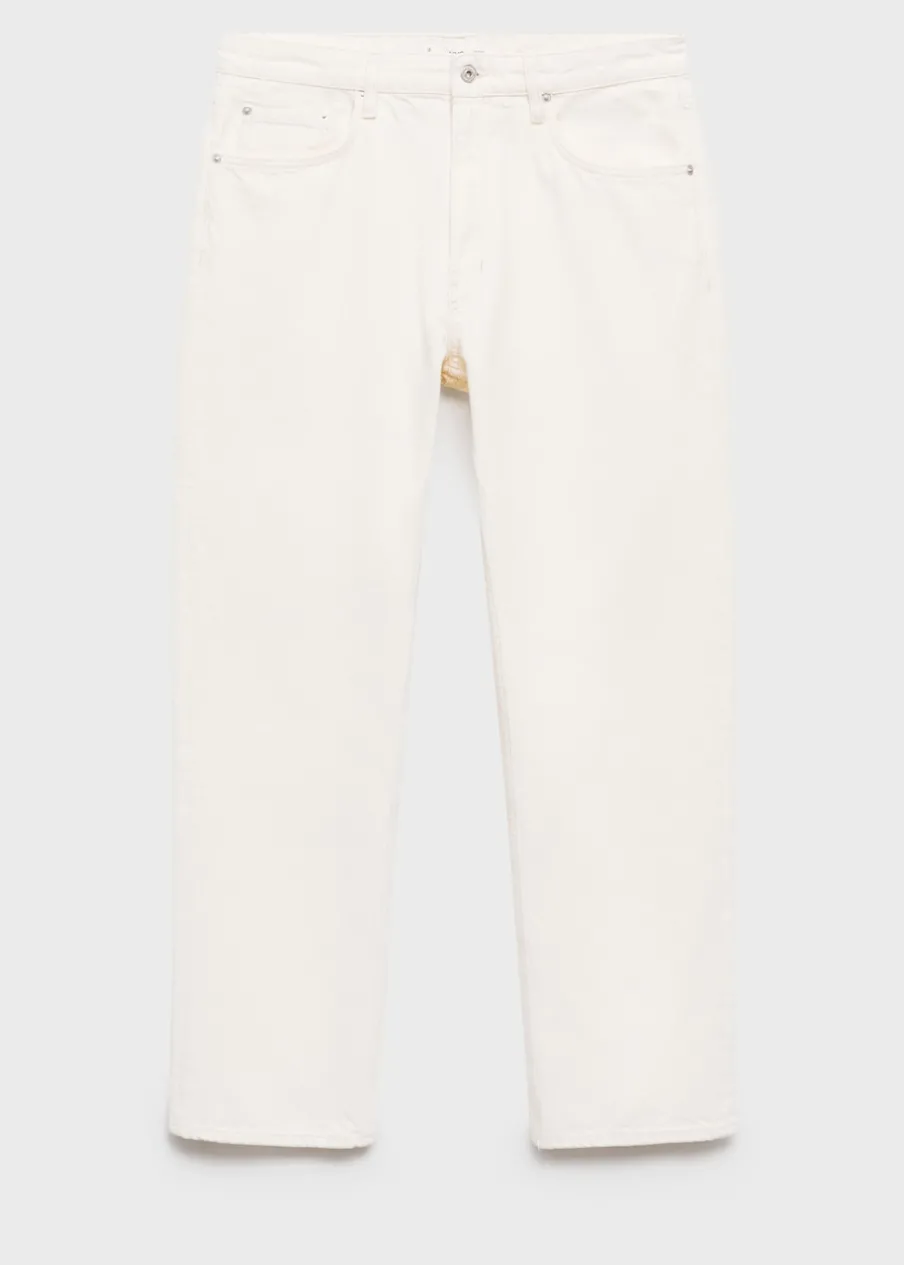 Straight-fit. Kolor écru. Średni stan. Tkanina z 100% bawełny. Zapięcie na zamek i guzik z przodu. Szlufki na pasek. Dwie kieszenie z przodu. Kieszonka na monety na wysokości biodra z tyłu. Dwie kieszenie nakładane z tyłu. Model ma 190 cm wzrostu i nosi rozmiar 42.