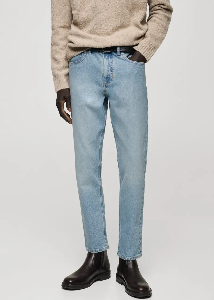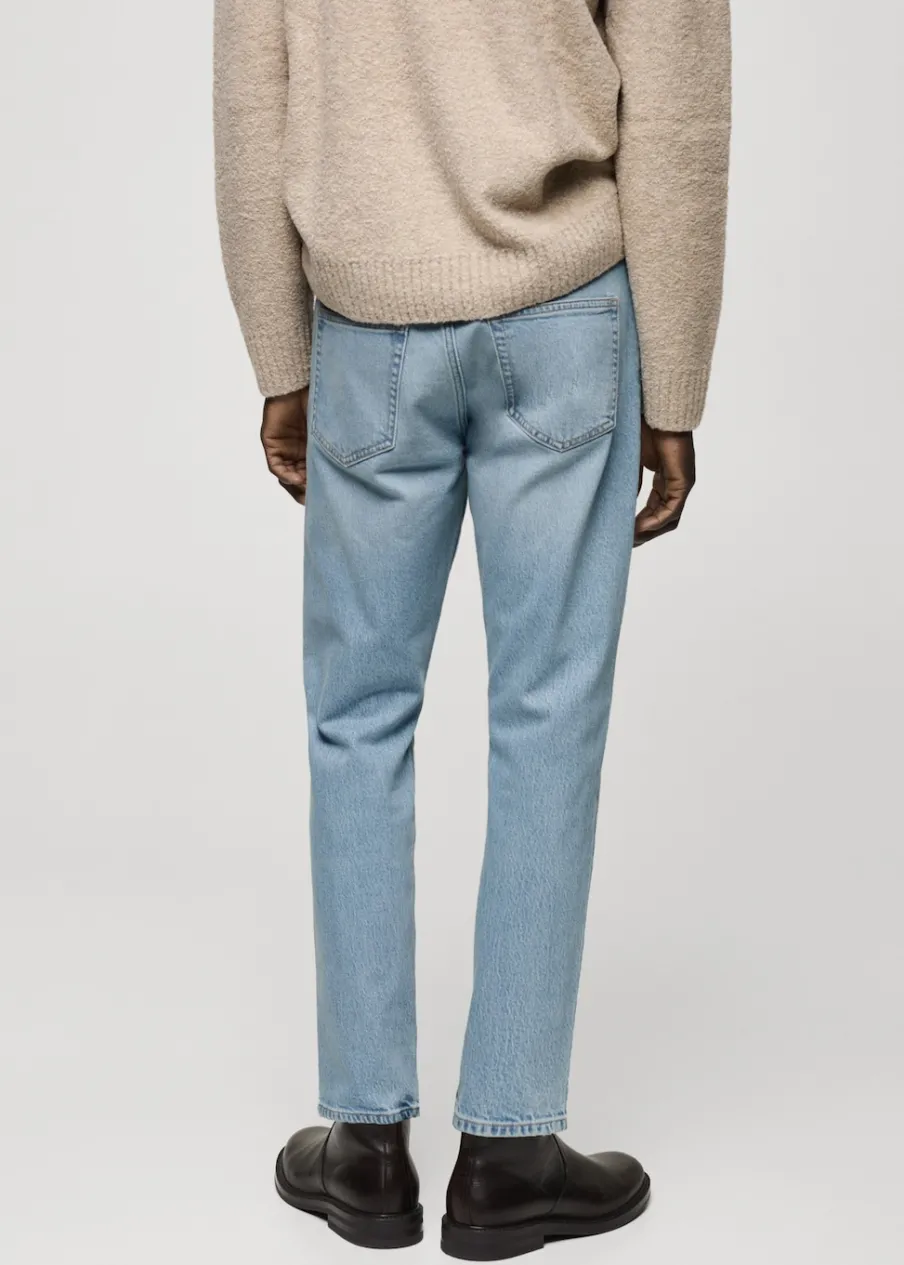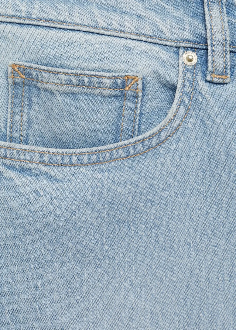 Tapered fit: nogawki szerokie w udach i zwężające się od kolan w dół. Tkanina bawełniana. Jeansowy styl. Spranie na jasno. Szlufki na pasek. Zapięcie na suwak i guzik. Dwie kieszenie boczne. Kieszeń na bilon. Dwie kieszenie nakładane z tyłu. Model ma 185 cm wzrostu i nosi rozmiar 42.