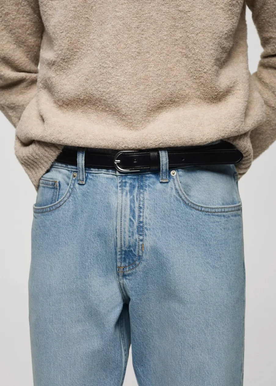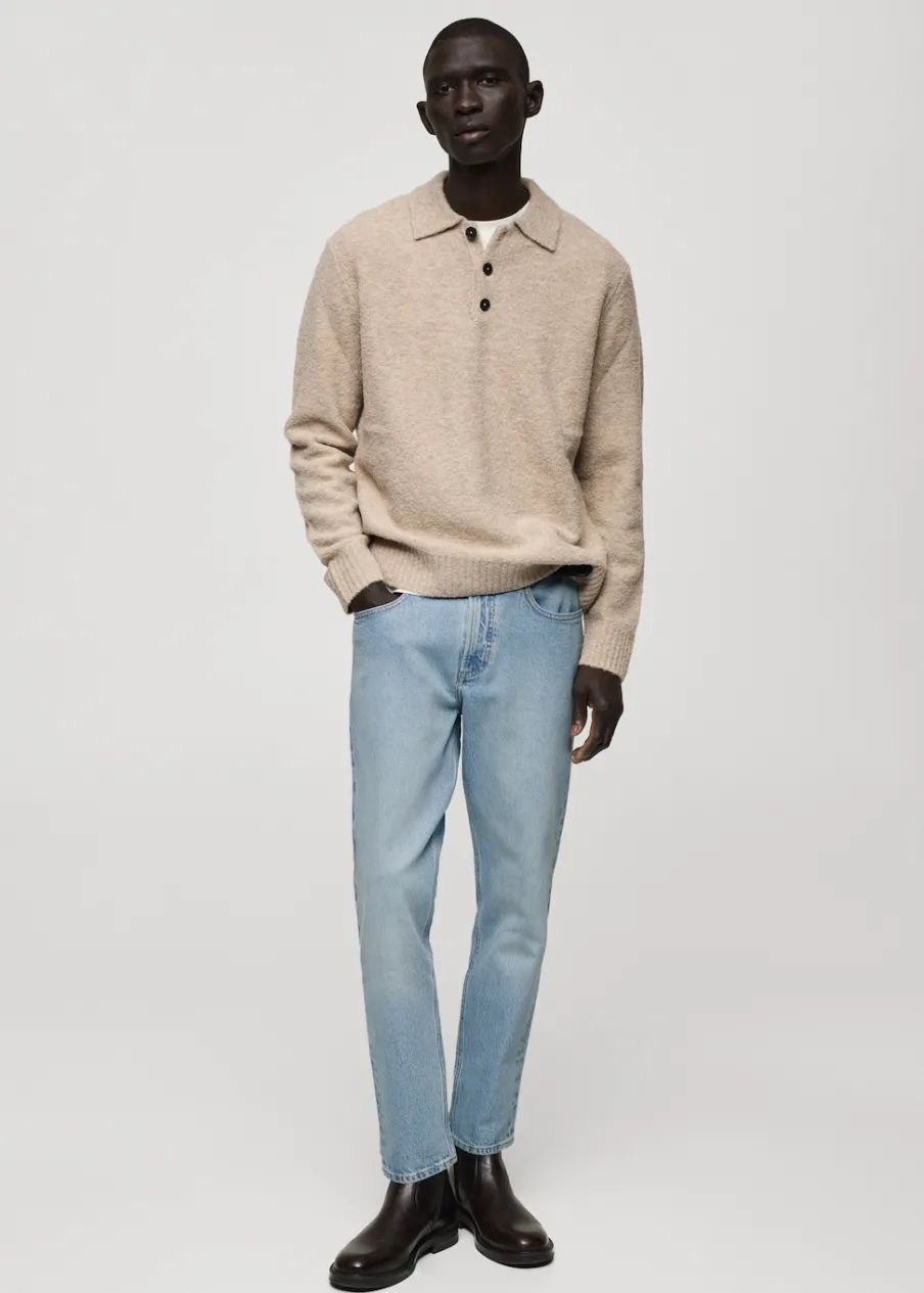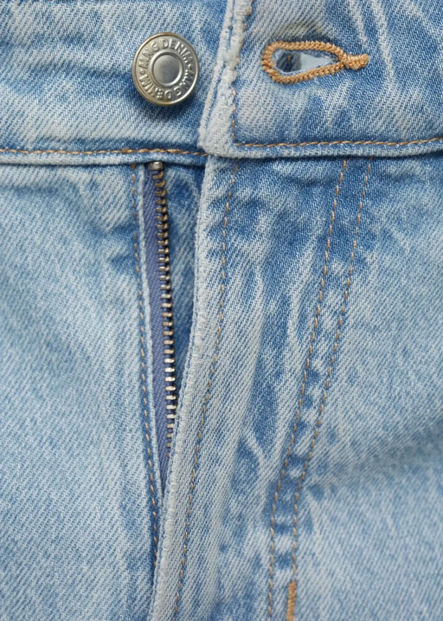 Tapered fit: nogawki szerokie w udach i zwężające się od kolan w dół. Tkanina bawełniana. Jeansowy styl. Spranie na jasno. Szlufki na pasek. Zapięcie na suwak i guzik. Dwie kieszenie boczne. Kieszeń na bilon. Dwie kieszenie nakładane z tyłu. Model ma 185 cm wzrostu i nosi rozmiar 42.