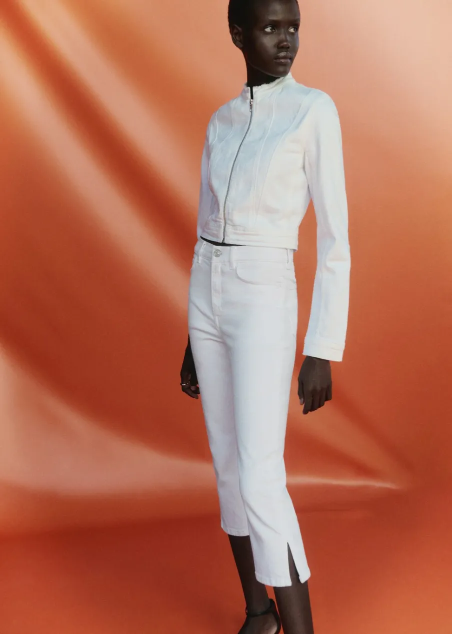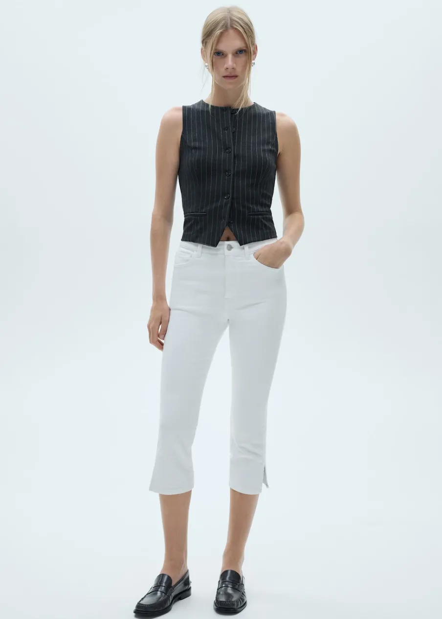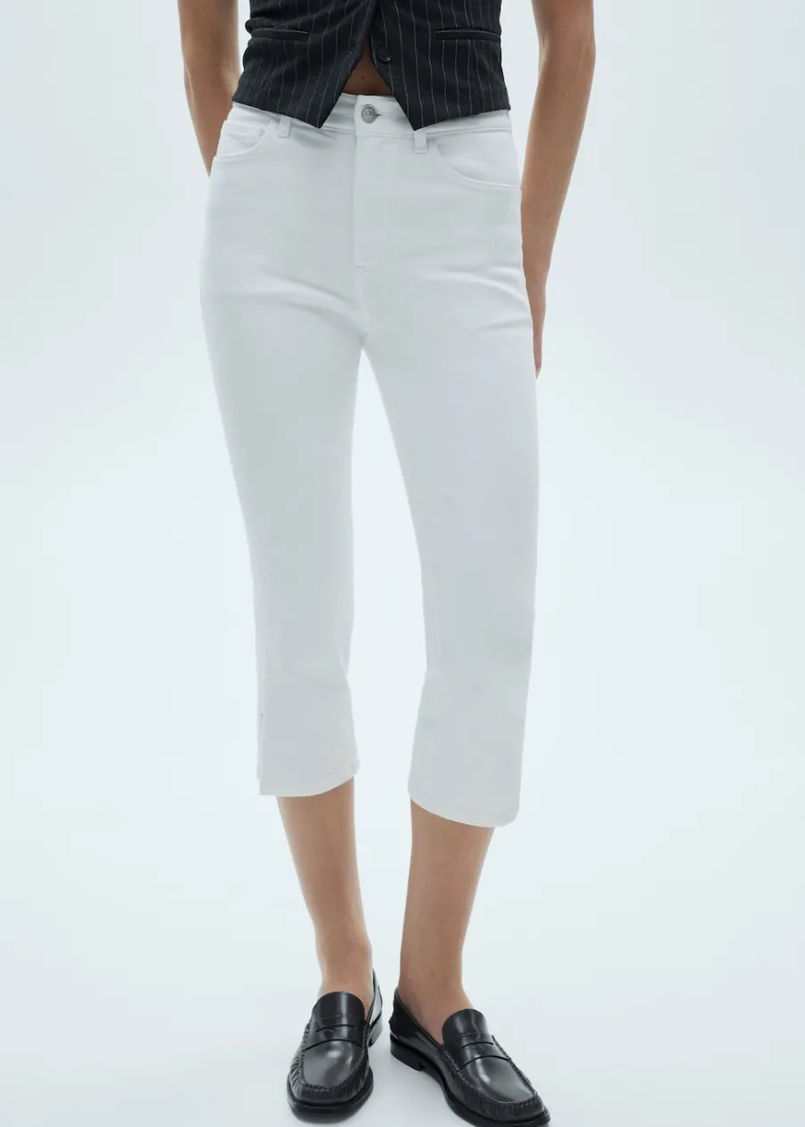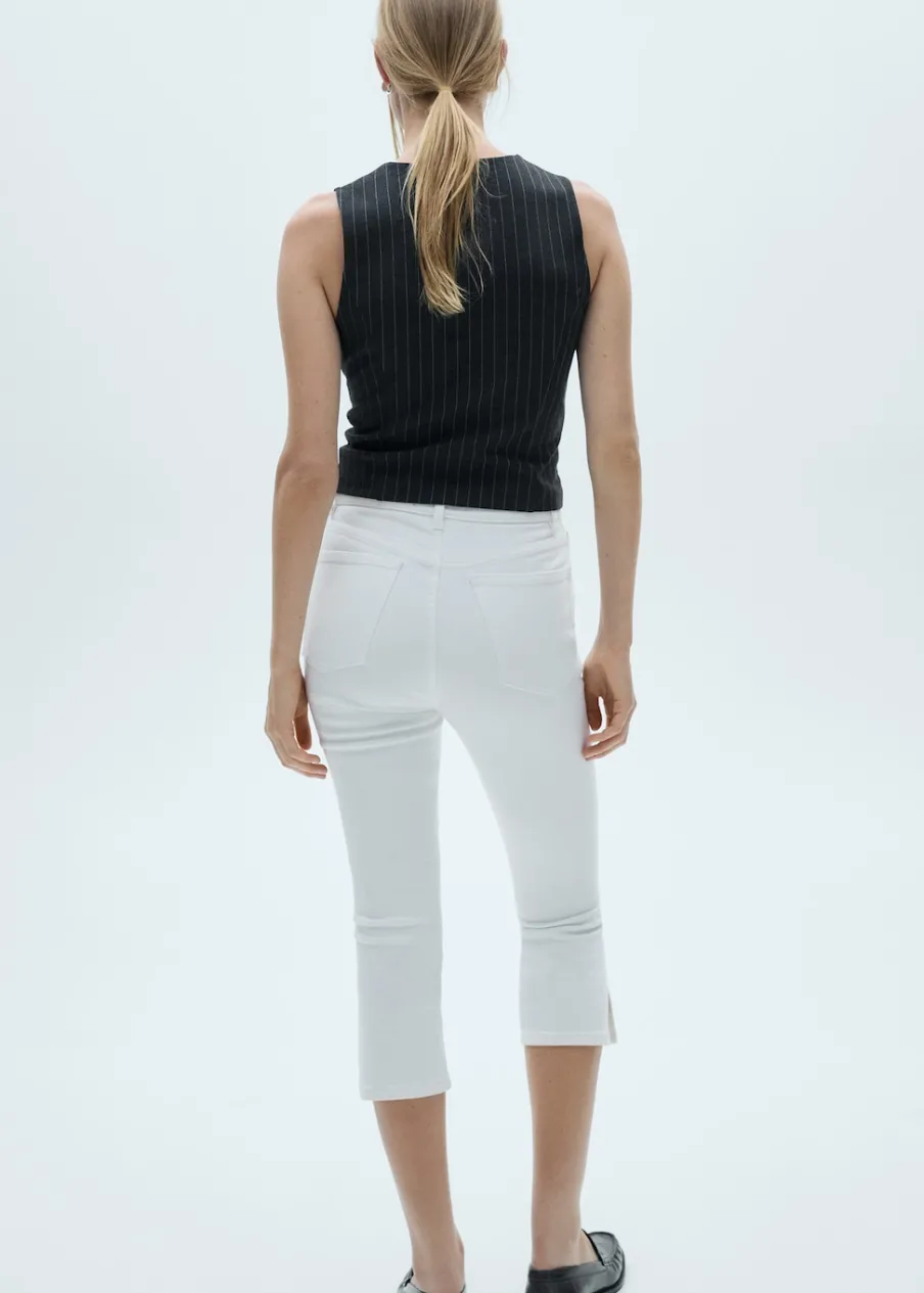 Tkanina bawełniana w dżinsowym stylu. Fason capri. Średni stan. Szlufki. Pięć kieszeni. Zapięcie na suwak i guzik. Dół z rozcięciem po bokach.
