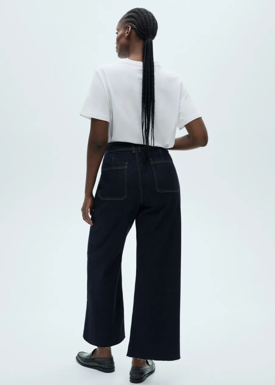 OpisTkanina bawełniana w dżinsowym stylu. Rinse wash. Elastyczna tkanina. Fason culotte. Podwyższony stan. Szlufki. K…