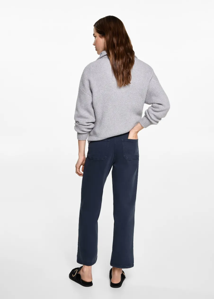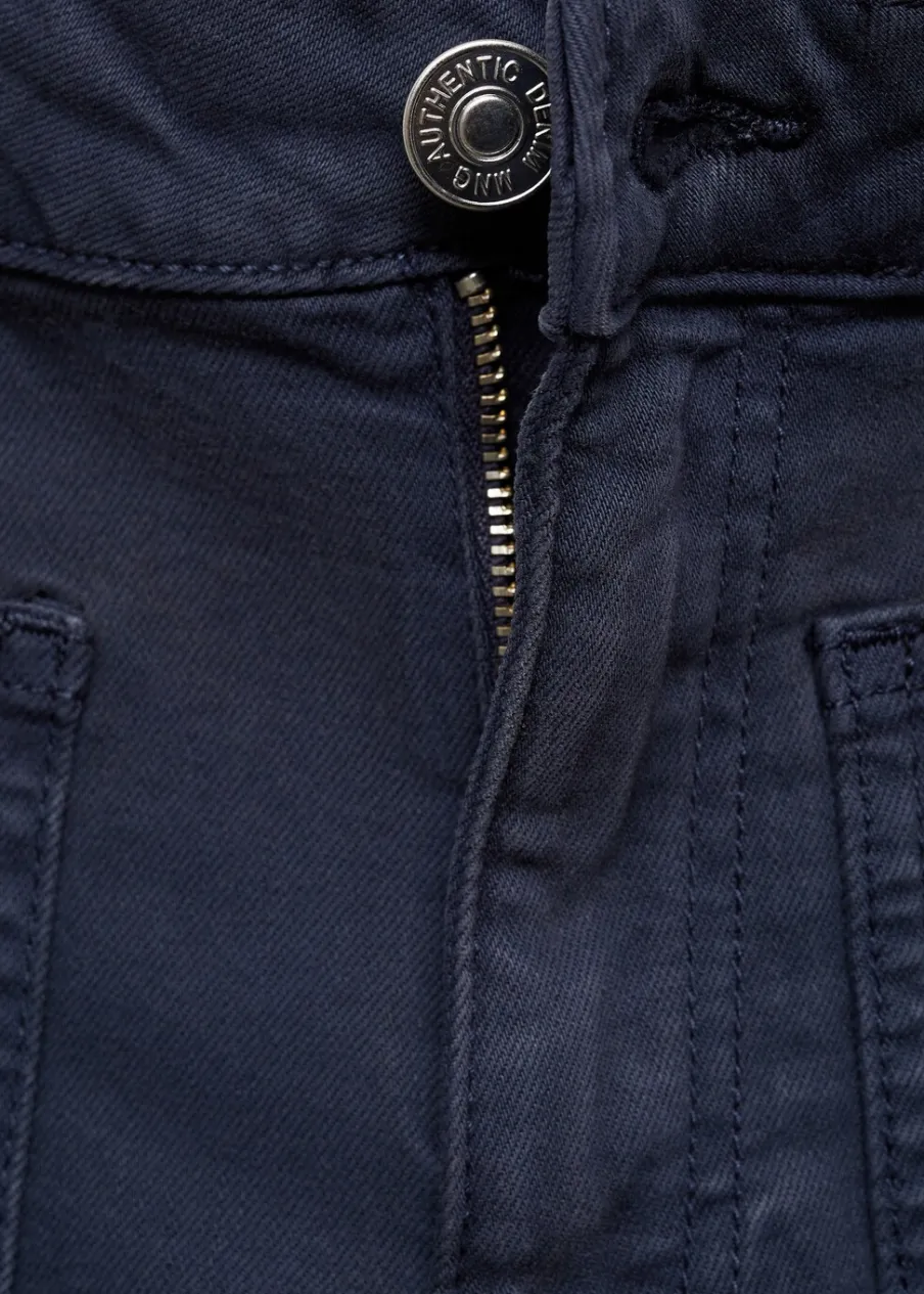 Tkanina bawełniana w dżinsowym stylu. Podwyższony stan. Fason culotte. Dwie kieszenie nakładane z przodu. Dwie kieszenie nakładane z tyłu. Szlufki w pasie. Zapięcie na zamek i guzik z przodu.