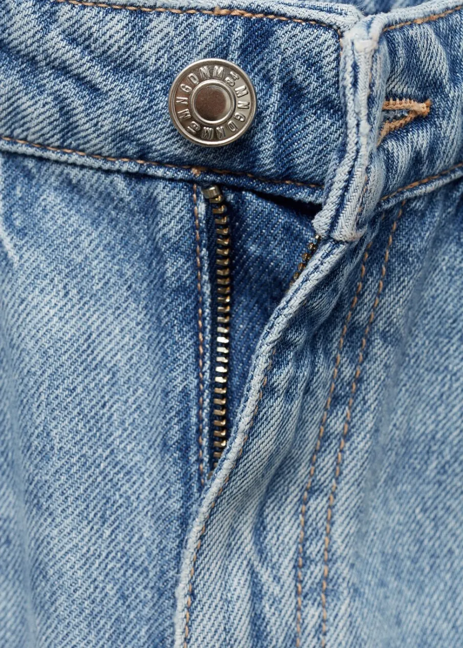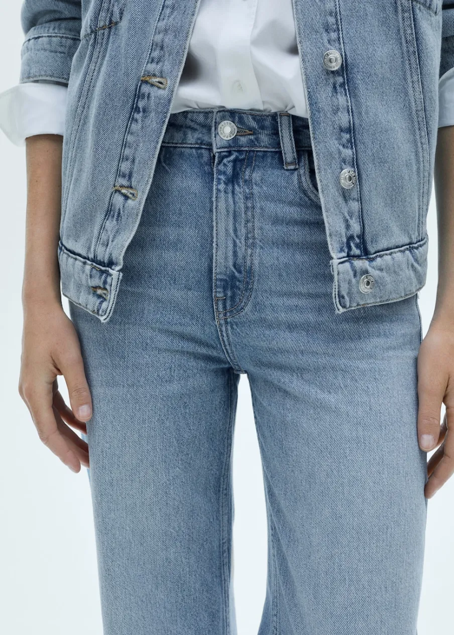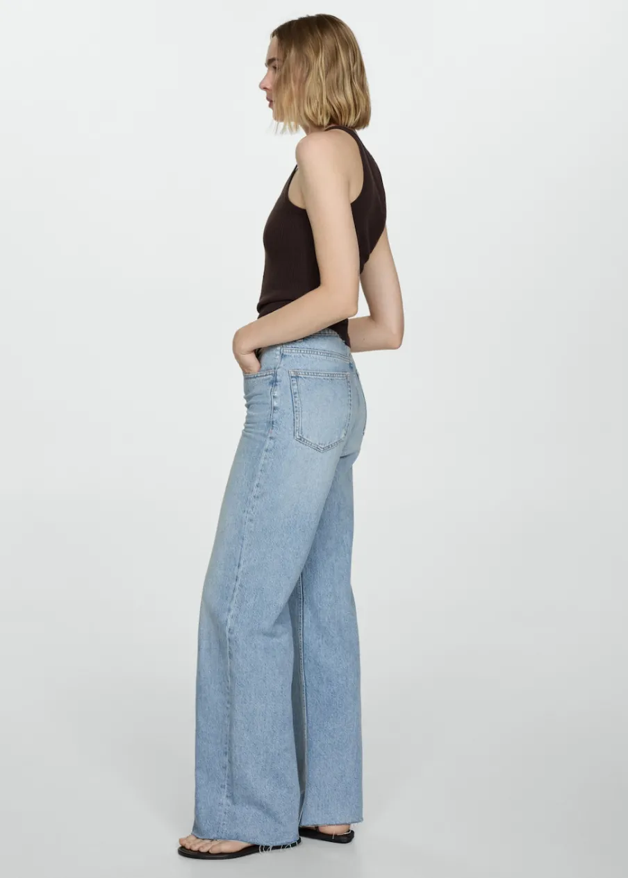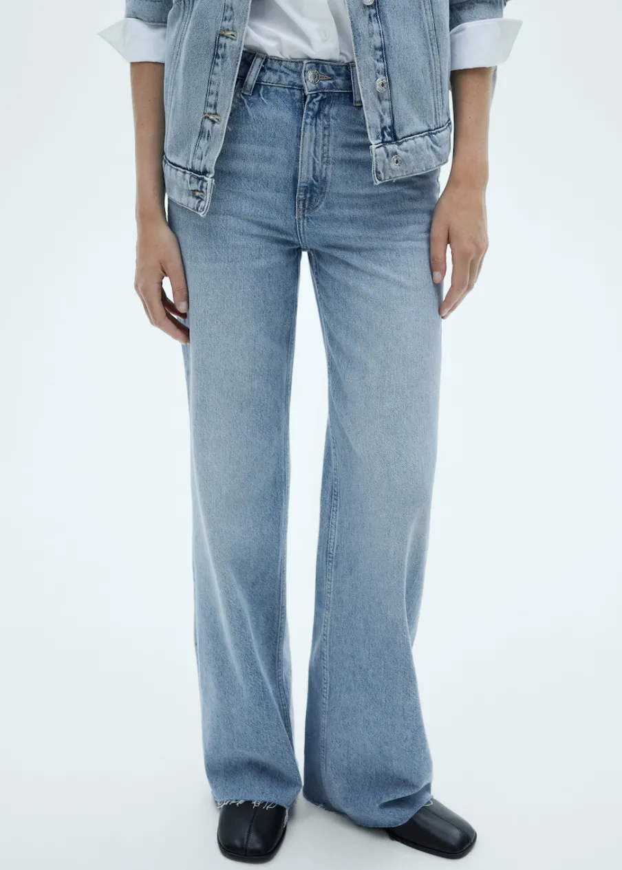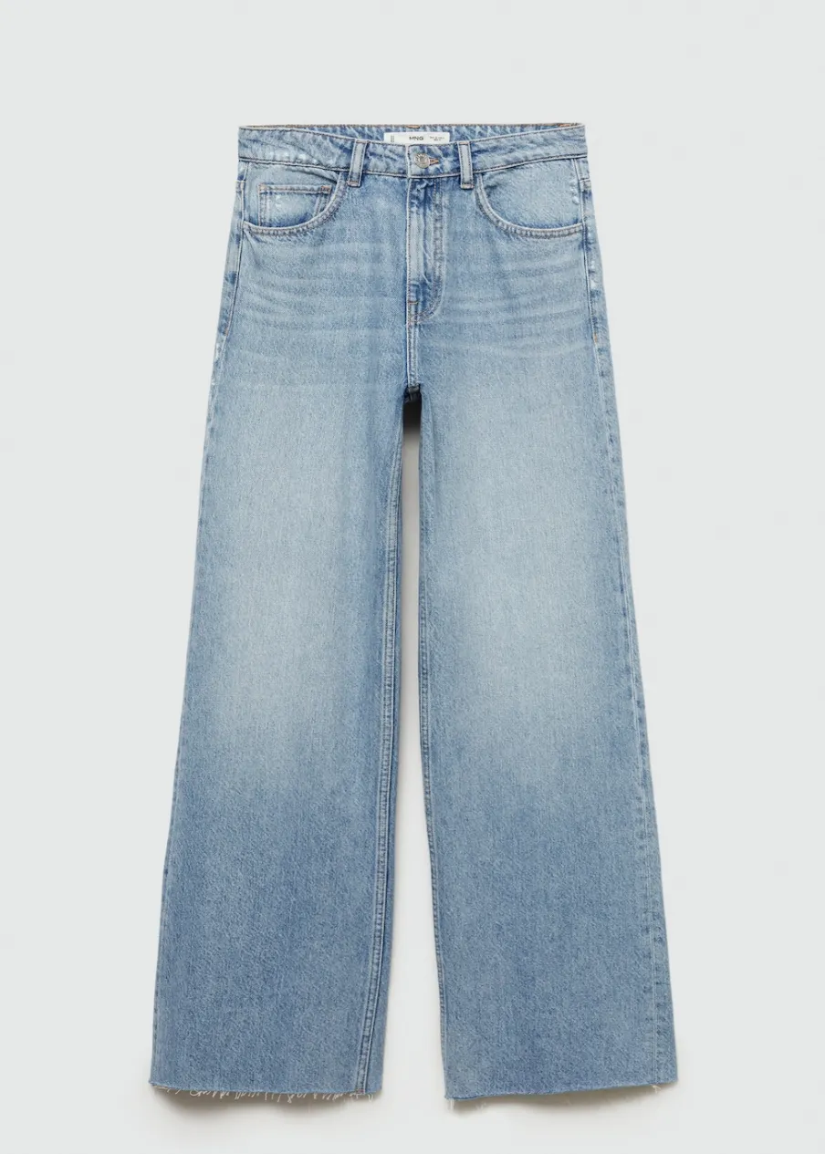 Tkanina bawełniana w dżinsowym stylu. Model długi. Fason wideleg. Pięć kieszeni. Szlufki. Postrzępione nogawki. Modelka ma 178 cm wzrostu i nosi rozmiar S/36. Podwyższony stan. Zapięcie na zamek i guzik z przodu. Długość wewnętrzna 84,5 cm.
