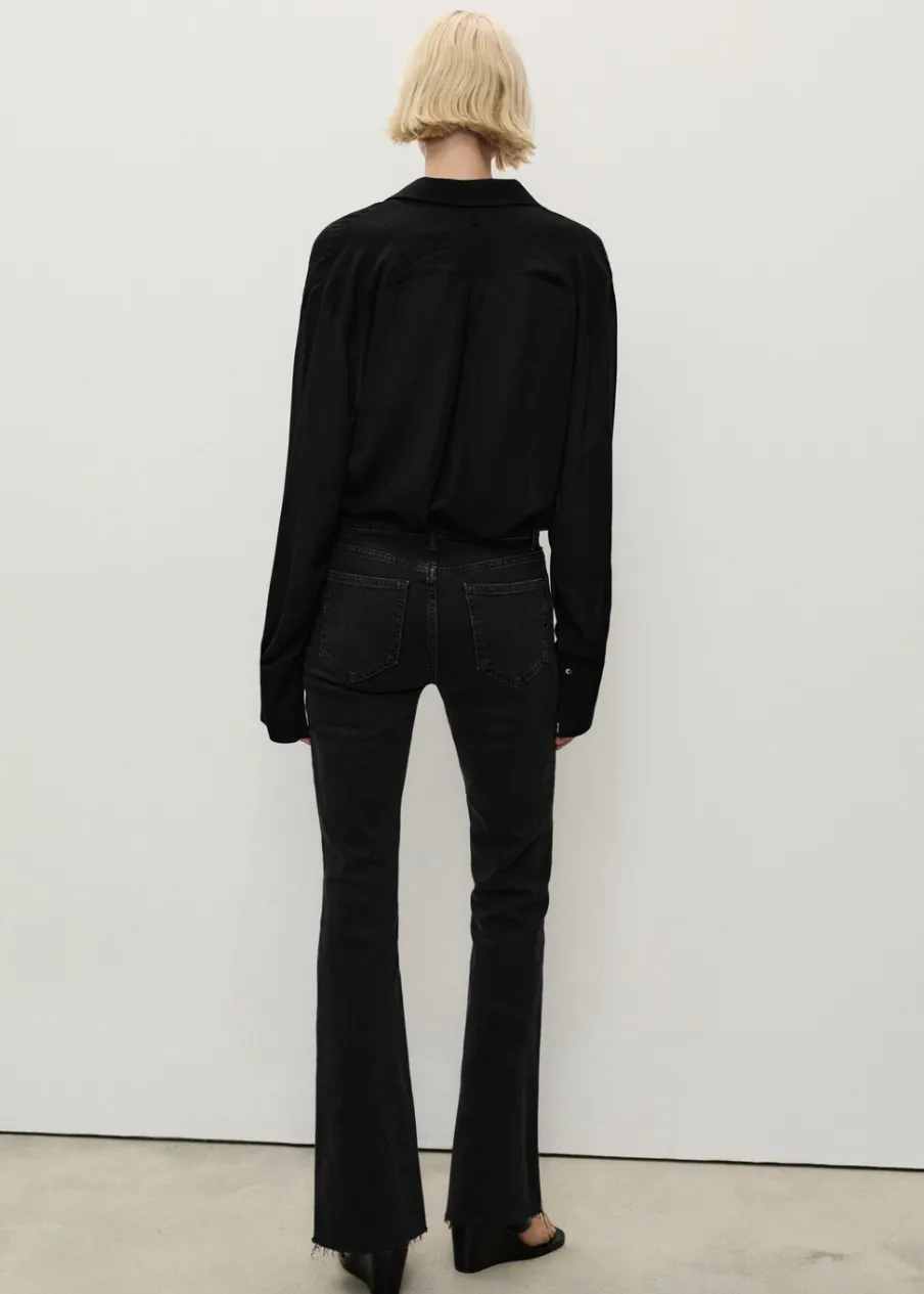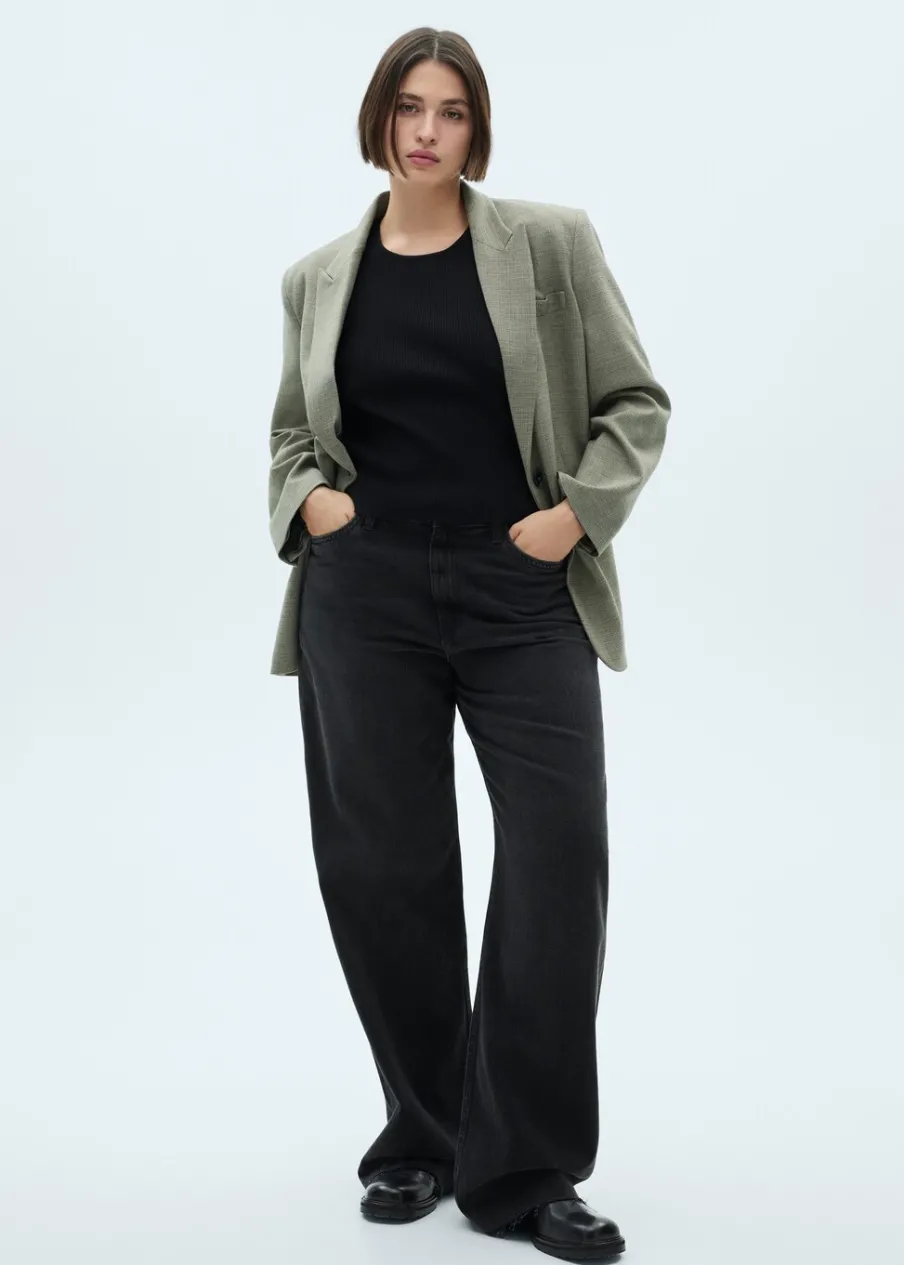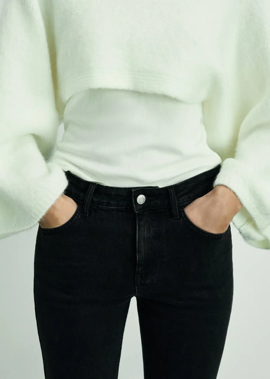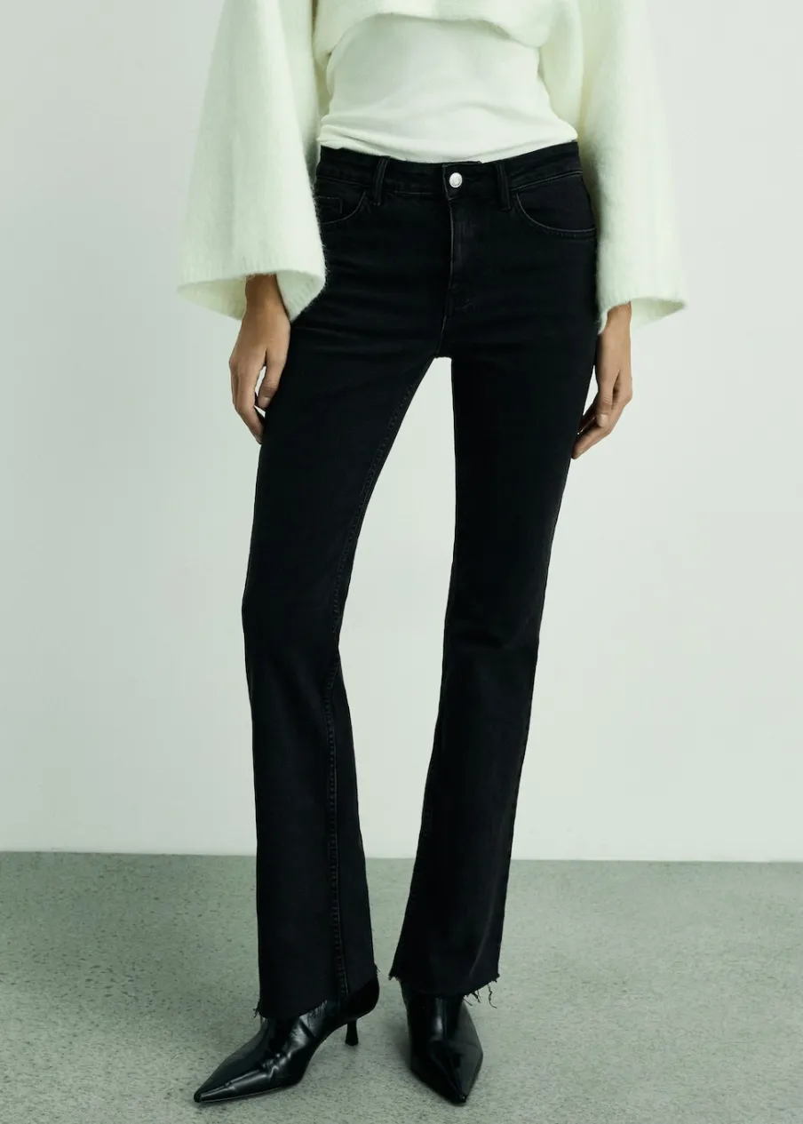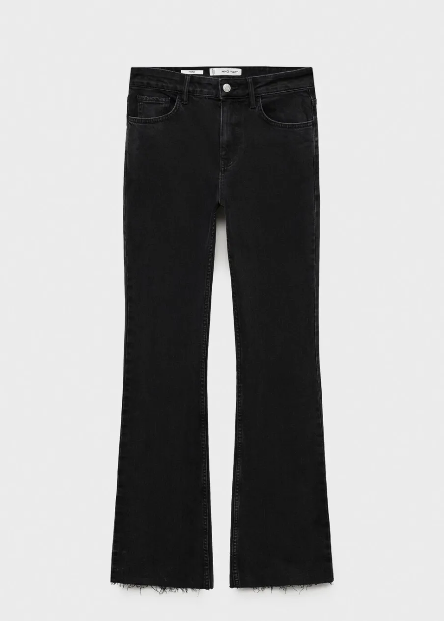 Tkanina bawełniana w dżinsowym stylu. Typu dzwony. Styl flare. Średni stan. Szlufki. Pięć kieszeni. Zapięcie na suwak i guzik. Postrzępione nogawki. Pełna długość. Dostępne w Plus Size. Długość wewnętrzna 83 cm. Modelka ma 179 cm wzrostu i nosi rozmiar S/36.