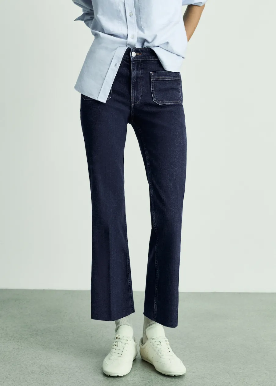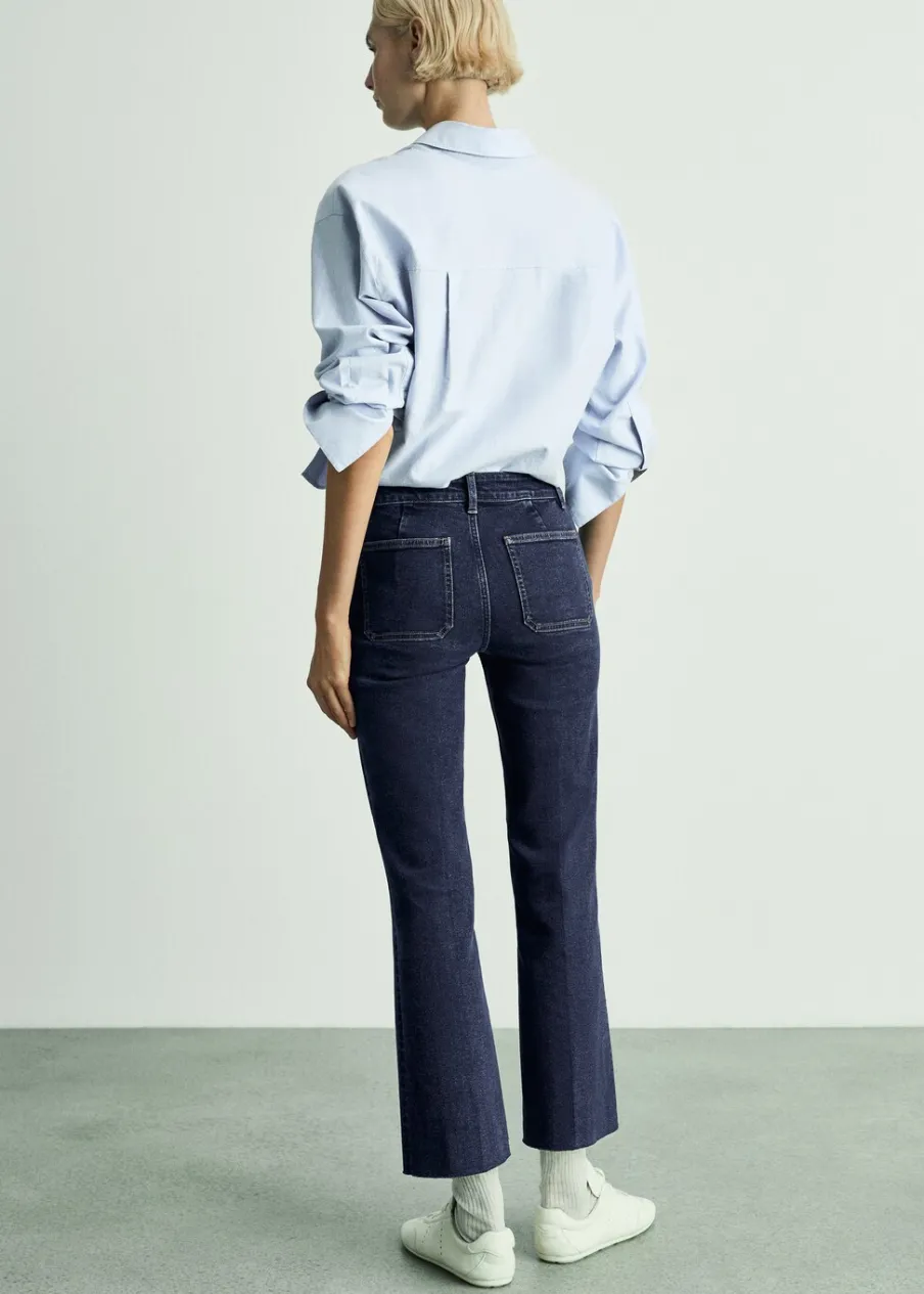 Tkanina bawełniana w dżinsowym stylu. Średni stan. Model długi. Dwie kieszenie nakładane z przodu. Dwie kieszenie nakładane z tyłu. Szlufki. Rozszerzany model. Zapięcie na zamek i guzik z przodu. Długość wewnętrzna 70 cm. Modelka ma 179 cm wzrostu i nosi rozmiar S/36.