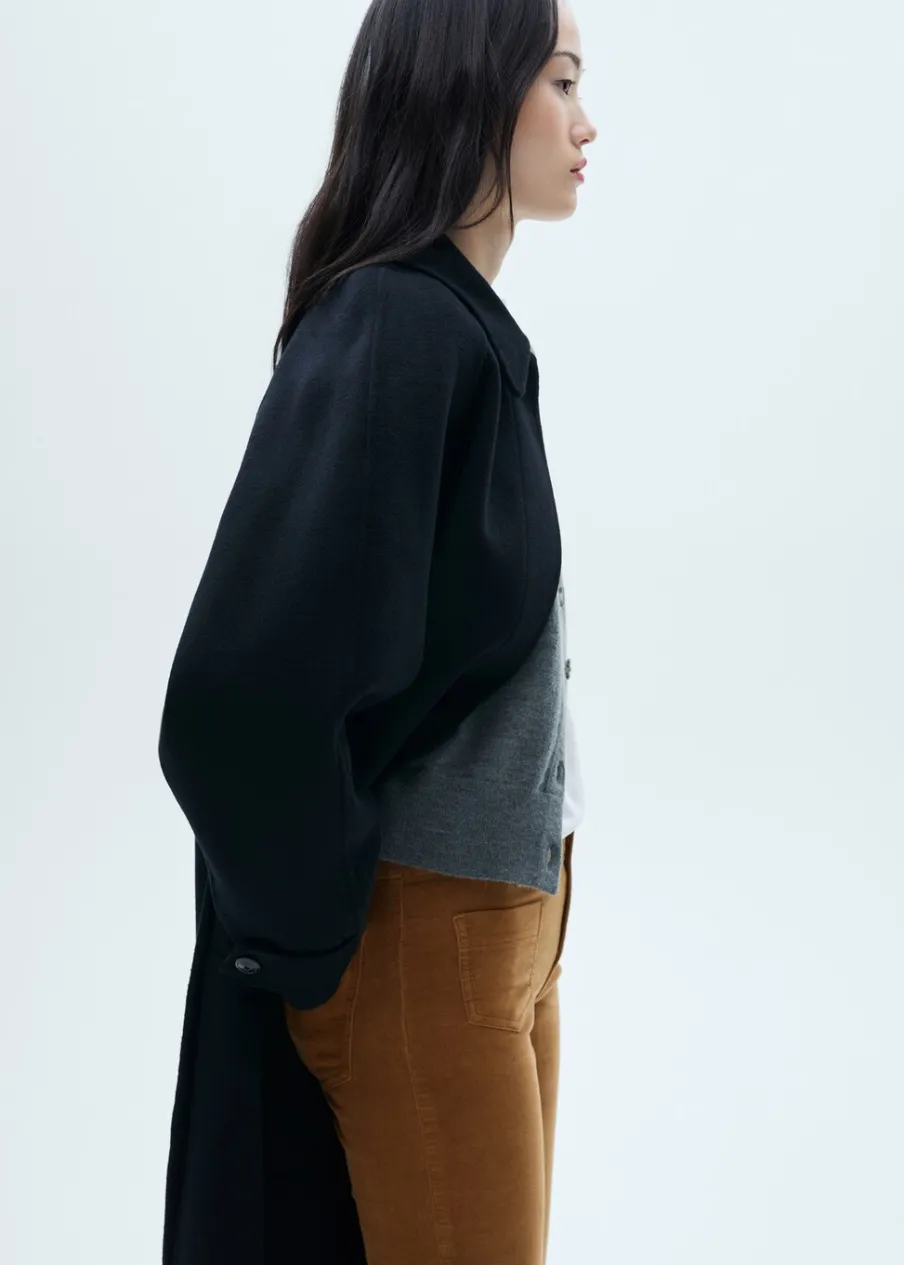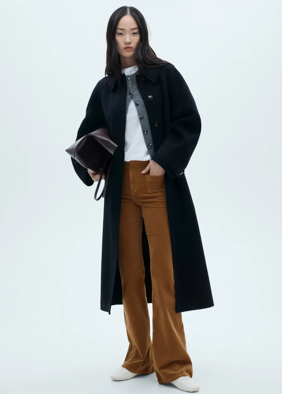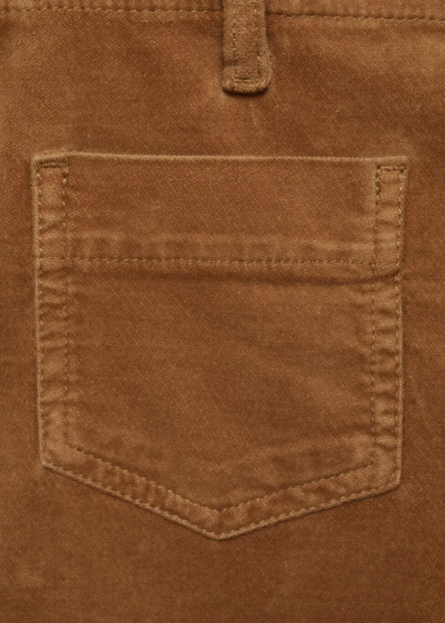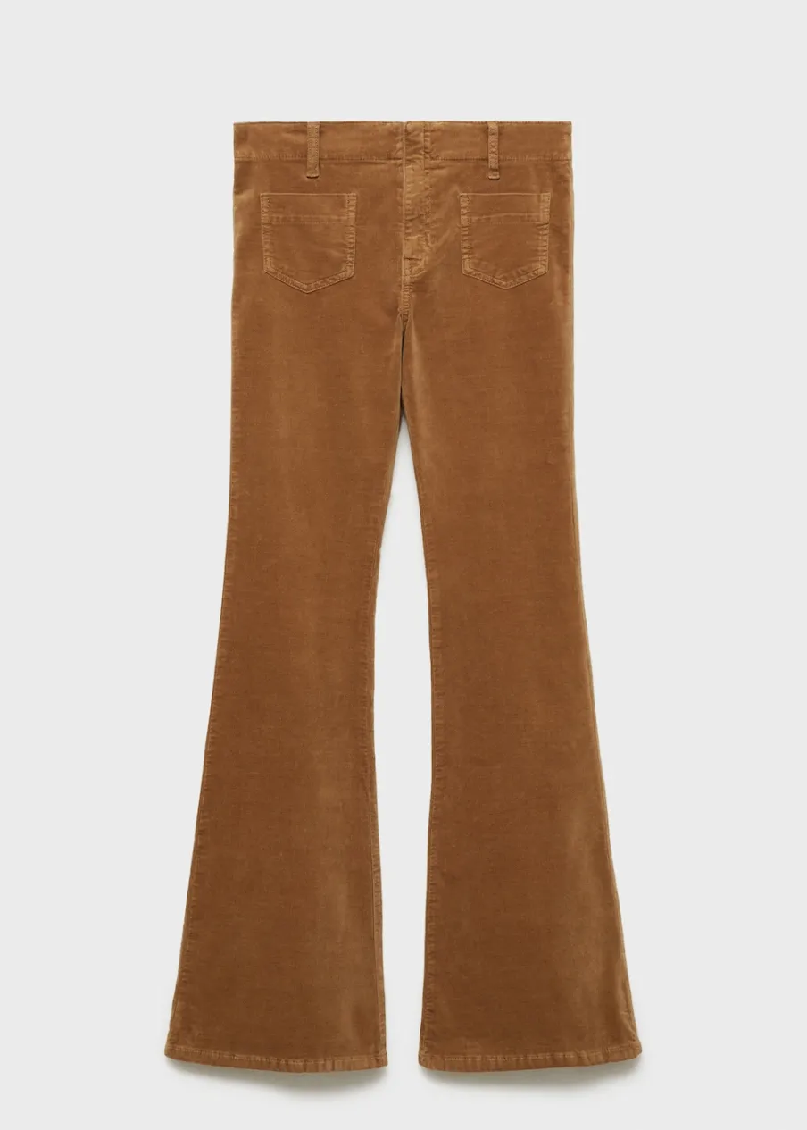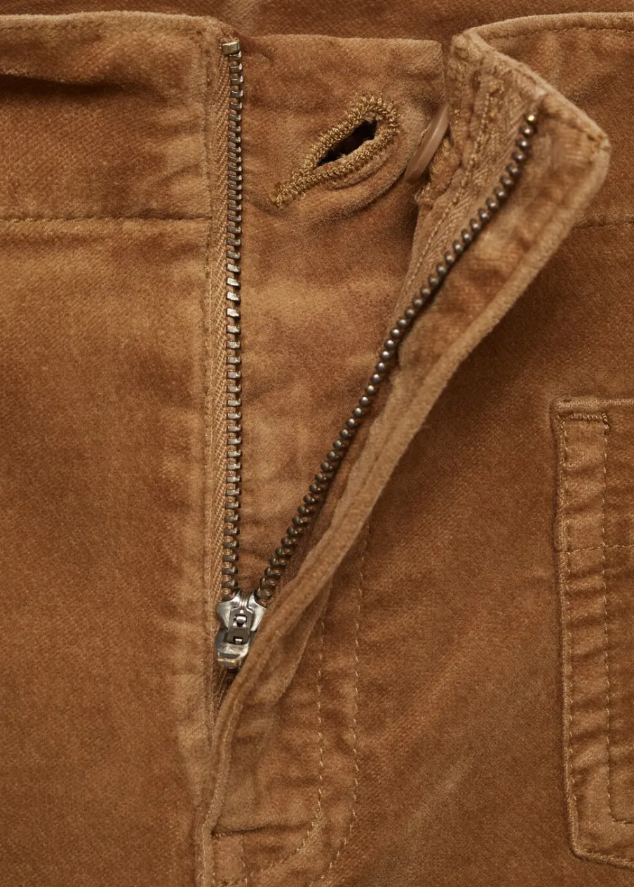 Sztruksowa tkanina. Rozszerzany model. Średni stan. Szlufki. Dwie kieszenie nakładane z przodu. Dwie kieszenie nakładane z tyłu. Kryte zapięcie na guzik, haftkę i suwak. Model długi. Modelka ma 175 cm wzrostu i nosi rozmiar S/36.