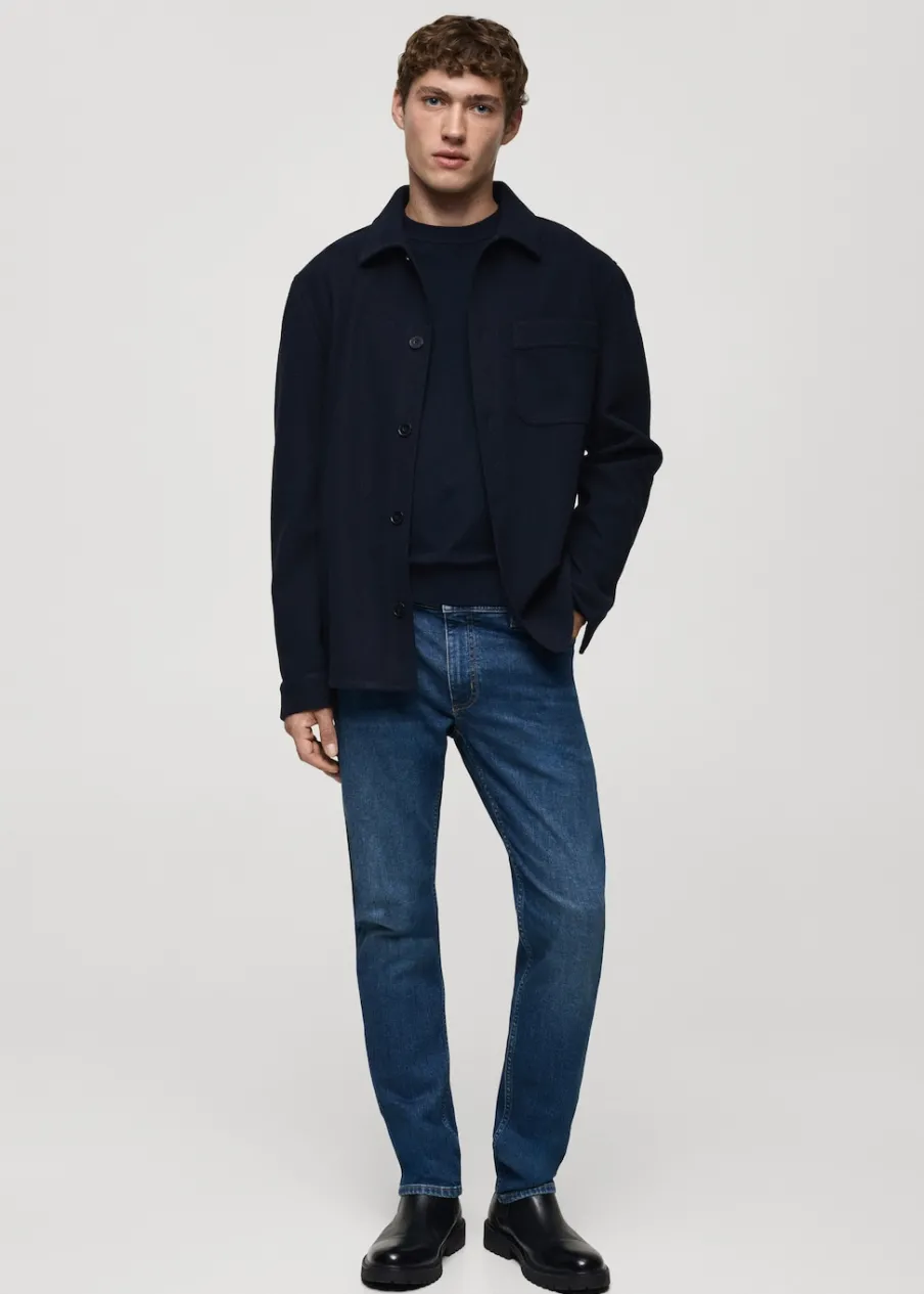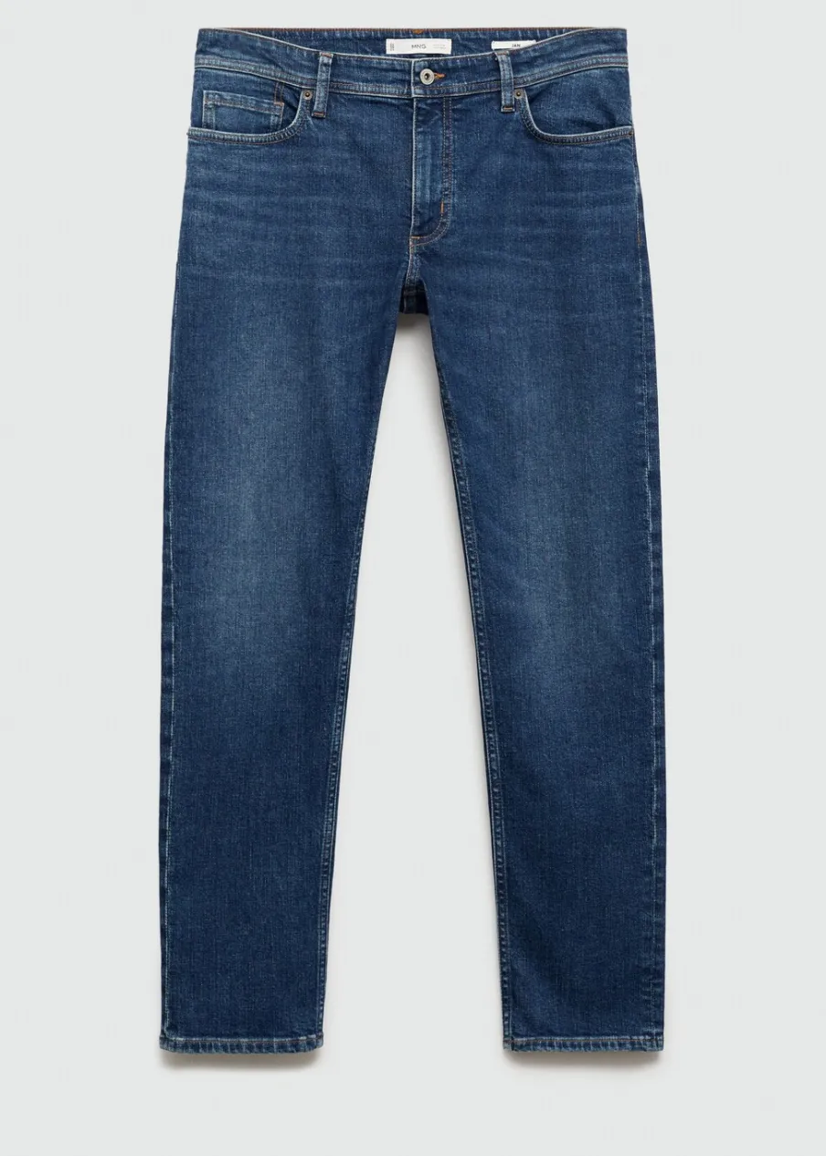 Slim-fit. Tkanina mieszana ze zrównoważoną bawełną. Jeansowy styl. Średni stan. Szlufki na pasek. Zapięcie na suwak i guzik. Dwie kieszenie boczne. Kieszeń na bilon. Dwie kieszenie nakładane z tyłu. Model ma 185 cm wzrostu i nosi rozmiar 42.