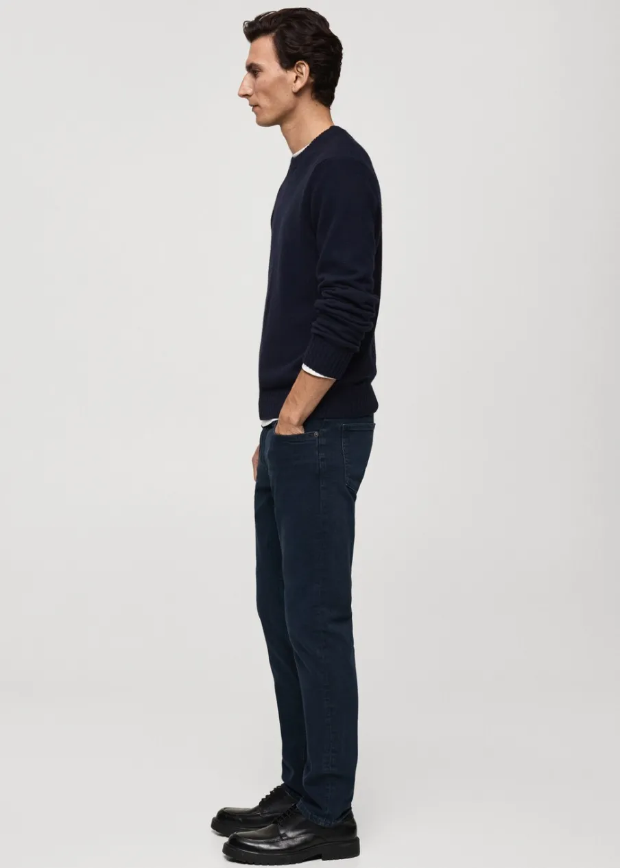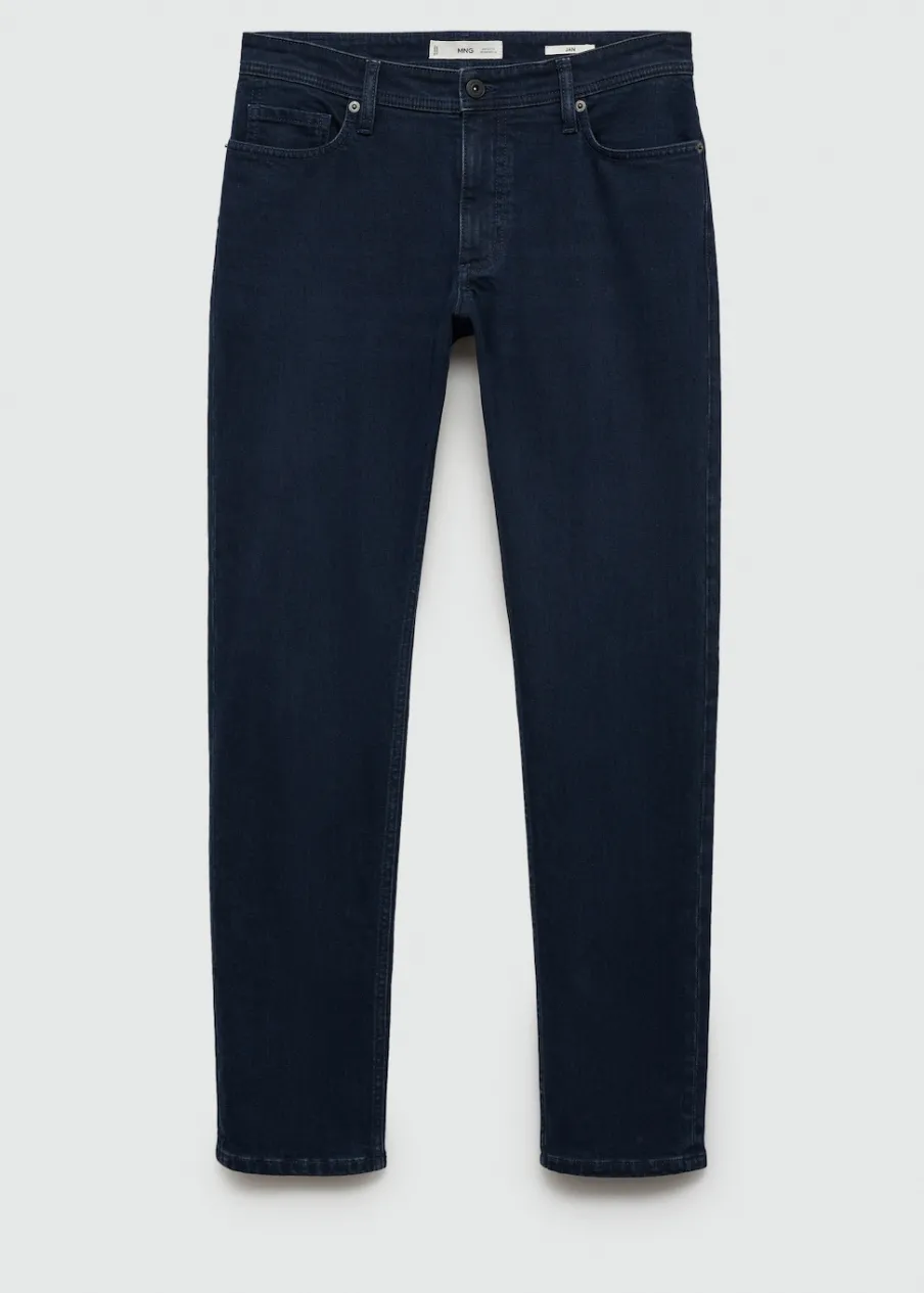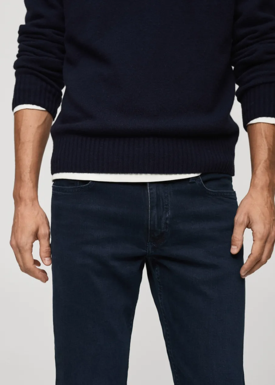 OpisSlim-fit. Tkanina bawełniana. Ciemnoniebieski. Średni stan. Szlufki na pasek. Zapięcie na suwak i guzik. Dwie kie…