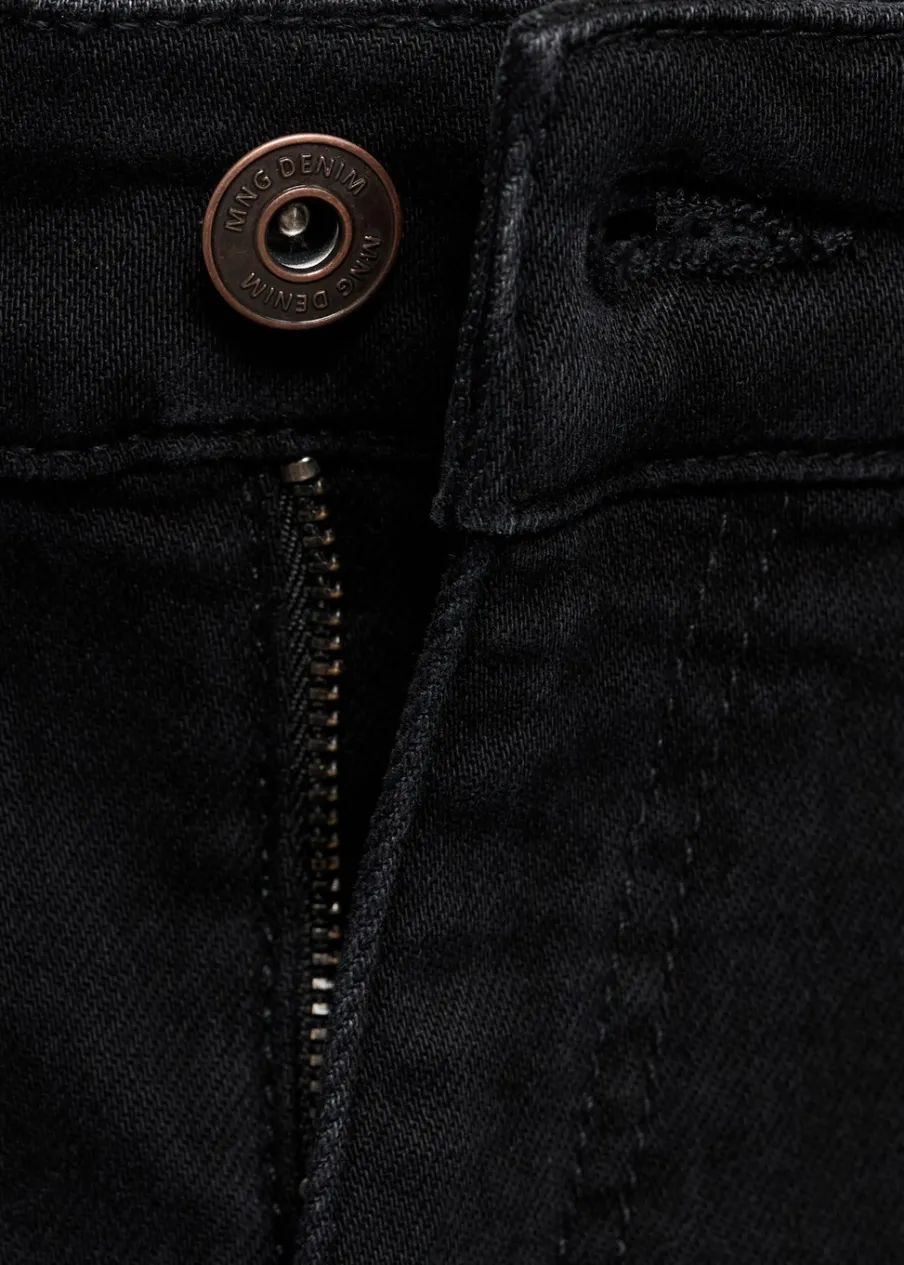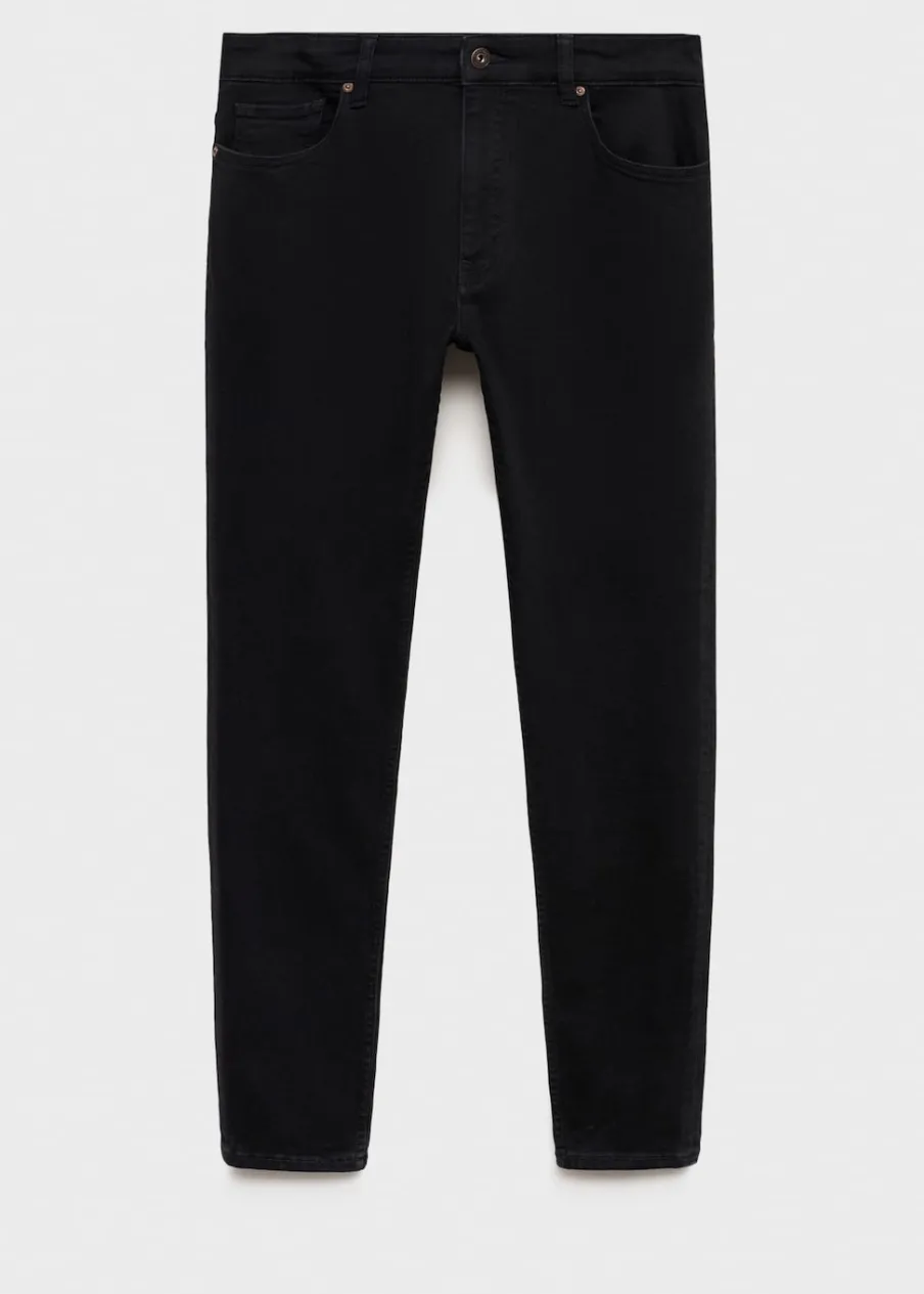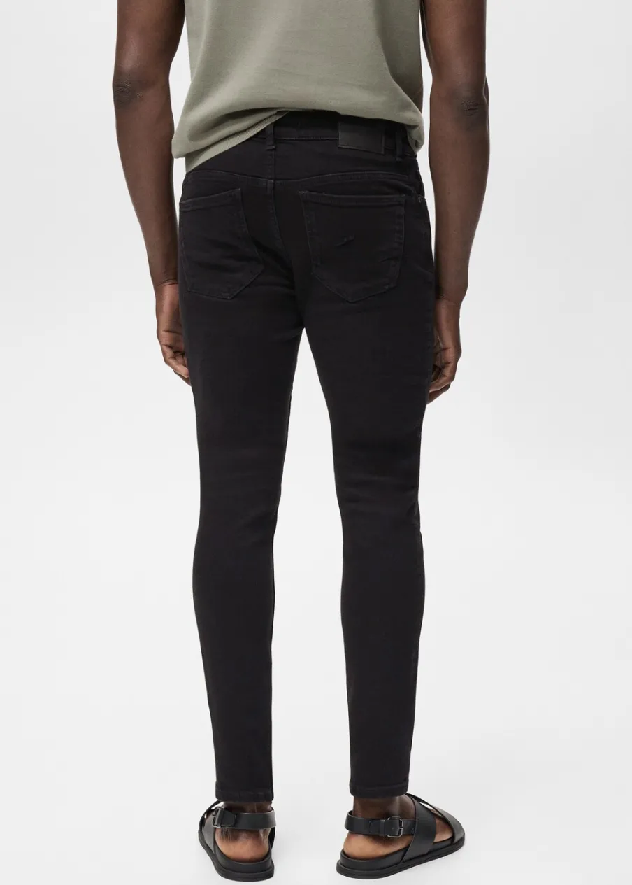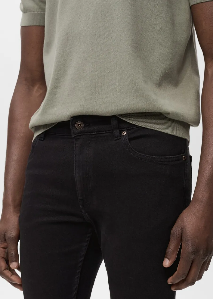 Krój skinny: jeansy bardziej dopasowane. Jeansowy styl. Tkanina bawełniana. Czarny. Szlufki na pasek. Zapięcie na suwak i guzik. Dwie kieszenie boczne. Kieszeń na bilon. Dwie kieszenie nakładane z tyłu. Model ma 185 cm wzrostu i nosi rozmiar 42.