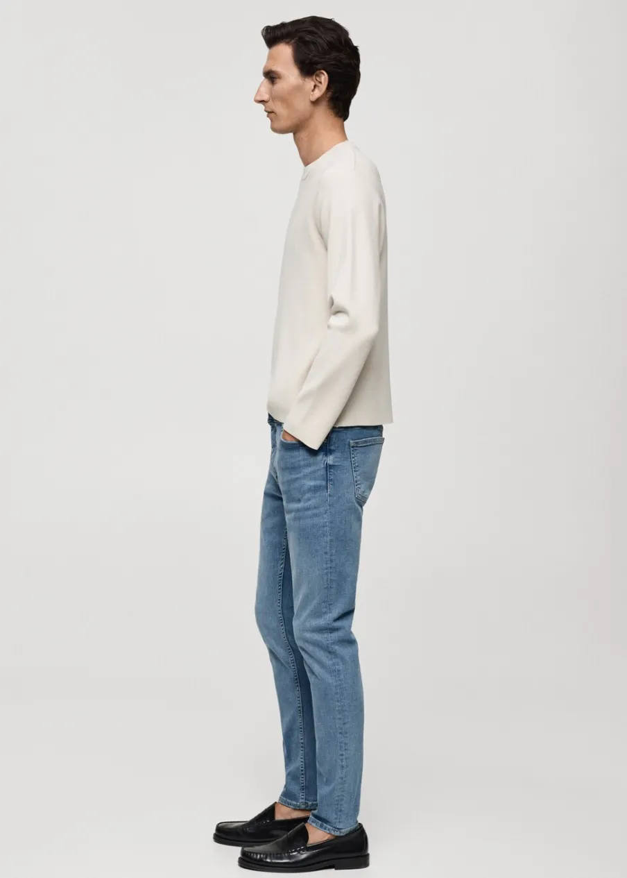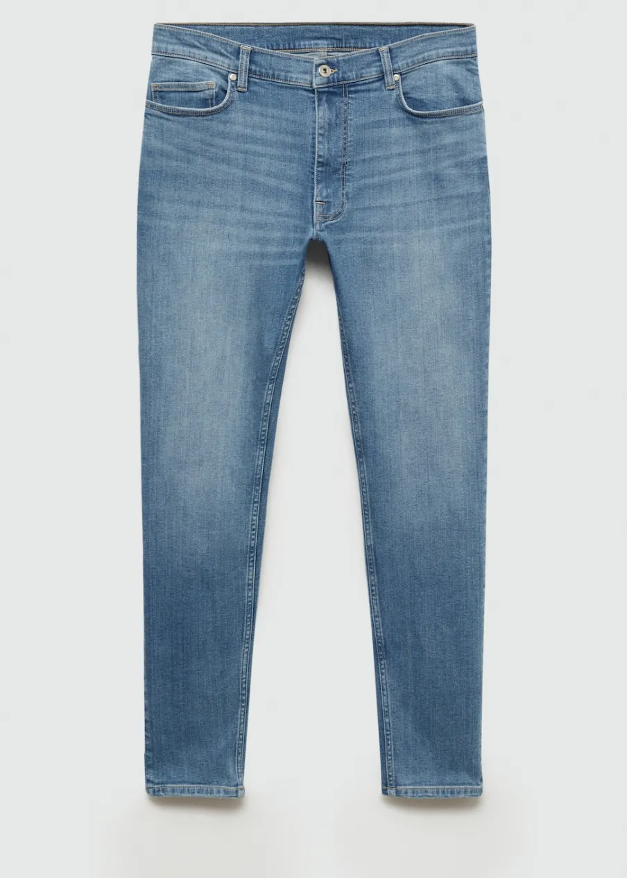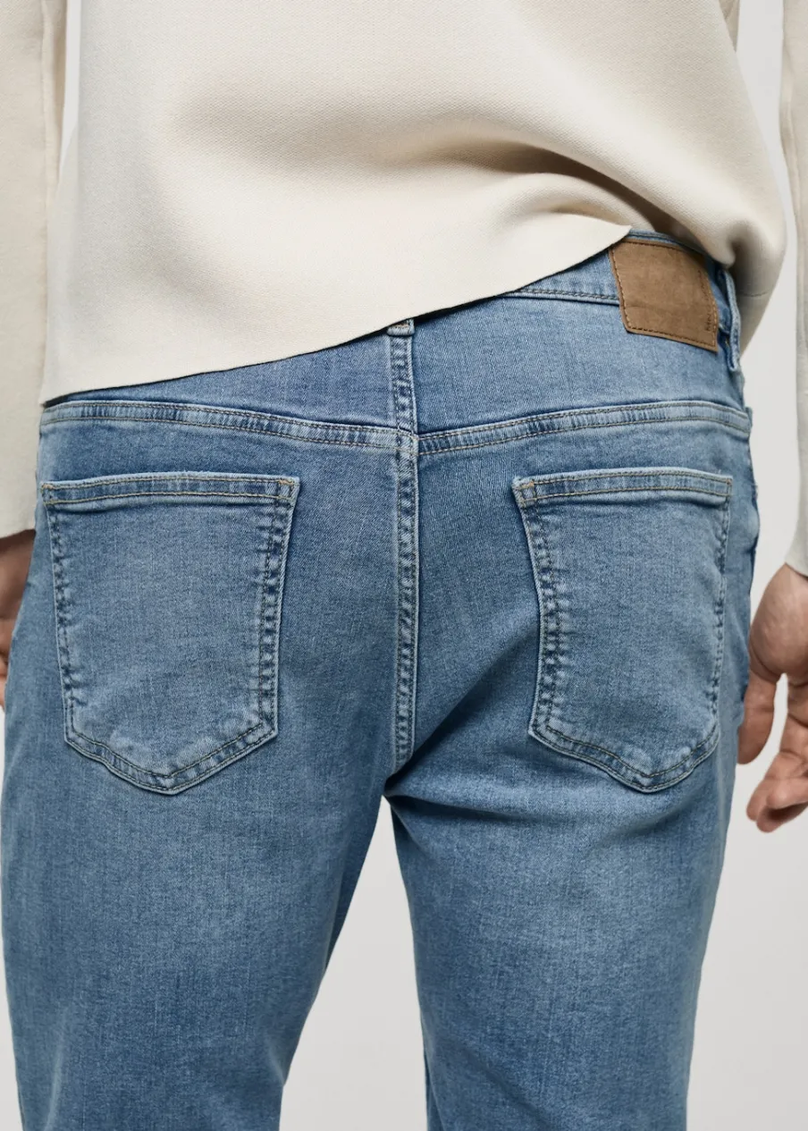 Krój skinny: jeansy bardziej dopasowane. Tkanina bawełniana. Jeansowy styl. Średni stan. Szlufki na pasek. Zapięcie na suwak i guzik. Kieszeń na bilon. Dwie kieszenie nakładane z tyłu. Model ma 185 cm wzrostu i nosi rozmiar 42.