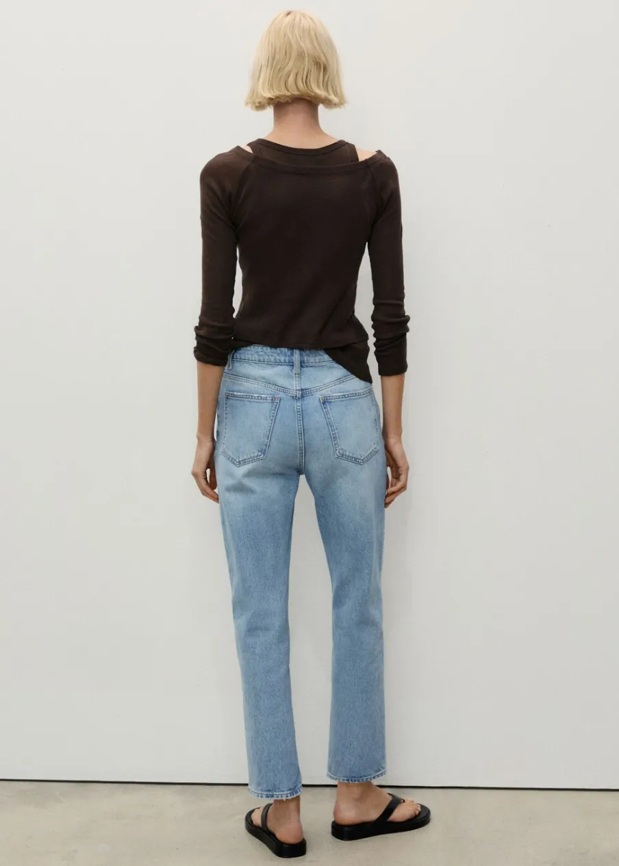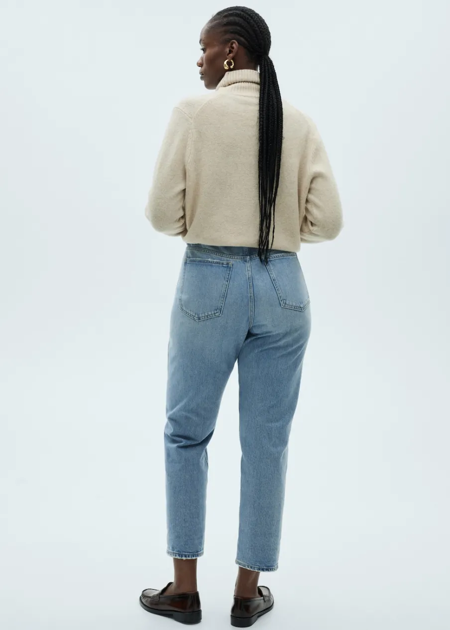 OpisTkanina bawełniana w dżinsowym stylu. Mom-fit. Podwyższony stan. Szlufki. Pięć kieszeni. Zapięcie na zamek i g…