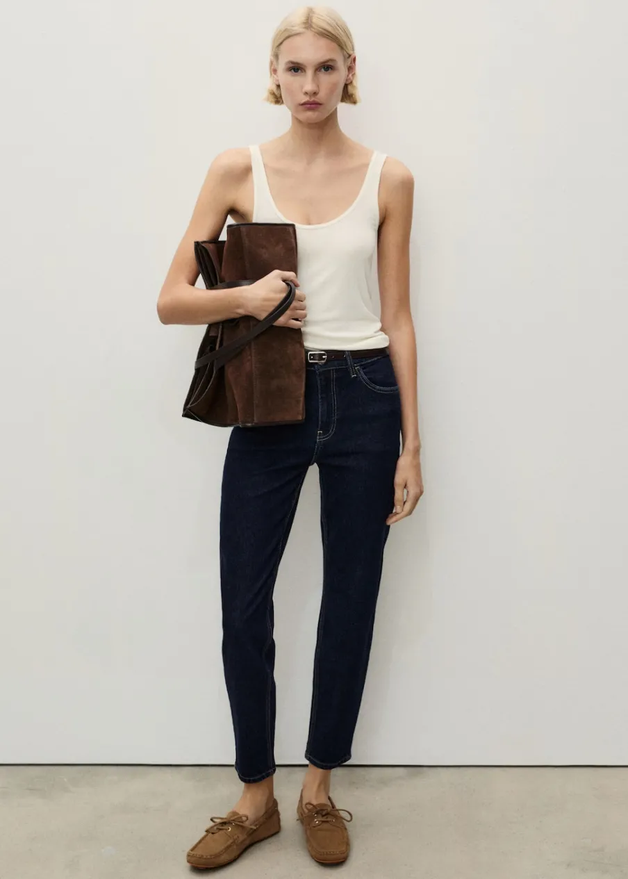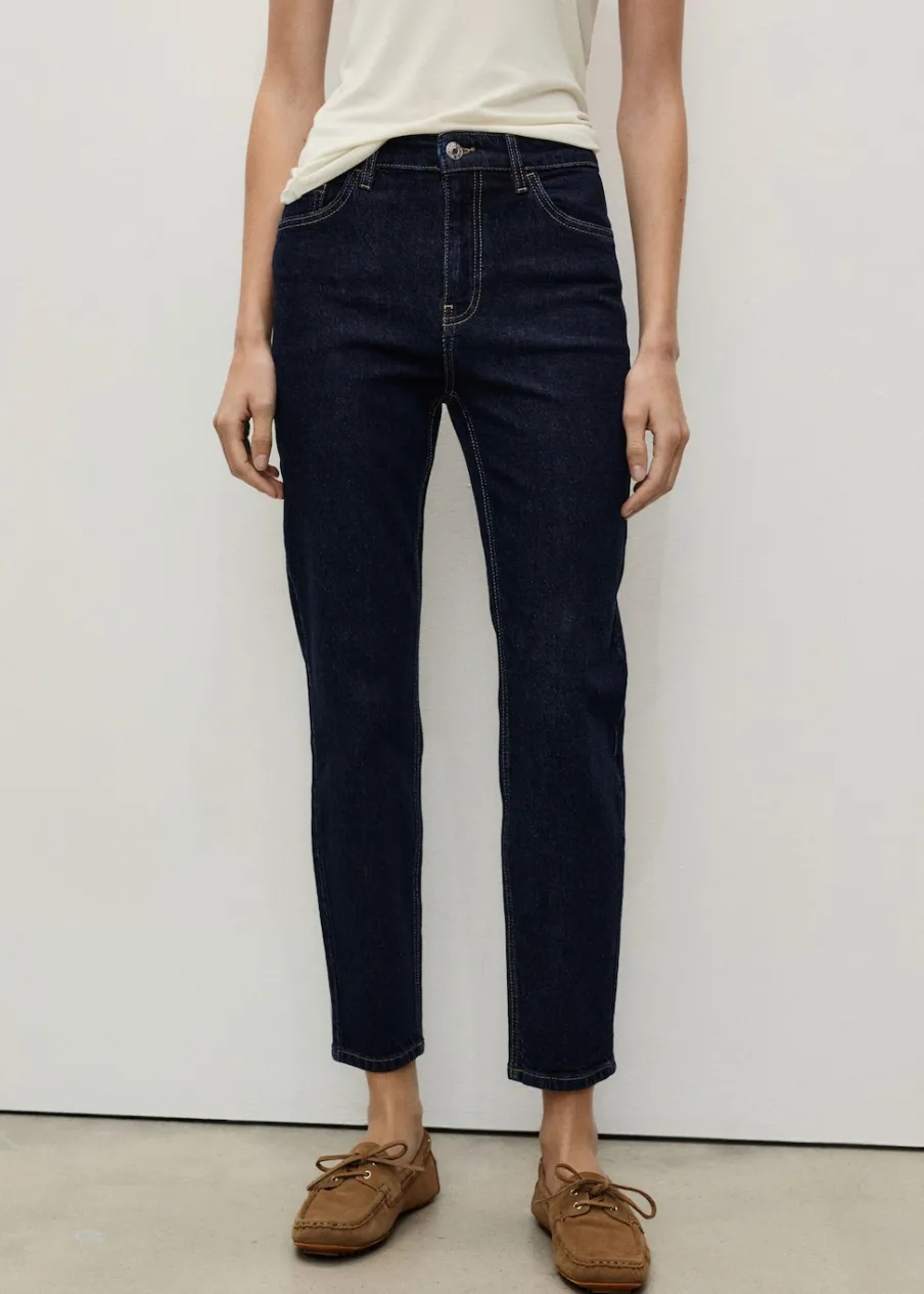 Tkanina bawełniana w dżinsowym stylu. Elastyczna tkanina. Mom-fit. Podwyższony stan. Szlufki. Pięć kieszeni. Zapięcie na suwak i guzik. Dostępne w Plus Size. Długość wewnętrzna 70 cm. Modelka ma 179 cm wzrostu i nosi rozmiar S/36.