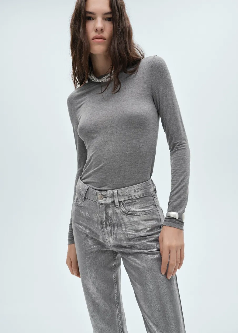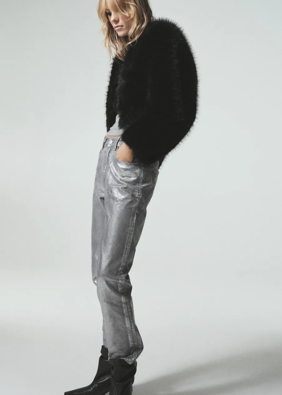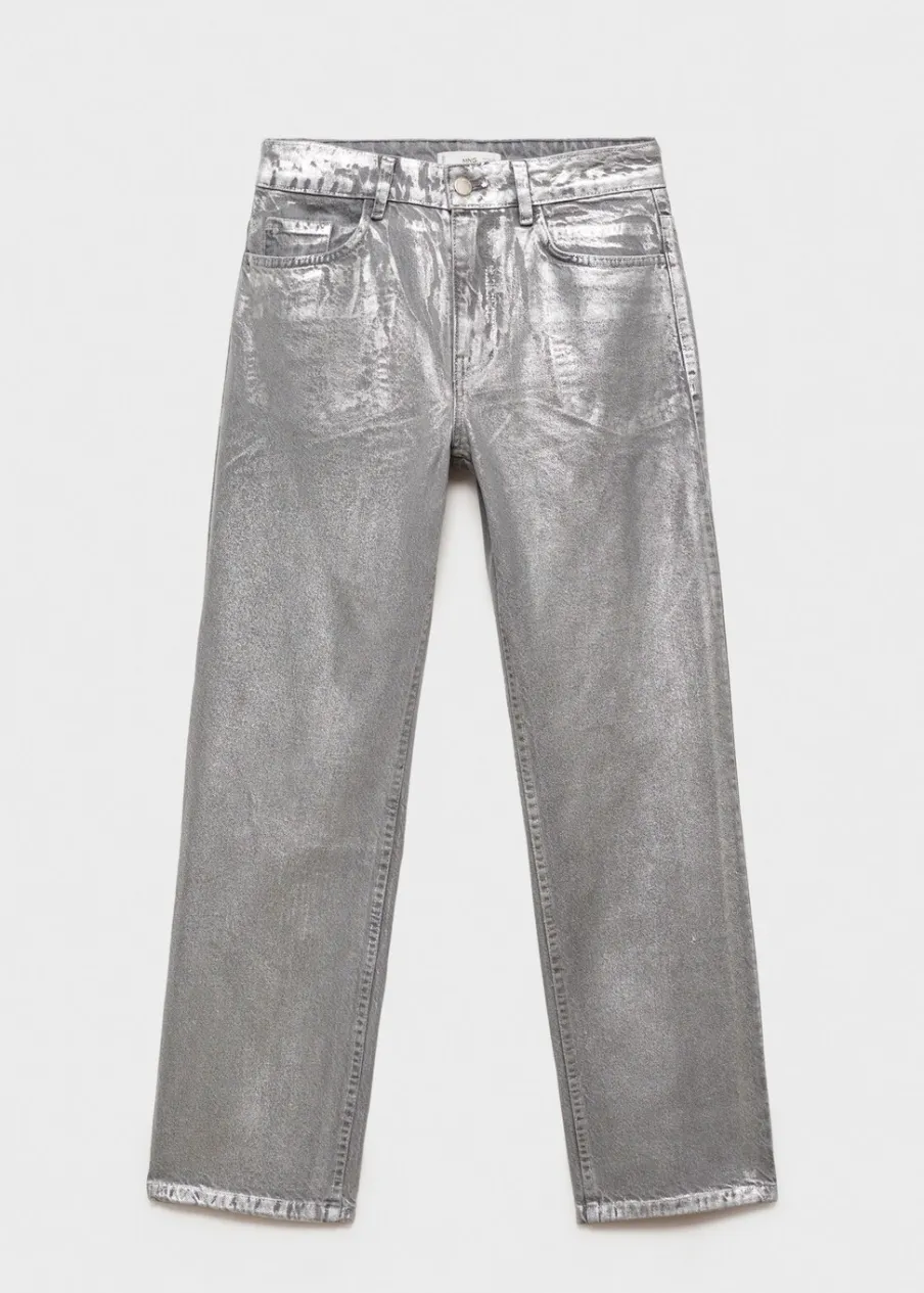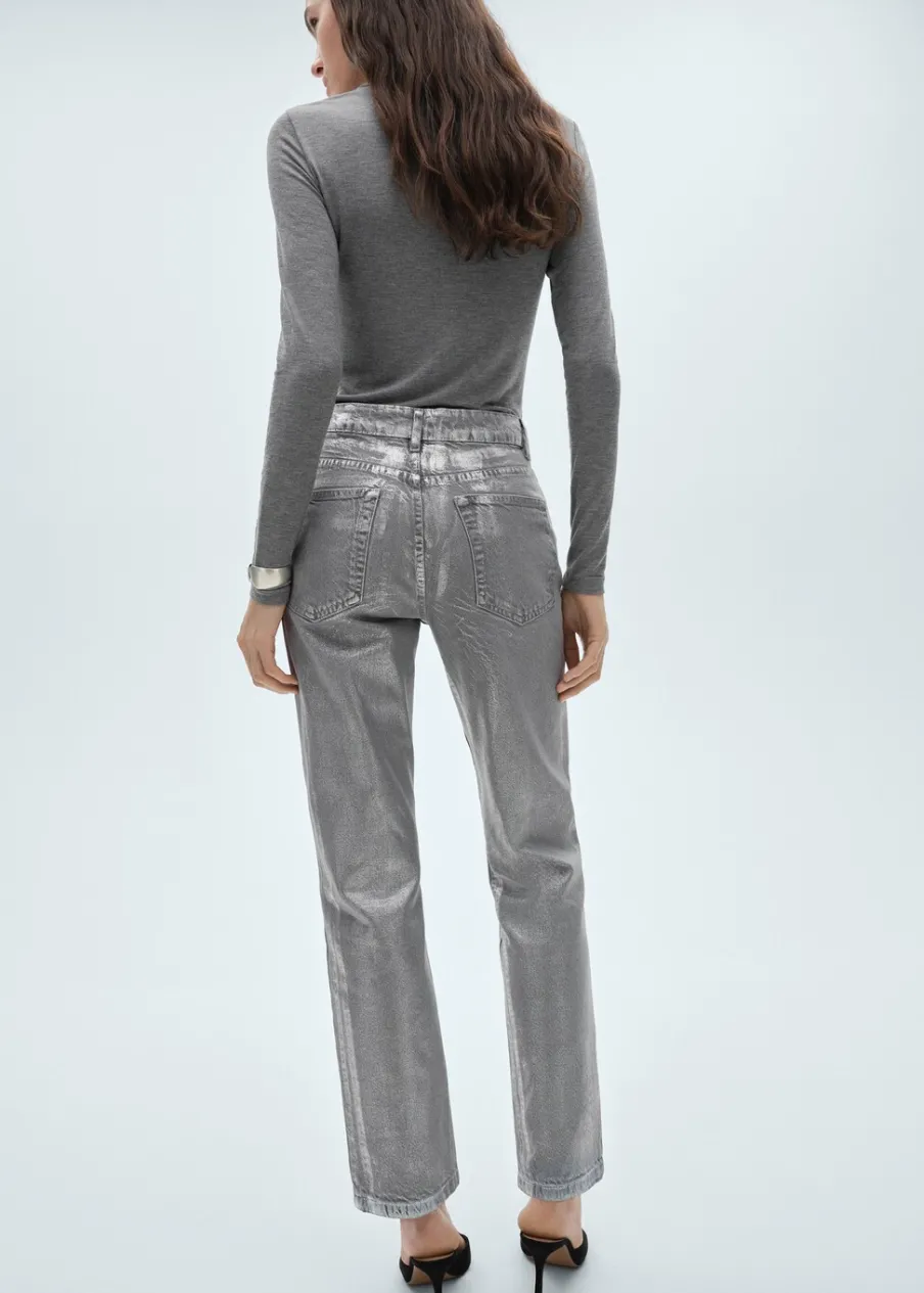 OpisTkanina bawełniana w dżinsowym stylu. Metaliczny efekt. Model prosty. Podwyższony stan. Szlufki. Pięć kieszeni….