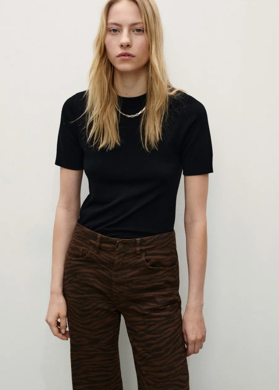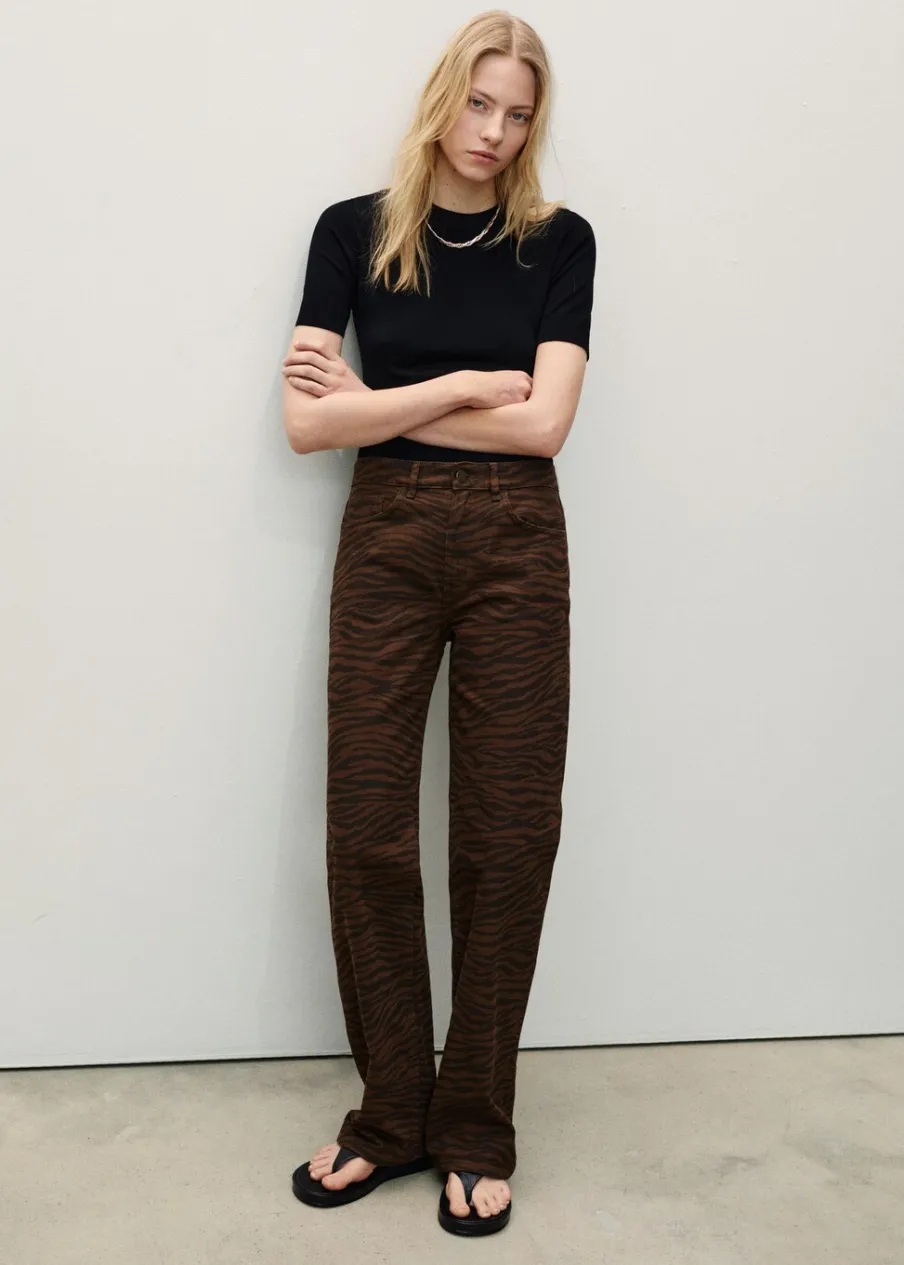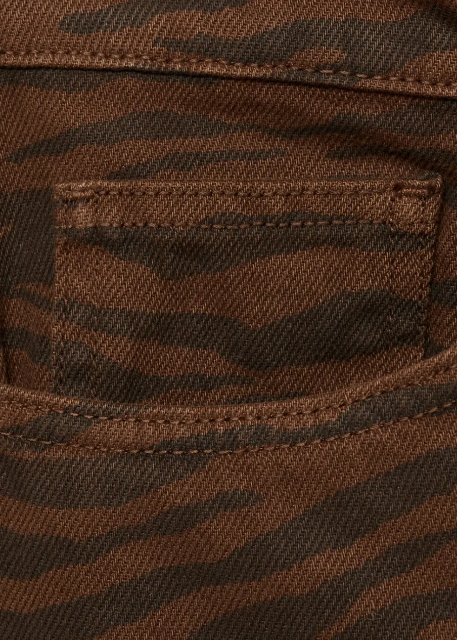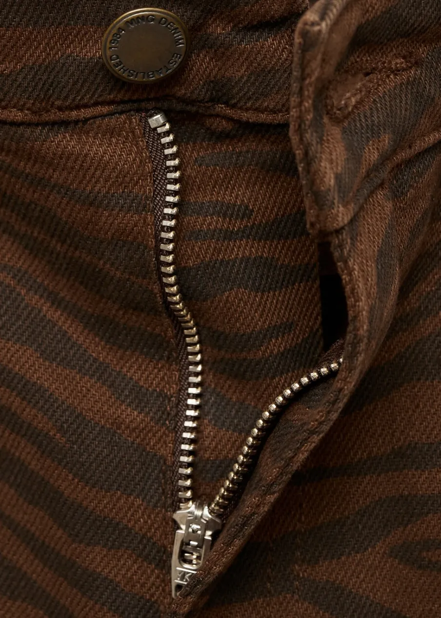 Bawełna 100%. Tkanina denim. Model prosty. Model standardowy. Model długi. Zwierzęcy wzór. Wzór w zebrę. Podwyższony stan. Pięć kieszeni. Zapięcie na zamek i guzik z przodu. Szlufki.