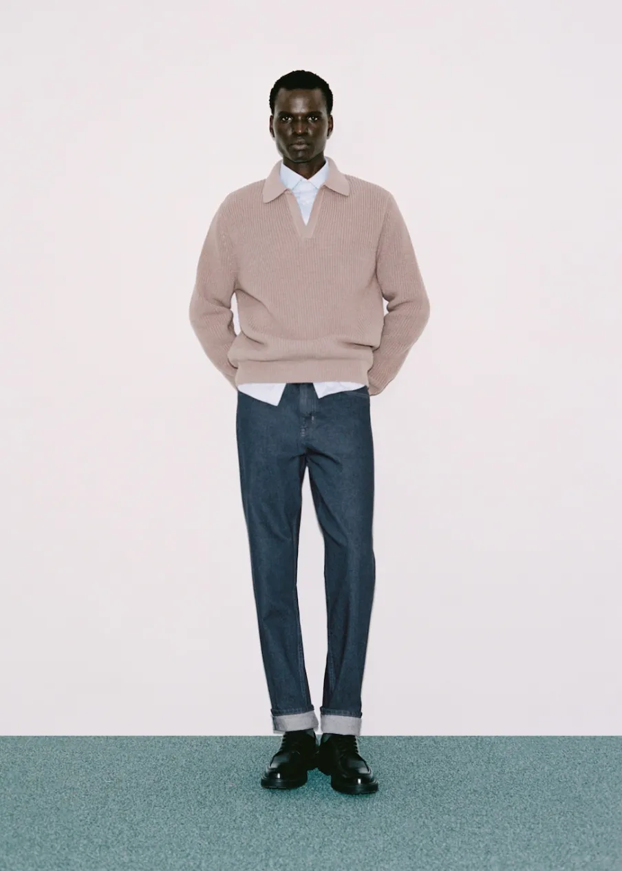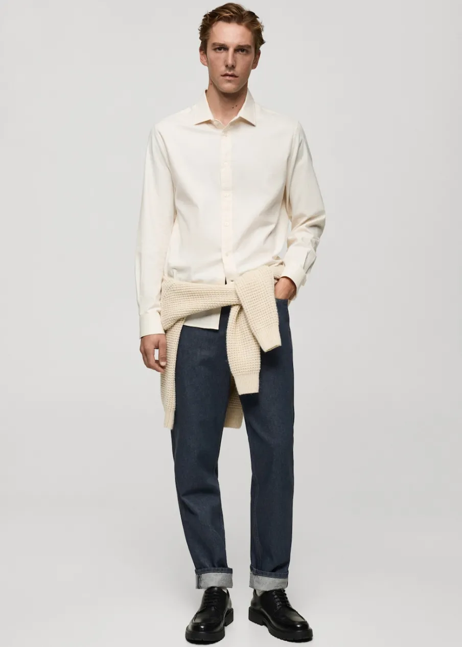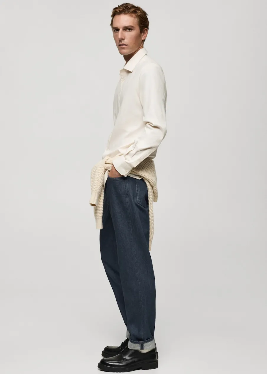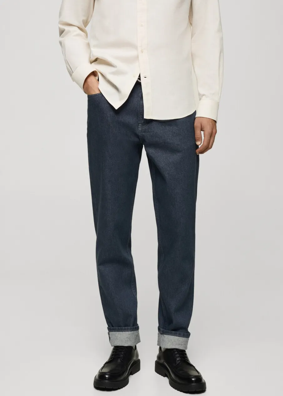 Krój regular. Tkanina bawełniana z recyklingu. Zapięcie na suwak i guzik. Szlufki na pasek. Kieszeń na bilon. Dwie kieszenie nakładane z tyłu. Prosty dół. Model ma 185 cm wzrostu i nosi rozmiar 42. Dwie kieszenie nakładane z przodu.
