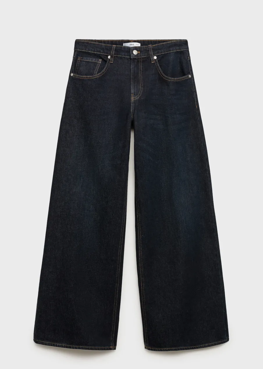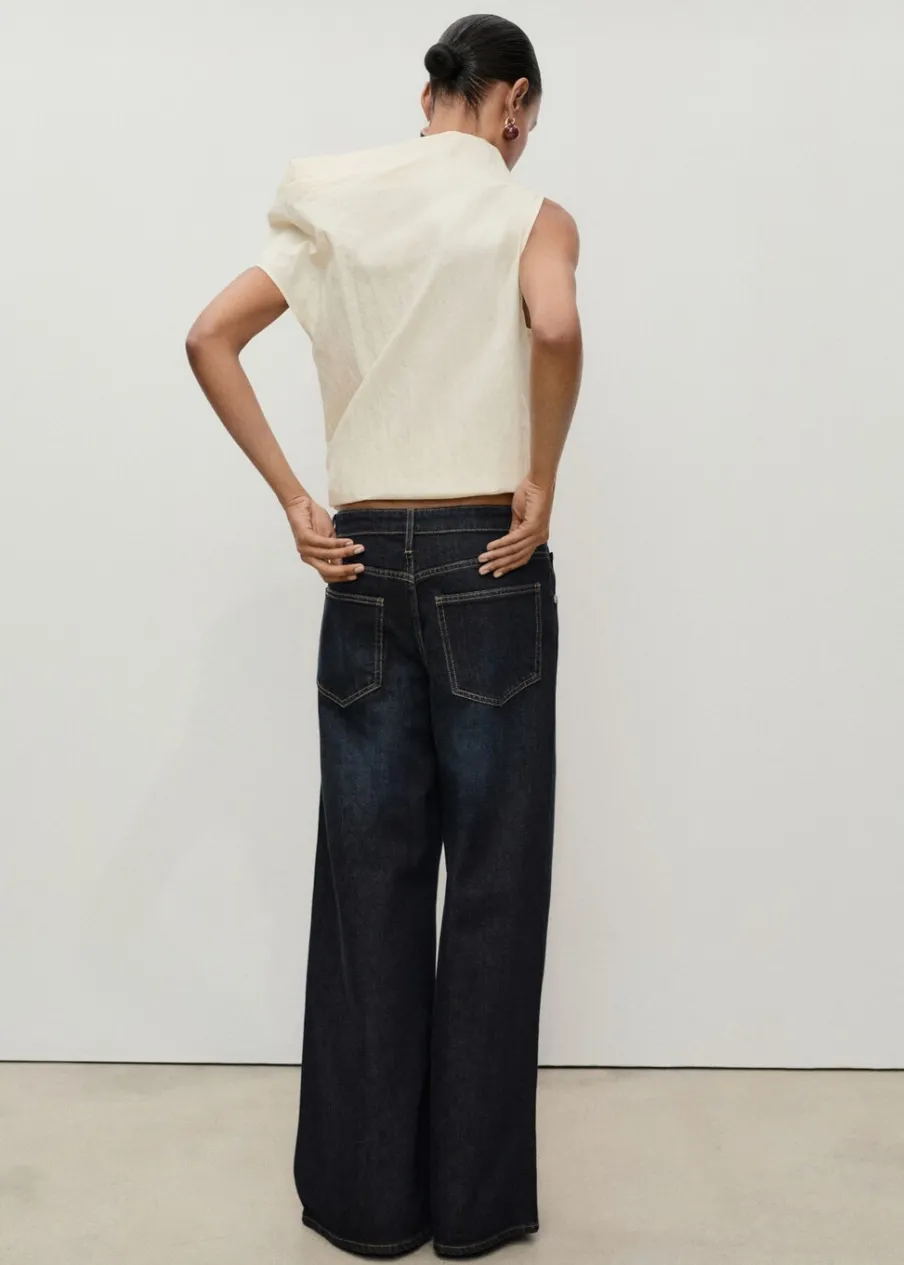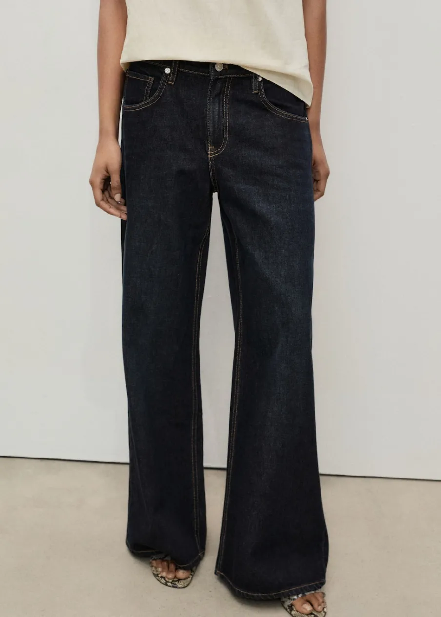 Tkanina bawełniana w dżinsowym stylu. Rinse wash. Model długi. Fason wideleg. Niski stan. Szlufki. Pięć kieszeni. Zapięcie na zamek i guzik z przodu. Modelka ma 179 cm wzrostu i nosi rozmiar S/36. Długość wewnętrzna 80,5 cm.