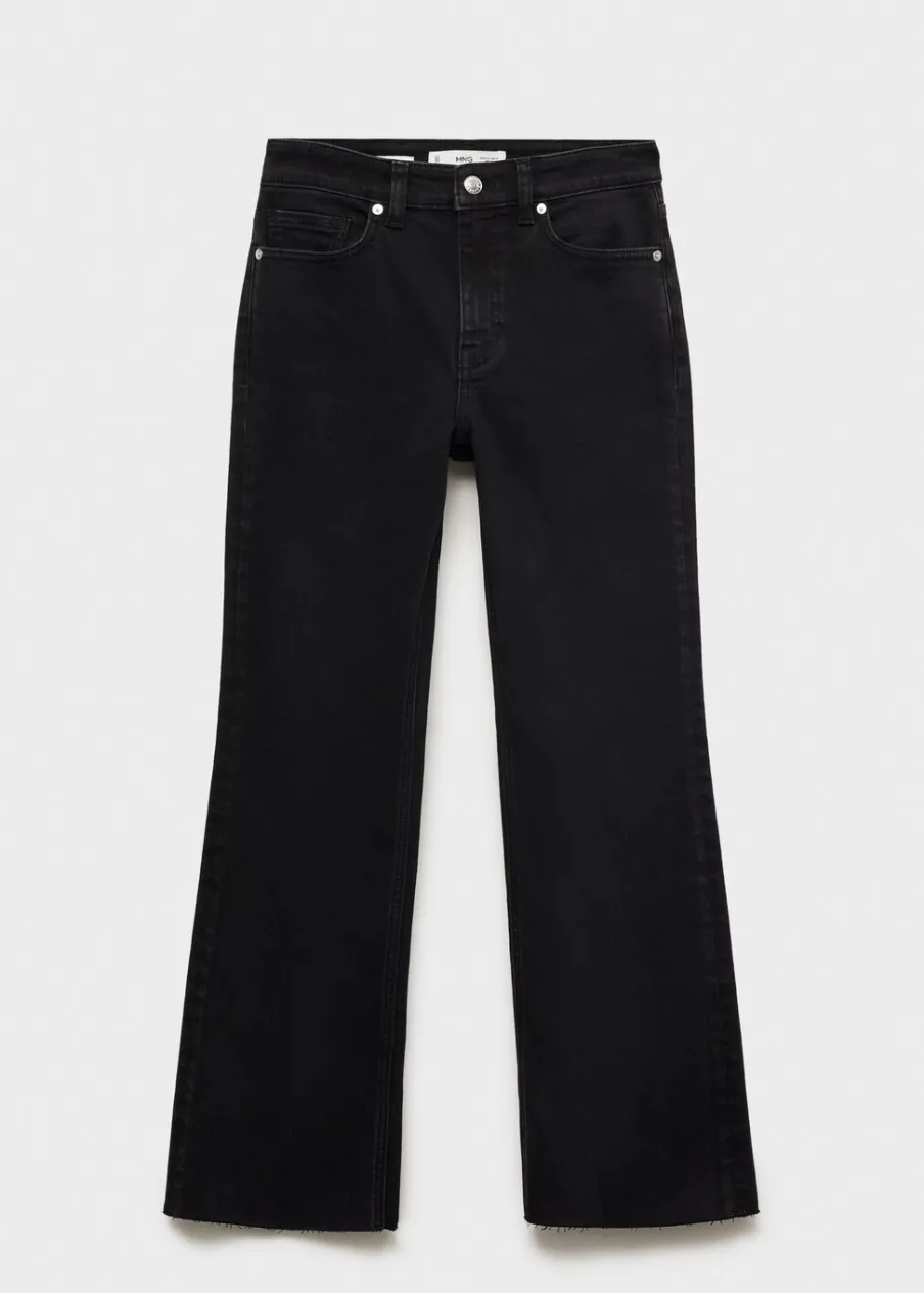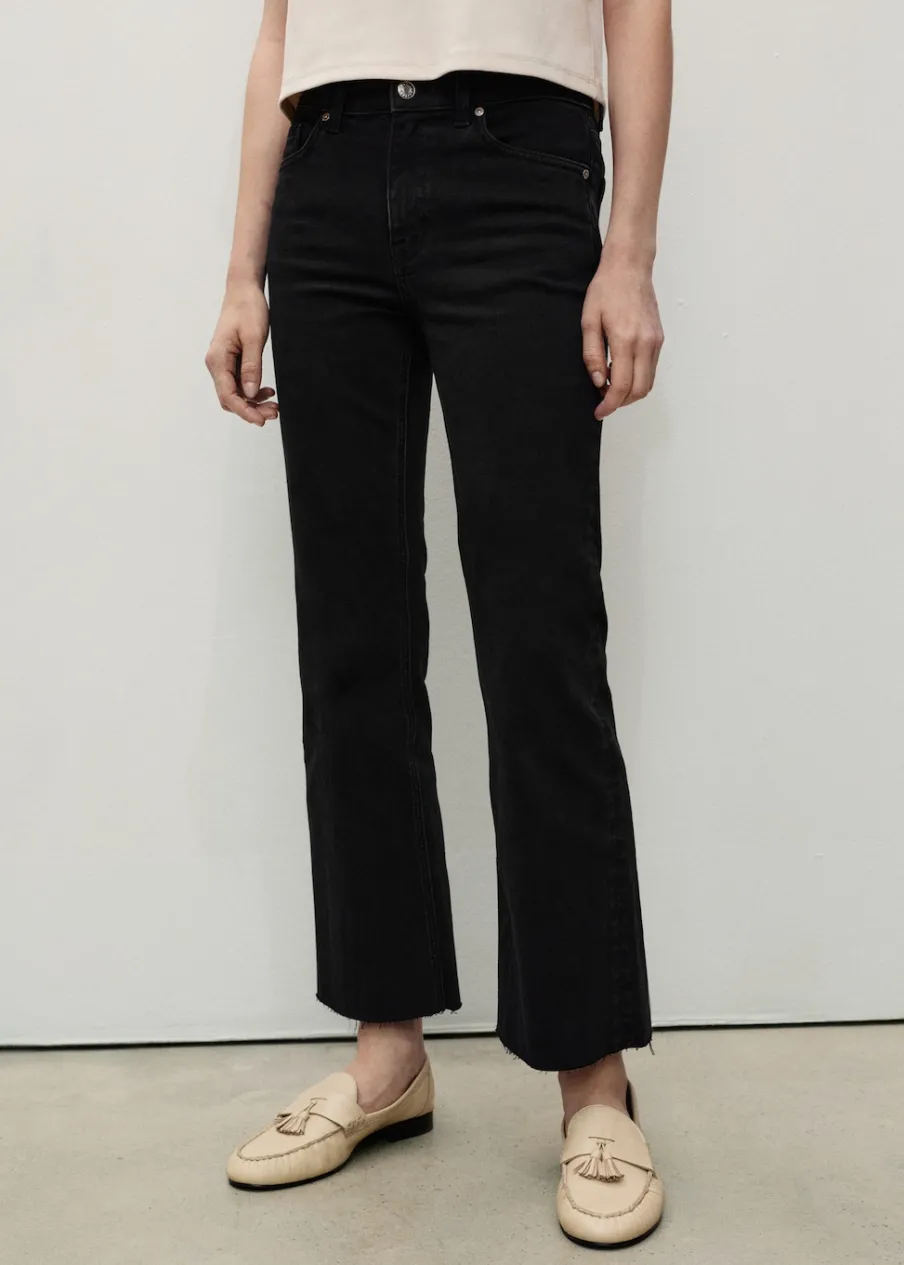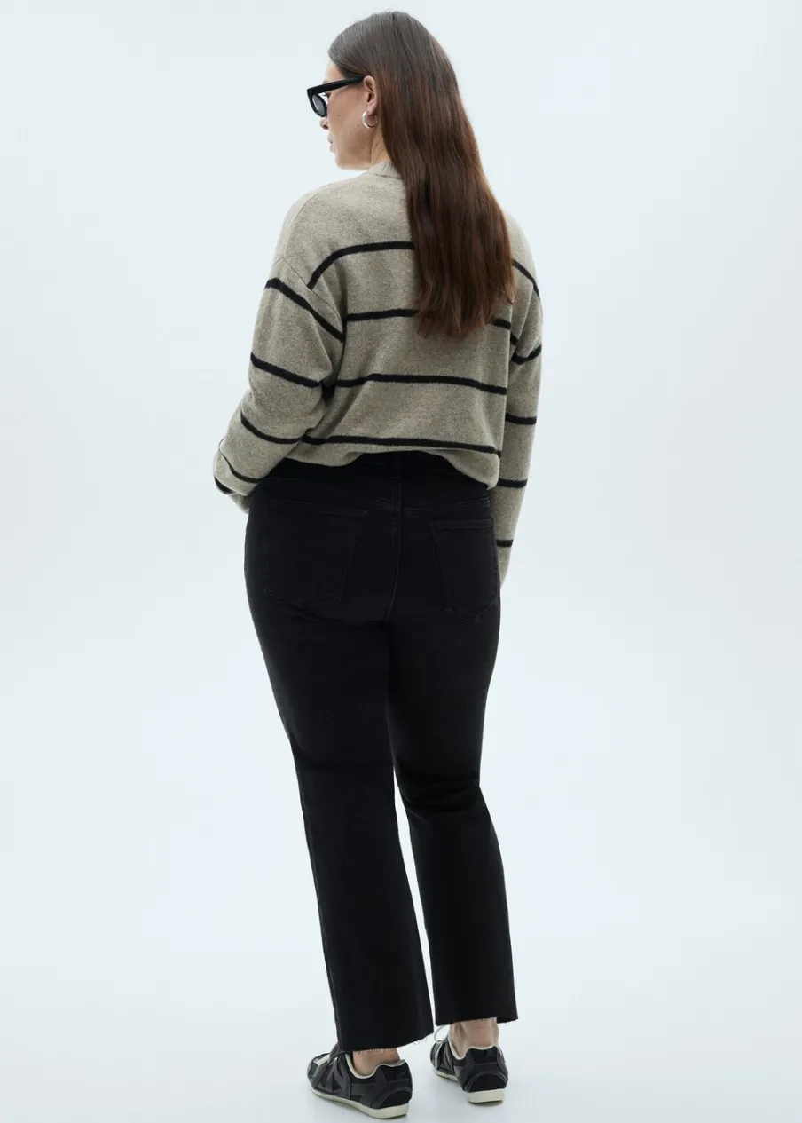 Tkanina bawełniana w dżinsowym stylu. Tkanina mieszana z bawełną z recyklingu. Elastyczna tkanina. Styl flare. Deseń crop. Podwyższony stan. Szlufki. Pięć kieszeni. Zapięcie na suwak i guzik. Postrzępione nogawki. Długość wewnętrzna 65 cm. Dostępne w Plus Size. Modelka ma 179 cm wzrostu i nosi rozmiar S/36.
