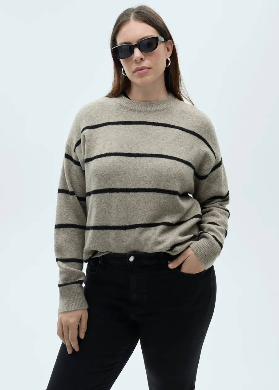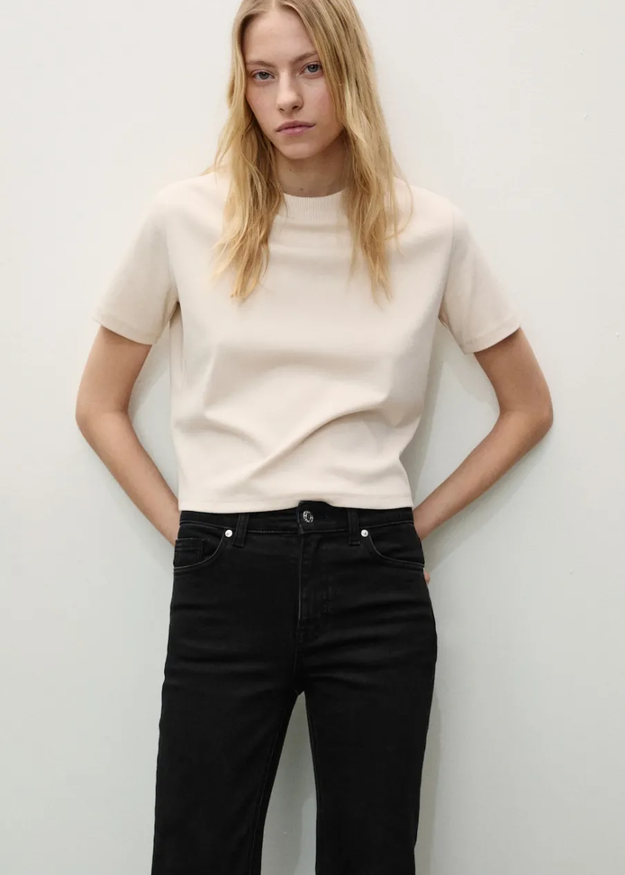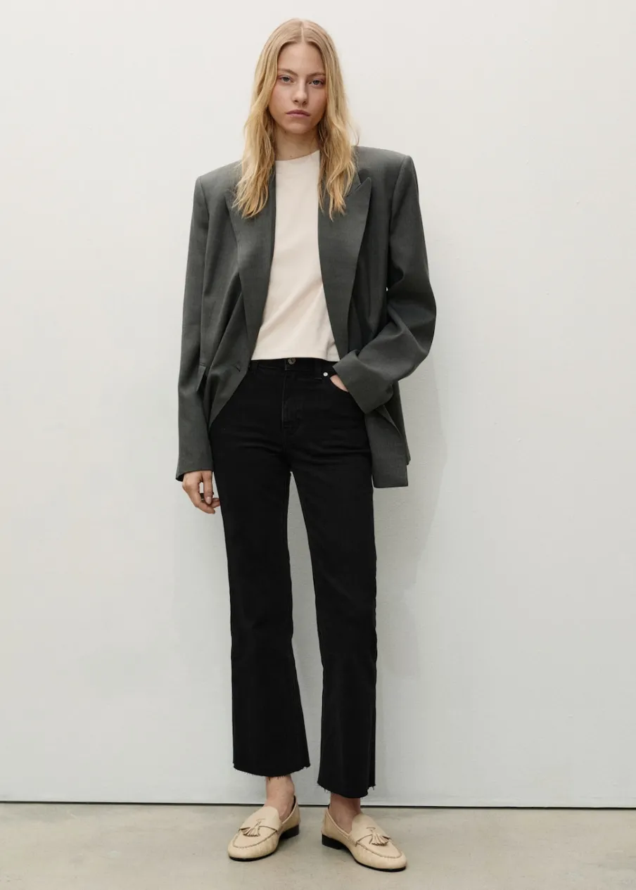 Tkanina bawełniana w dżinsowym stylu. Tkanina mieszana z bawełną z recyklingu. Elastyczna tkanina. Styl flare. Deseń crop. Podwyższony stan. Szlufki. Pięć kieszeni. Zapięcie na suwak i guzik. Postrzępione nogawki. Długość wewnętrzna 65 cm. Dostępne w Plus Size. Modelka ma 179 cm wzrostu i nosi rozmiar S/36.