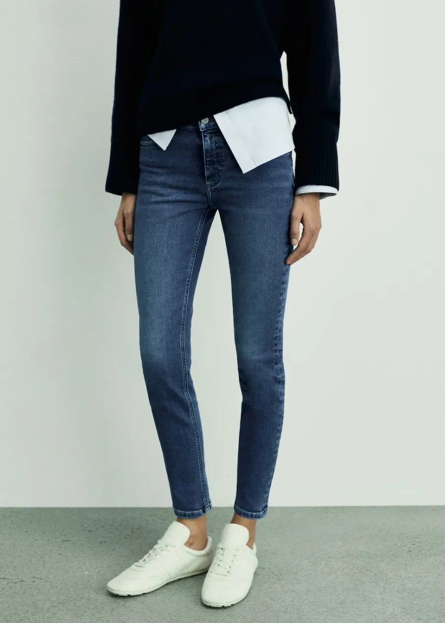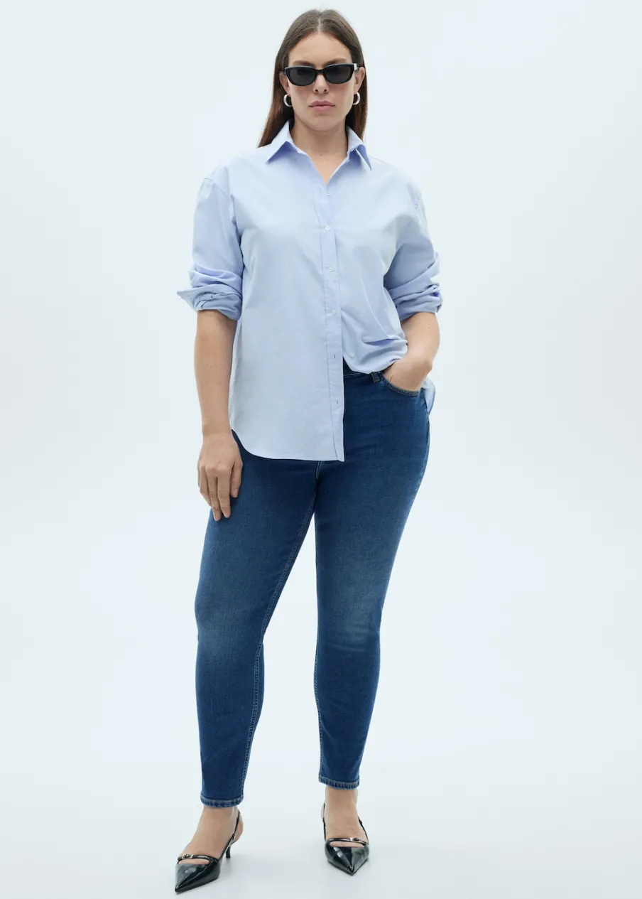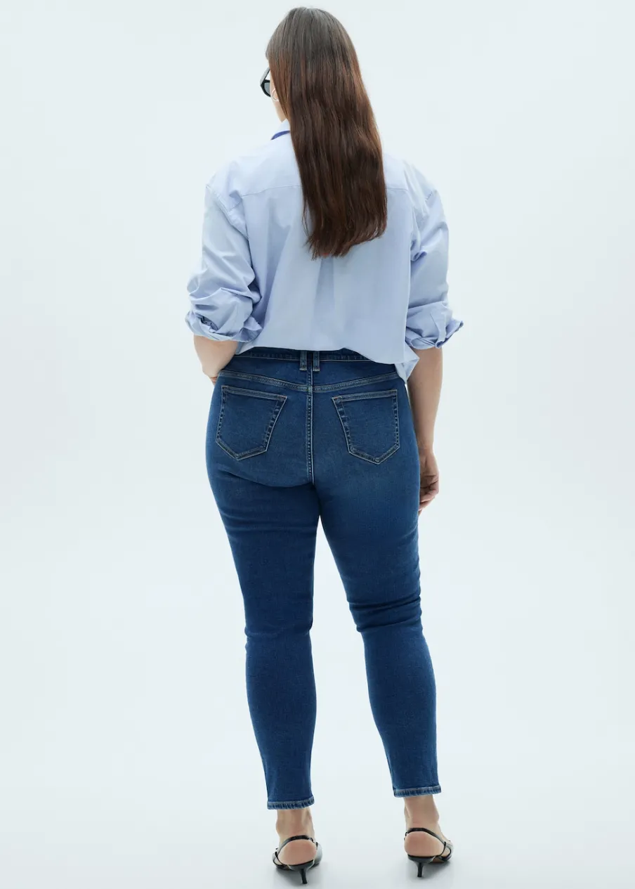 Tkanina bawełniana w dżinsowym stylu. Średnia wielkość. Średni stan. Krój skinny. Model długi. Pięć kieszeni. Szlufki. Zapięcie na suwak i guzik. Ankle brace. Dostępne w Plus Size. Modelka ma 179 cm wzrostu i nosi rozmiar S/36. Długość wewnętrzna 68 cm.
