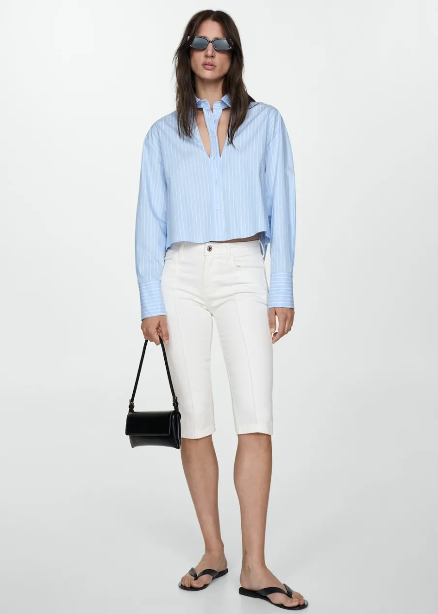 Tkanina bawełniana w dżinsowym stylu. Fason capri. Krój skinny. Średni stan. Szlufki. Dwie kieszenie z przodu. Dwie kieszenie nakładane z tyłu. Zapięcie na suwak i guzik. Ozdobne szwy. Sezon festiwalowy. Długość wewnętrzna 42,5 cm.