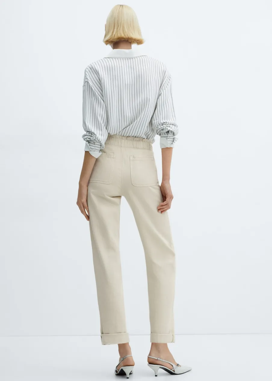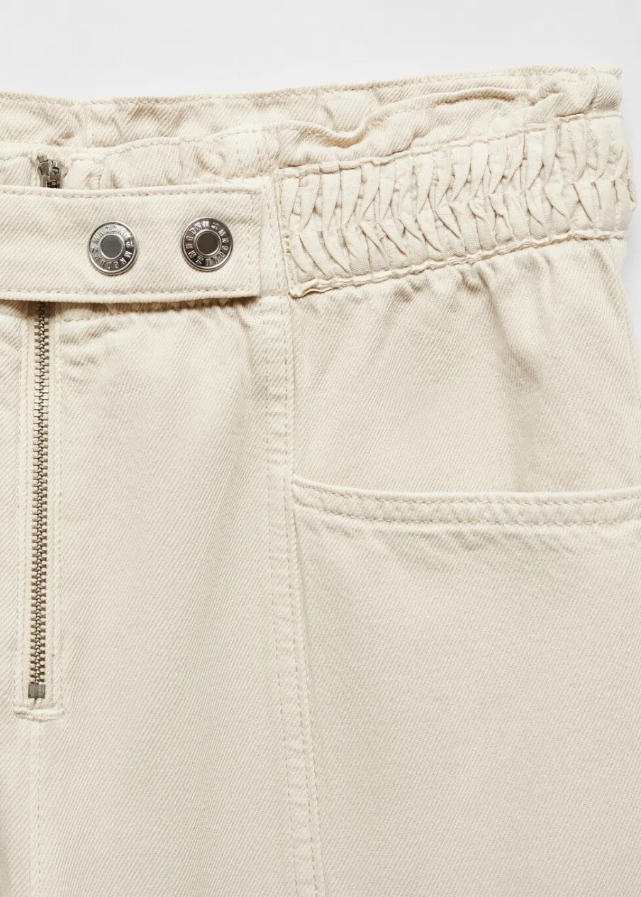 Tkanina bawełniana w dżinsowym stylu. Deseń crop. Fason slouchy. Podwyższony stan. Elastyczny pas. Dwie kieszenie z przodu. Nakładana kieszeń z tyłu. Zapięcie na suwak i zatrzaskowe guziki. Długość wewnętrzna 70 cm.
