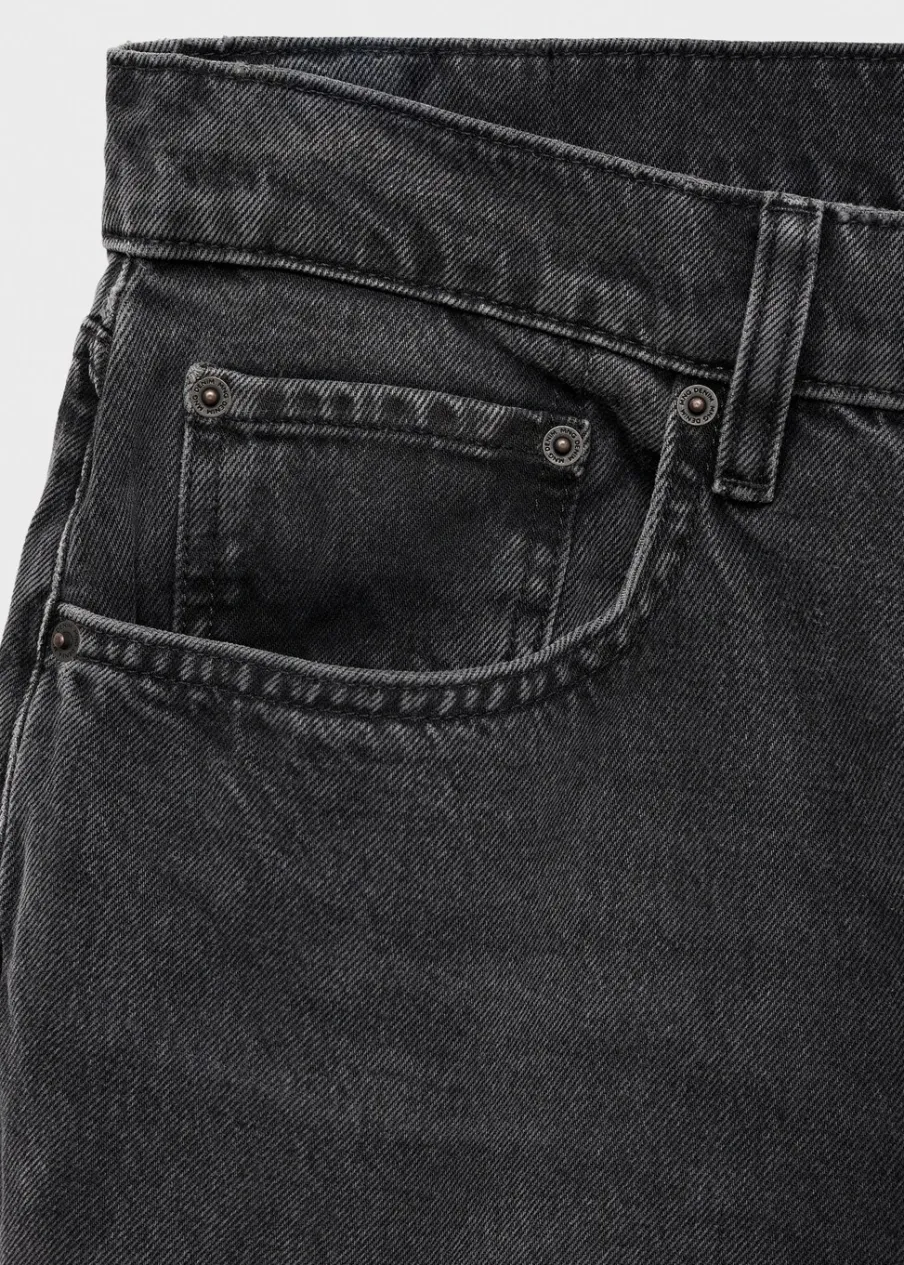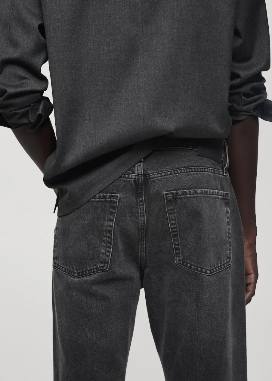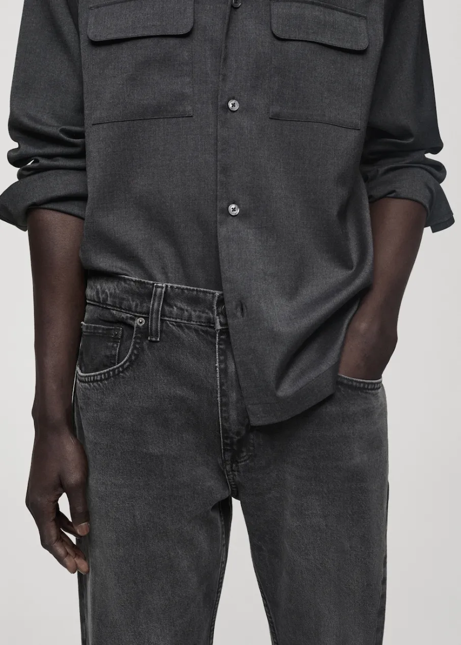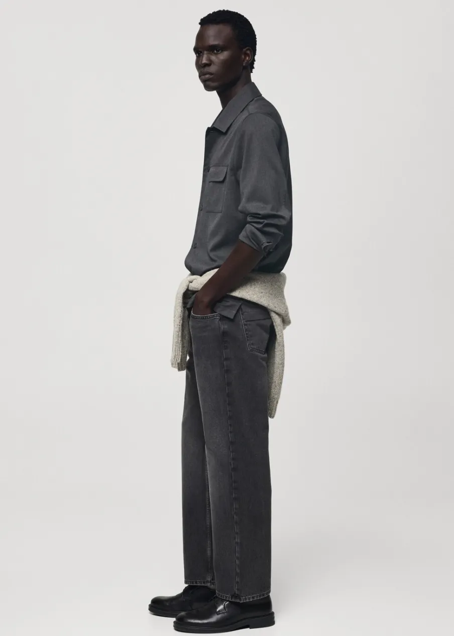 Straight-fit. Kolor ciemnoszary z efektem sprania. Bawełna 100%. Szlufki na pasek. Dwie kieszenie z przodu. Kieszonka na monety na wysokości biodra. Dwie kieszenie nakładane z tyłu. Model ma 190 cm wzrostu i nosi rozmiar 42. Zapięcie na zamek i guzik z przodu.